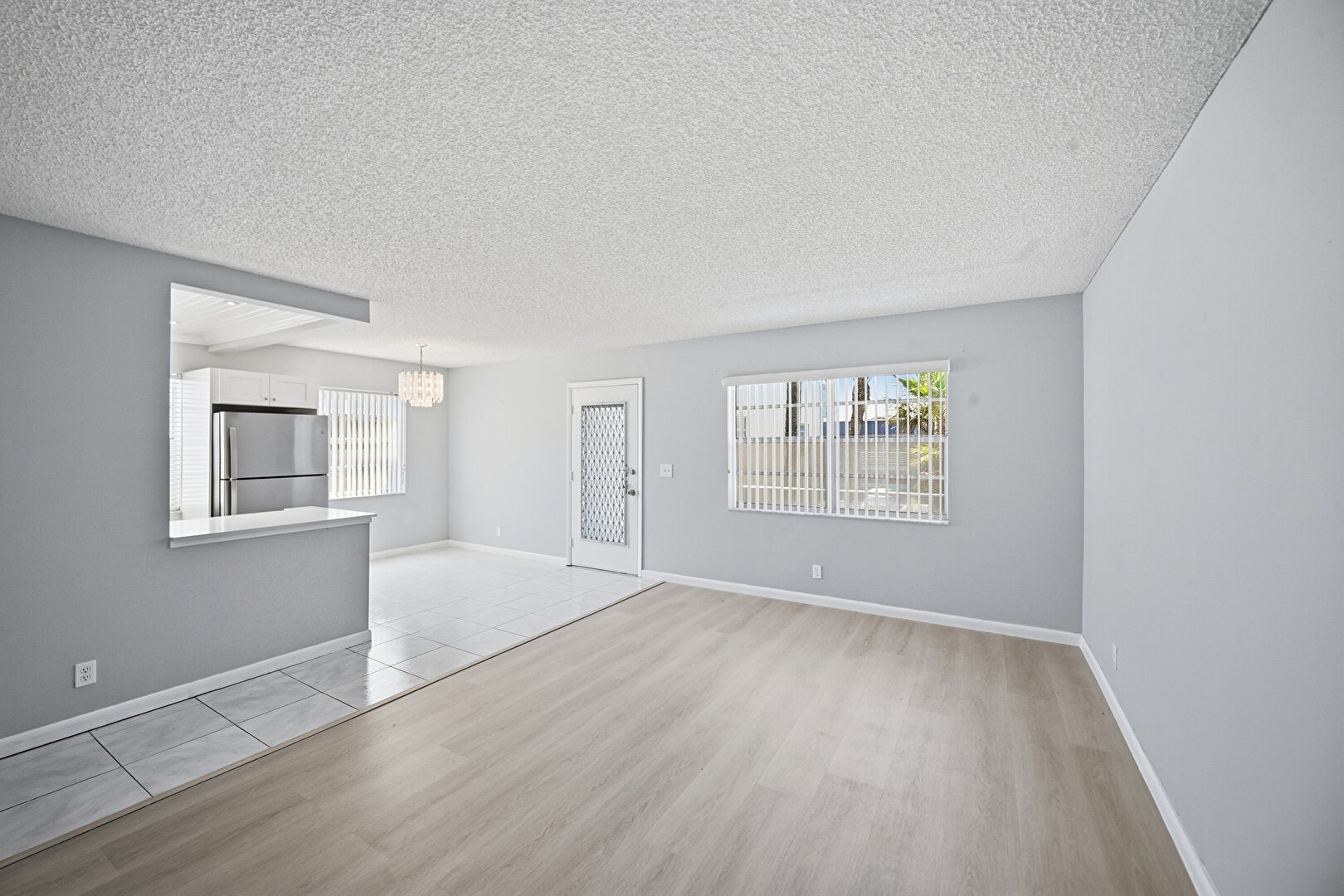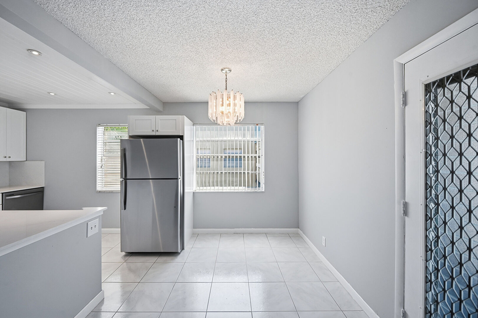 Baseboards Wall, Beamed Ceiling, Drywall, Natural Light, Pendant Lighting, Shaker Cabinets, Stone Countertops, Textured Ceiling, Tile Floor, Notable Chandelier