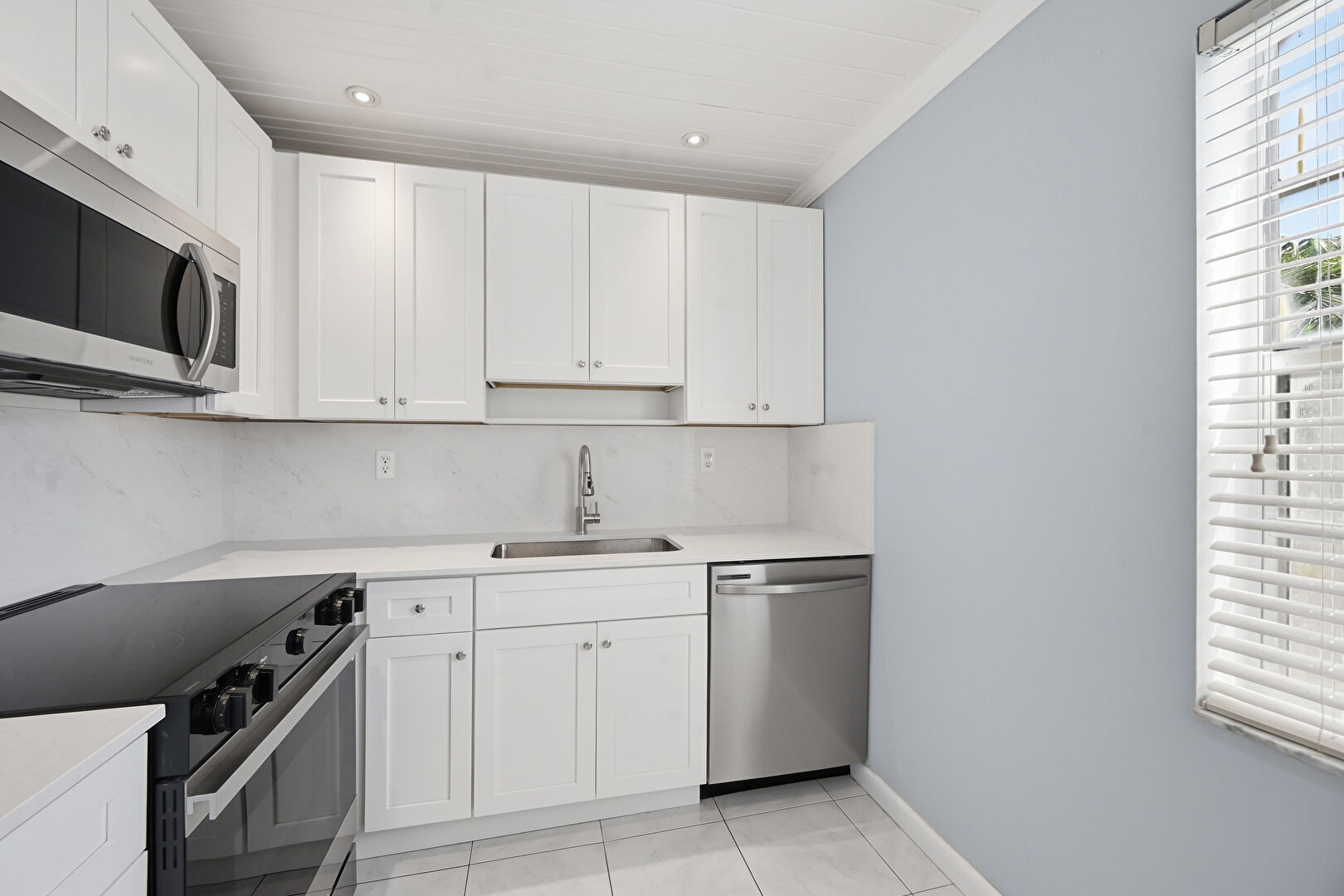 Baseboards Wall, Crown Molding, Drywall, Kitchen Peninsula, Natural Light, Recessed Lighting, Shaker Cabinets, Stone Countertops, Textured Ceiling, Tile Floor, Vent, Drywall, Shaker Cabinets