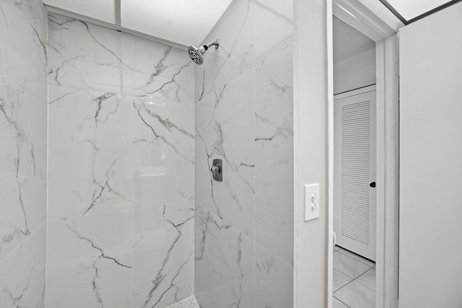 Combined Bath Shower, Drywall, Full Bathroom, Marble Finish Floor, Vanity, Natural Light