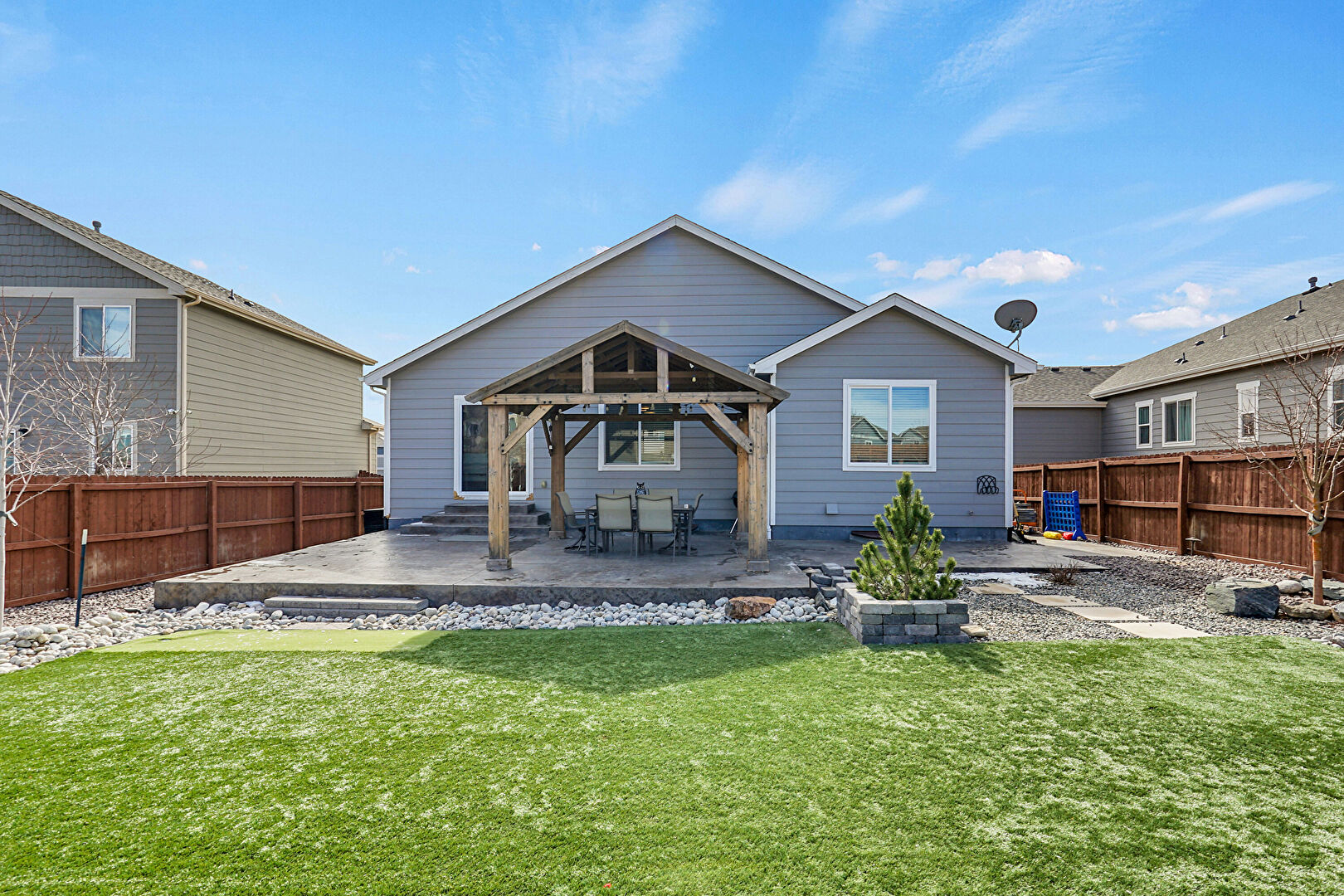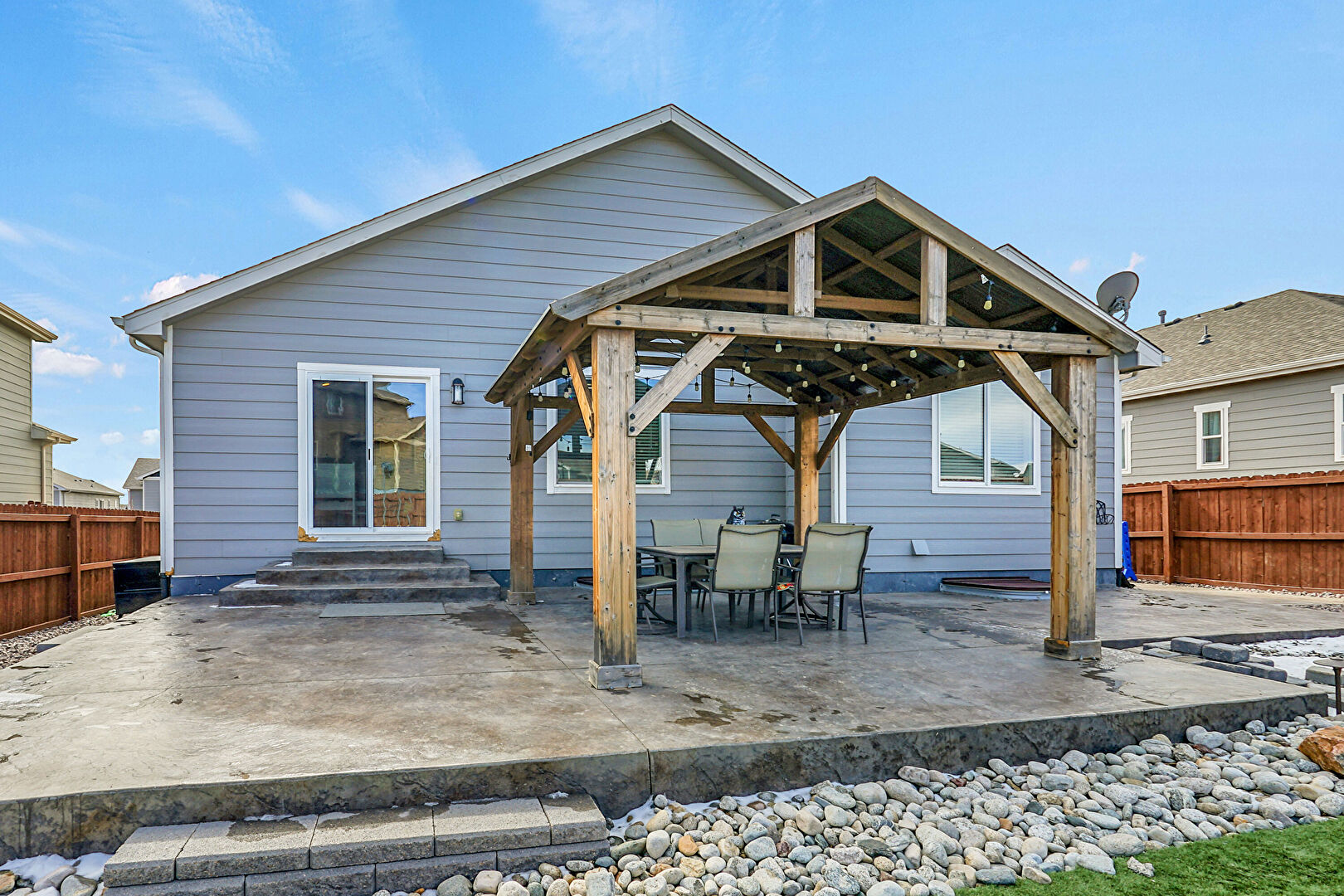 Concrete Foundation, Entry Steps, Fence, Gazebo, Horizontal Siding, Lawn, Outdoor Dining Area, Patio, Satellite Dish, Fence, Horizontal Siding, Patio, Residential View