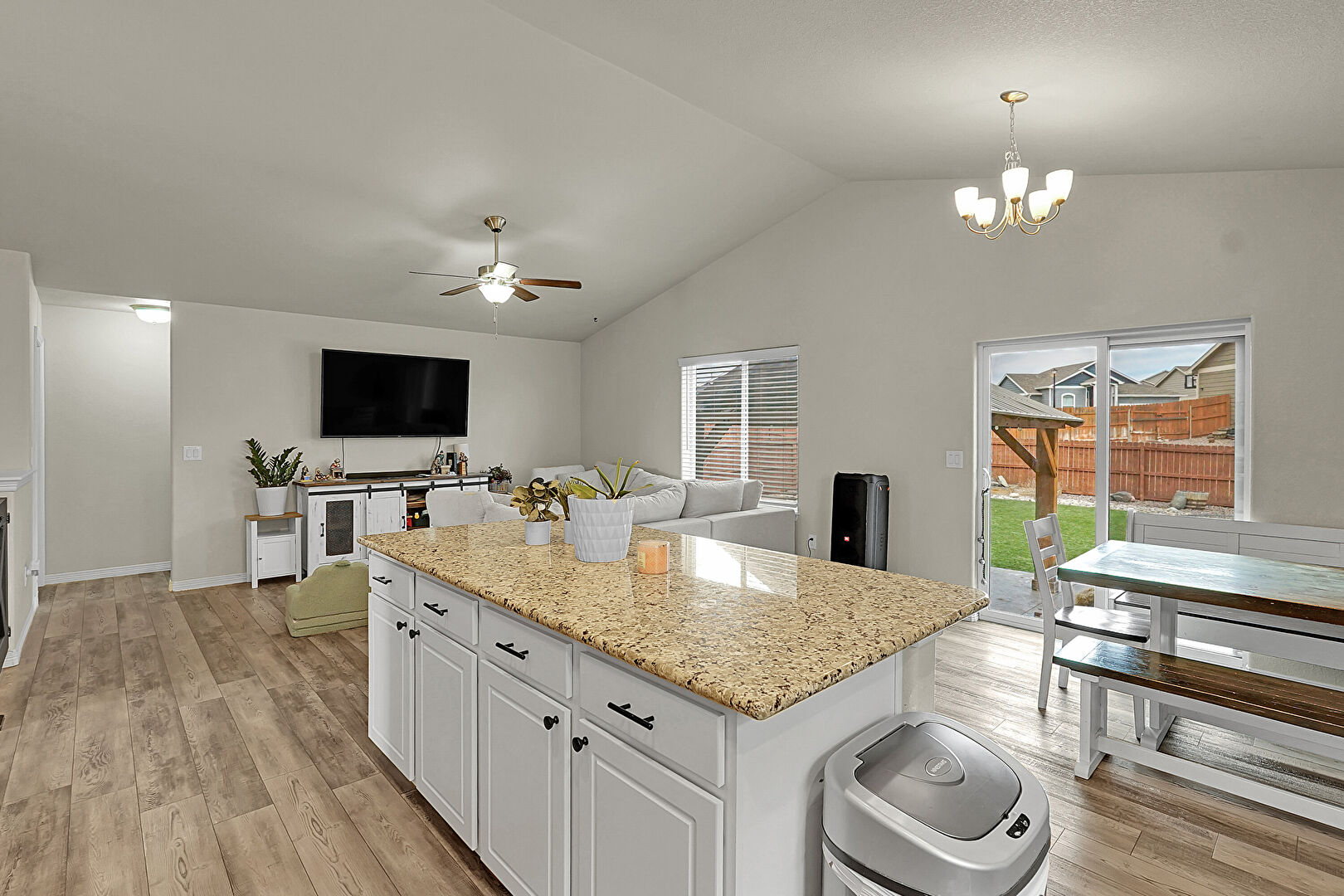 Baseboards Wall, Cathedral Ceiling, Ceiling Fan, Crown Molding Cabinets, Drywall, Kitchen Island, Kitchen Peninsula, Natural Light, Notable Chandelier, Opens To Living Area, Pendant Lighting, Raised Cabinets, Recessed Lighting, Stone Countertops, Vaulted Ceiling, Wood Finish Floor, Crown Molding Cabinets, Raised Cabinets, Stone Countertops