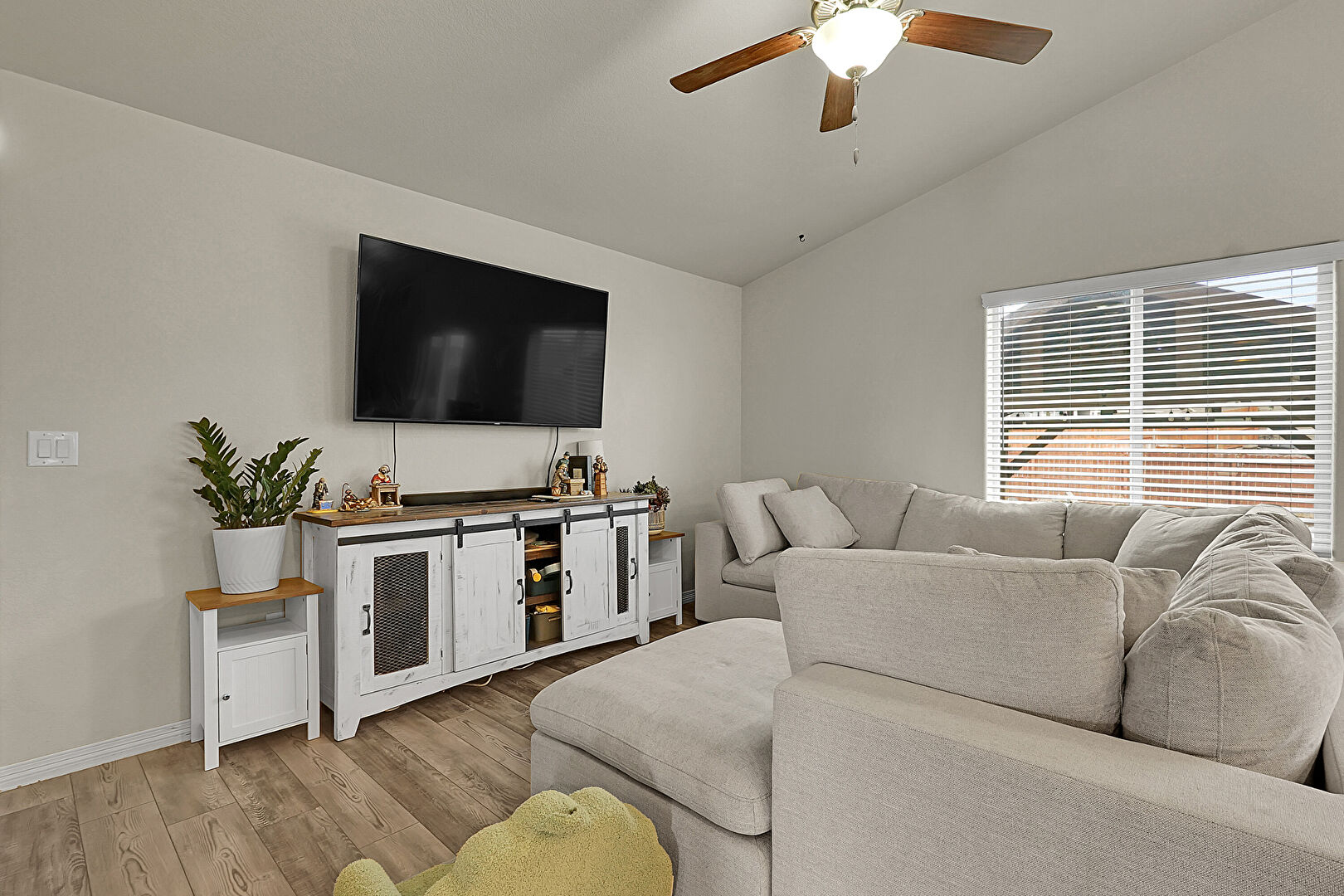 Baseboards Wall, Ceiling Fan, Drywall, Natural Light, Vaulted Ceiling, Vent, Wood Finish Floor, Ceiling Fan, Vaulted Ceiling, Wood Finish Floor