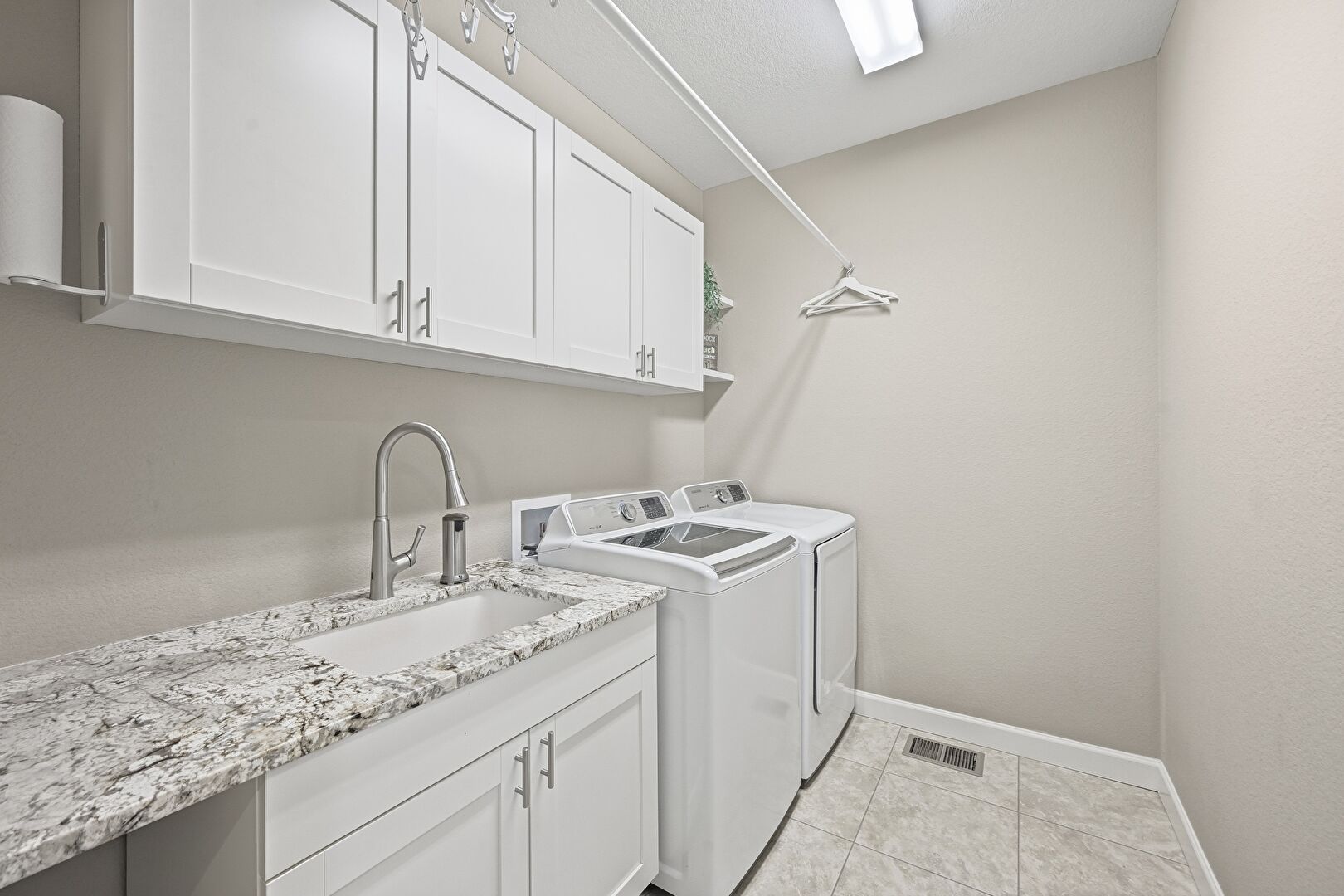 Baseboards Wall, Drywall, Laundry, Tile Floor, Vent, Washer Hookup