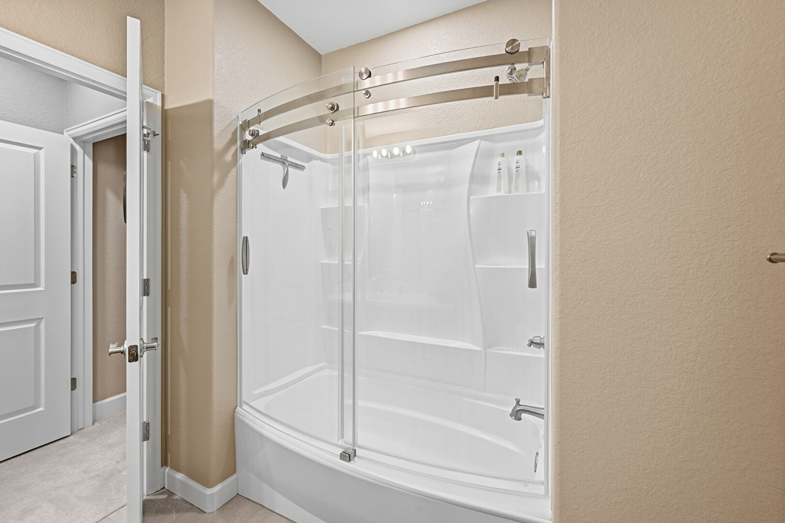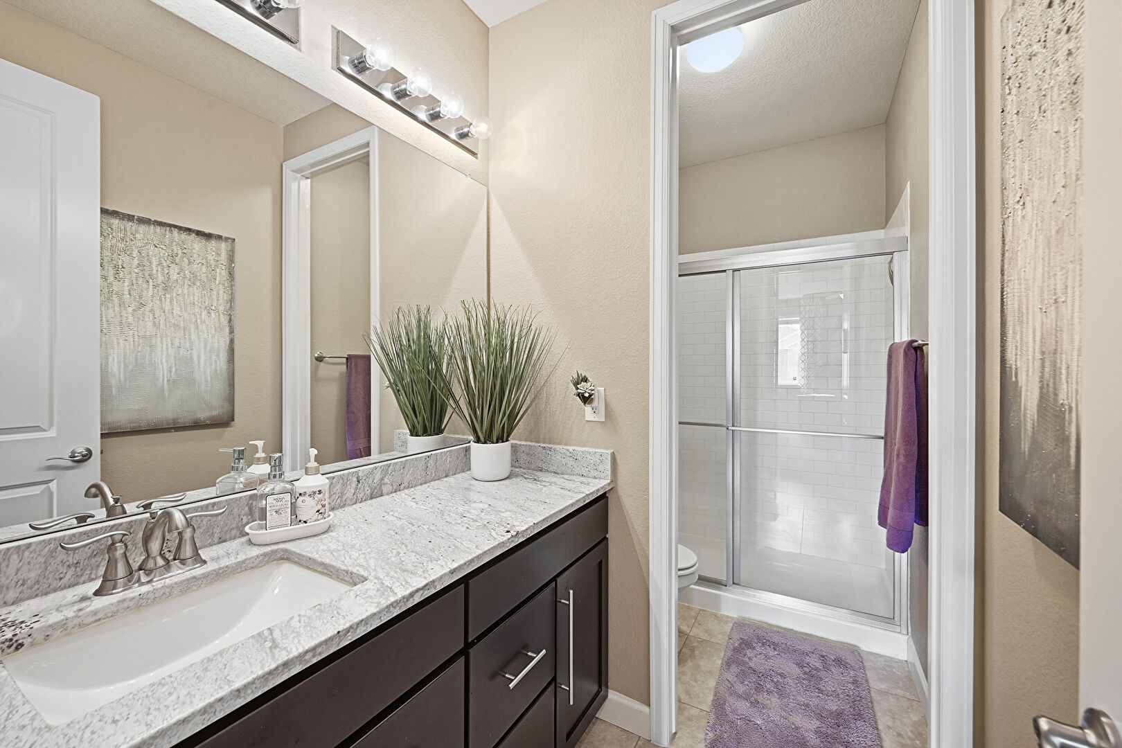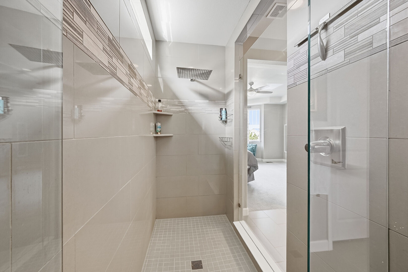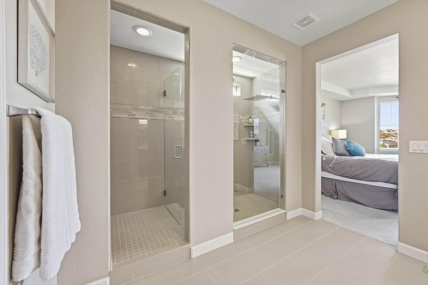 Baseboards Wall, Ceiling Fan, Double Vanity, Drywall, Ensuite Bathroom, Full Bathroom, Natural Light, Recessed Lighting, Textured Wall, Tile Floor, Vanity, Vent, Water Closet, Baseboards Wall, Combined Bath Shower, Full Bathroom, Natural Light