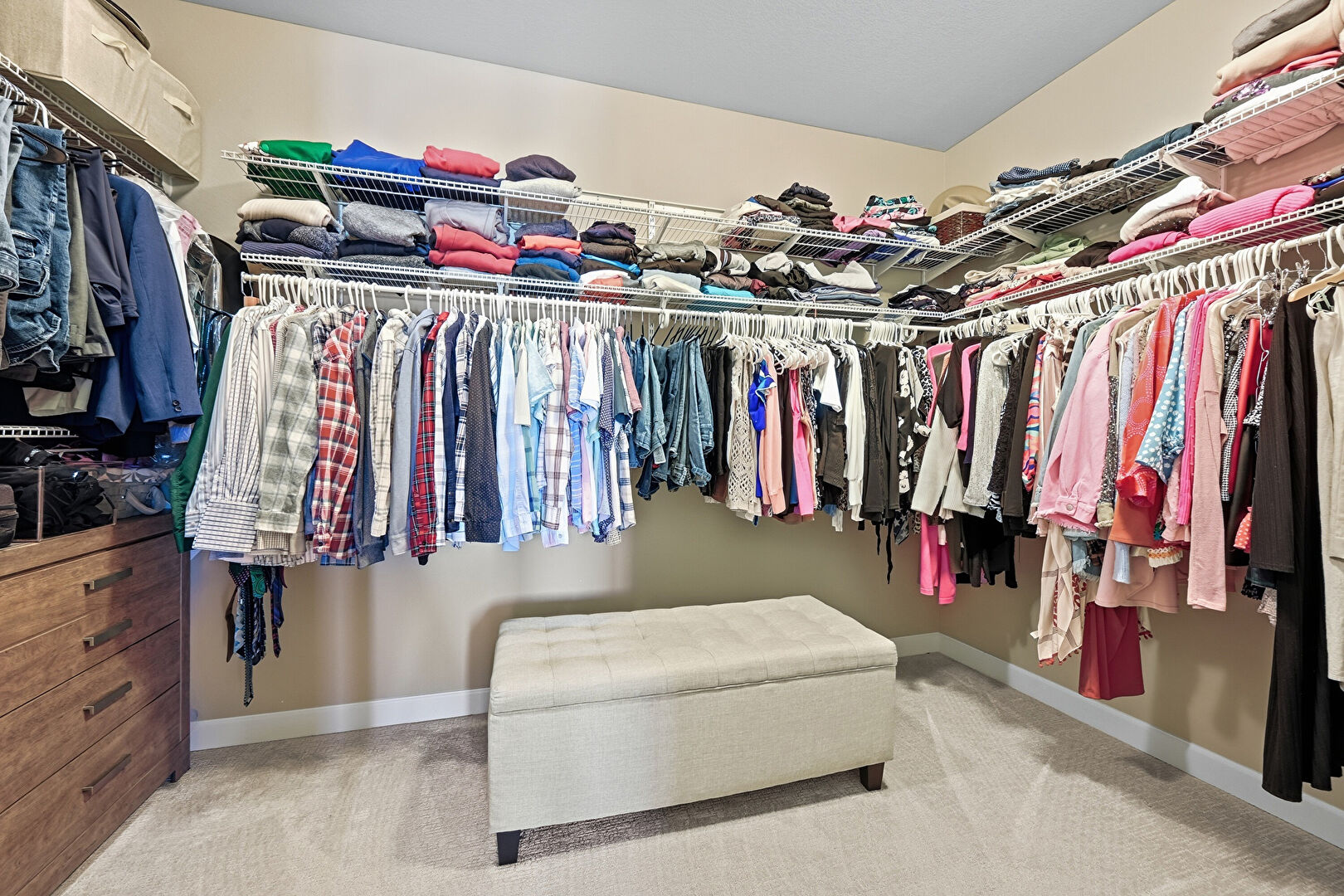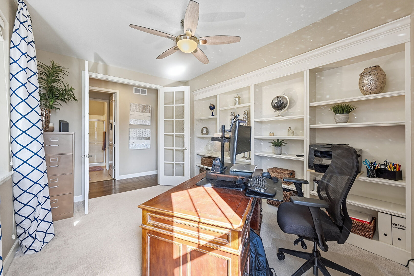 Baseboards Wall, Built In Shelves, Carpet, Ceiling Fan, Drywall, Natural Light, Office Area, Vent, Carpet, Drywall