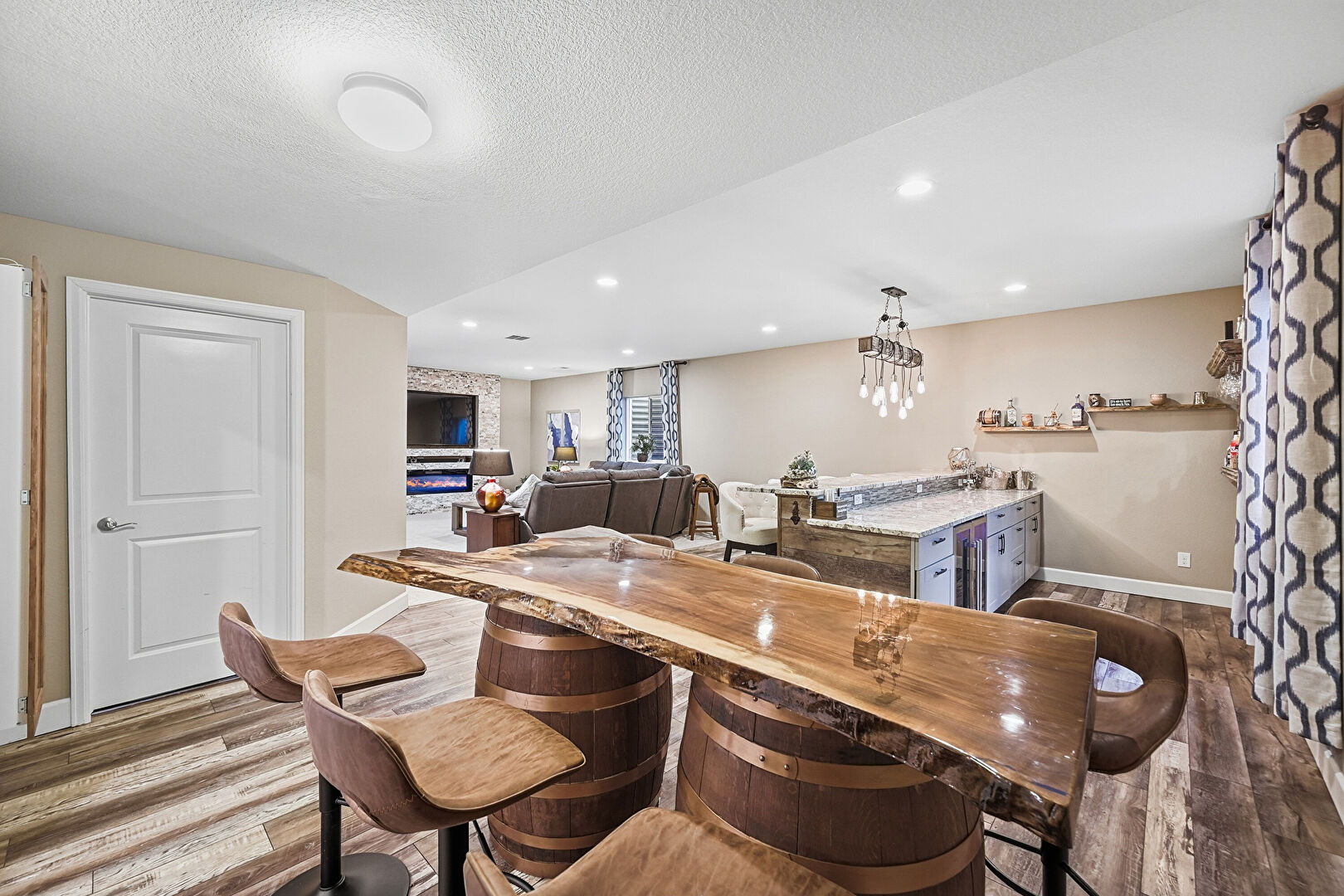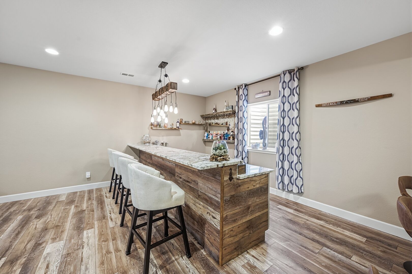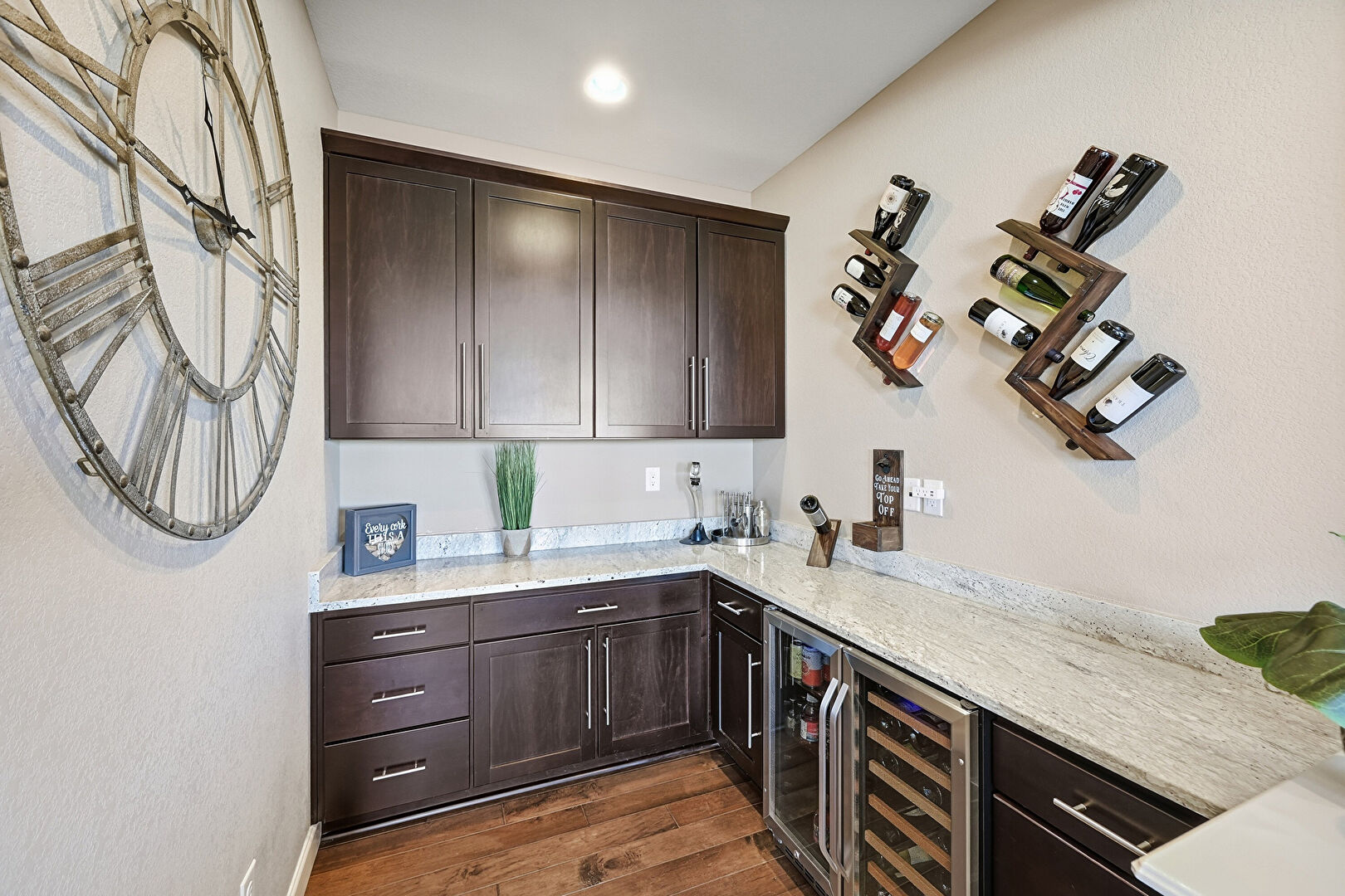 Baseboards Wall, Basement, Dark Brown Cabinets, Drywall, Indoor Bar, Natural Light, Open Shelves, Pendant Lighting, Recessed Lighting, Shaker Cabinets, Stone Countertops, Textured Ceiling, Vent, Wine Cooler, Wood Finish Floor, Butcher Block Countertops, Crown Molding Cabinets, Natural Light, Stone Countertops