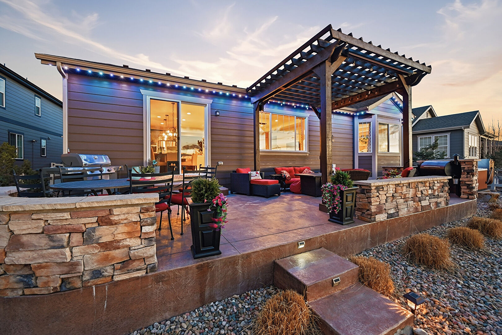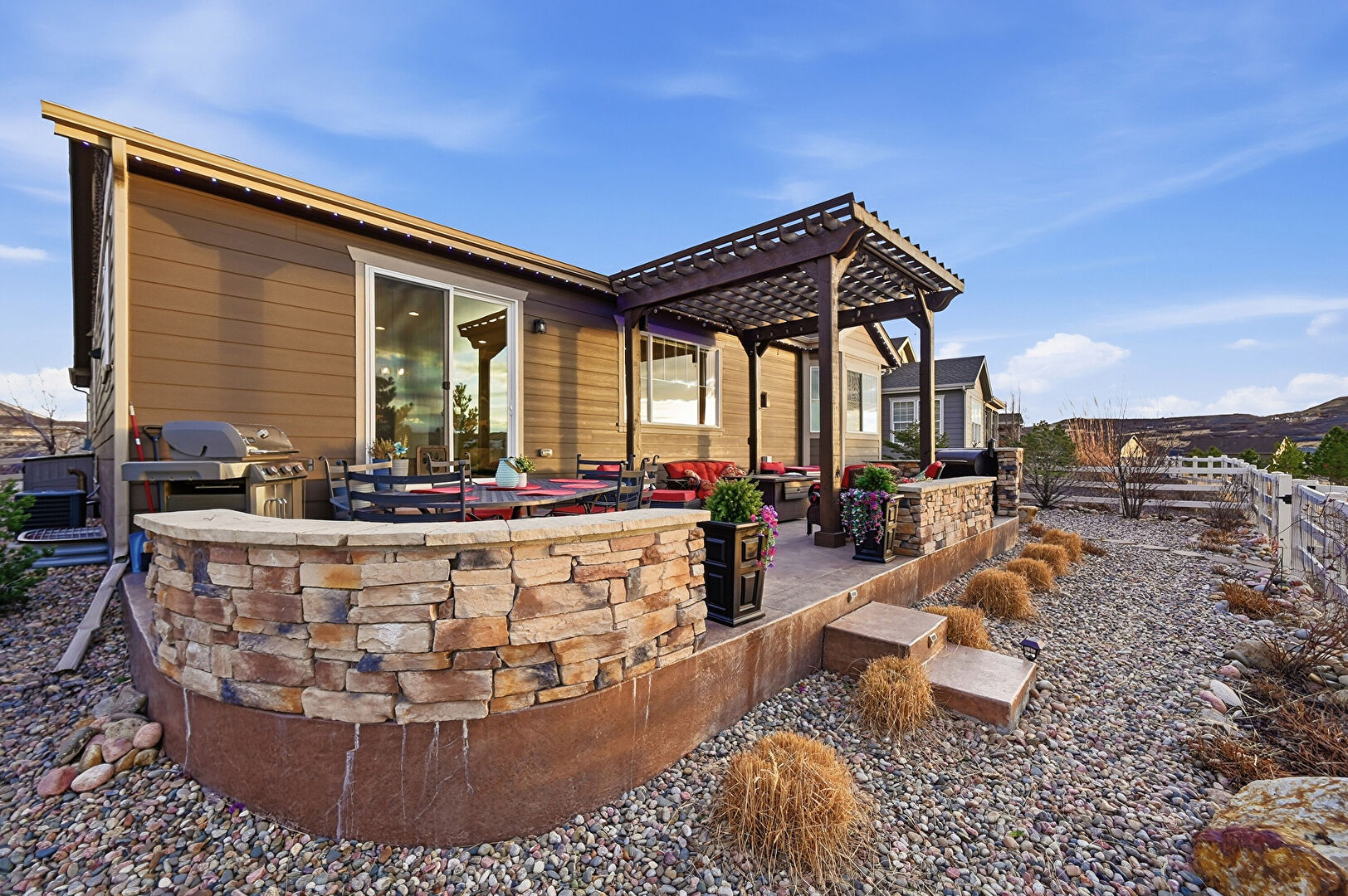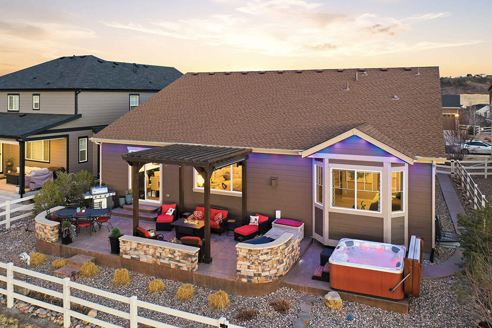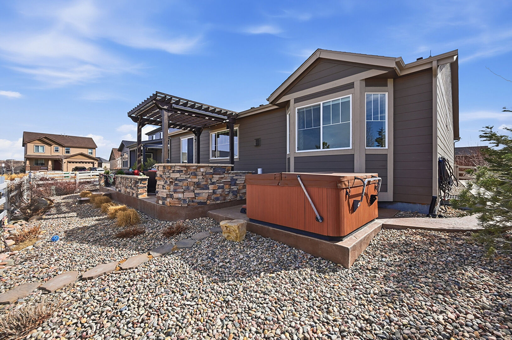 Central Ac, Concrete Foundation, Downspout, Entry Steps, Fence, Fire Pit, Gazebo, Grill, Gutters, Horizontal Siding, Hot Tub, Outdoor Kitchen, Outdoor Living Space, Patio, Pergola, Residential View, Shingle Roof, Central Ac, Concrete Foundation, Gutters, Horizontal Siding, Pergola, Shingle Roof