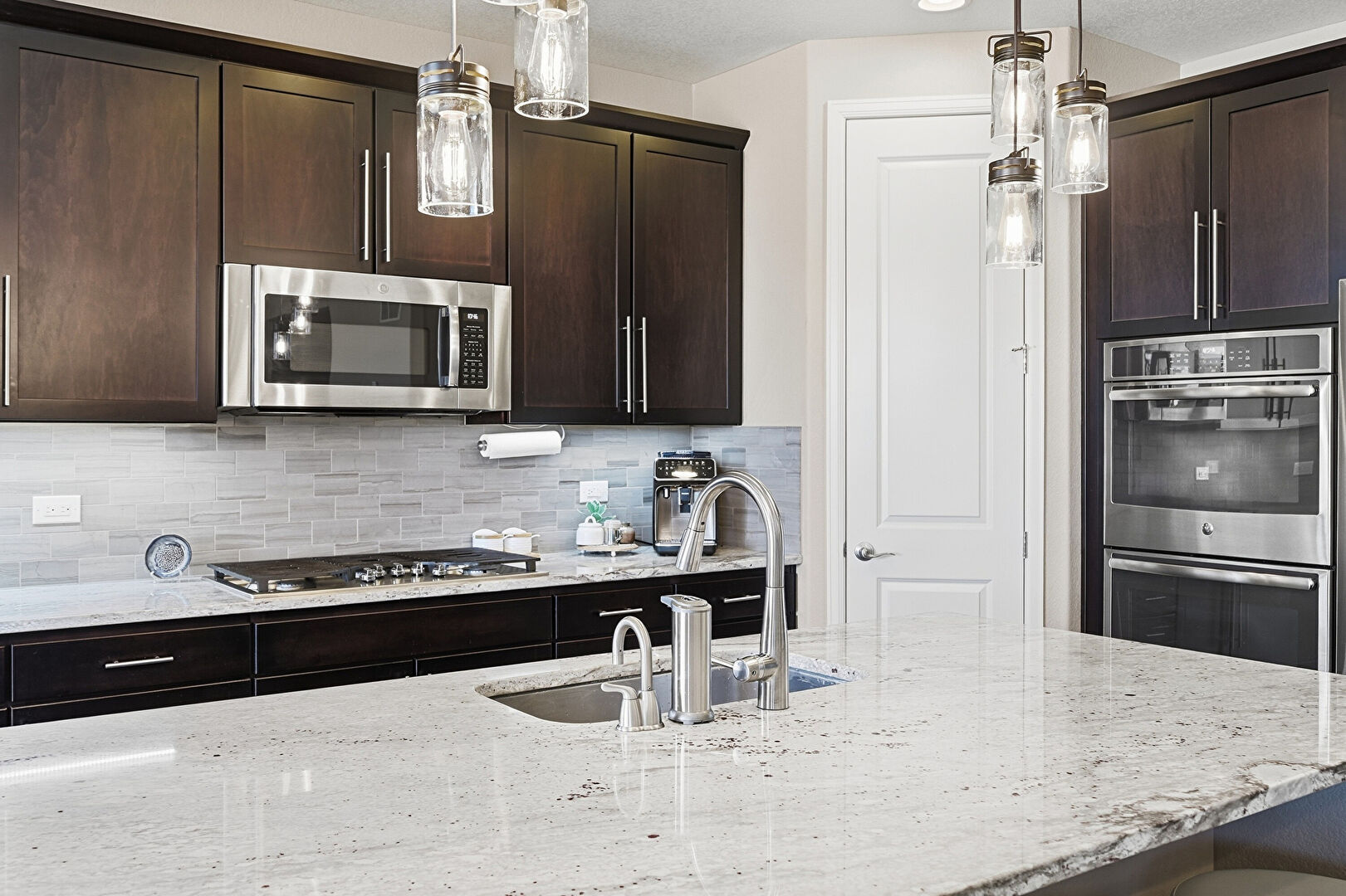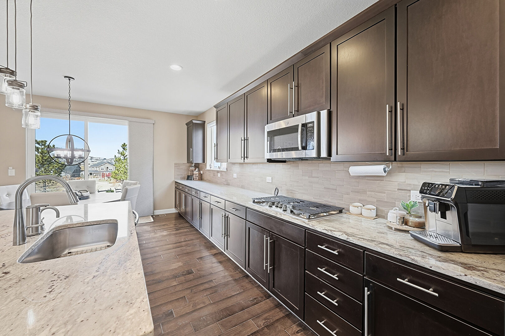 Baseboards Wall, Black Cabinets, Crown Molding Cabinets, Dark Brown Cabinets, Double Oven, Drywall, Fireplace, Gray Cabinets, Kitchen Bar, Kitchen Island, L Shaped Kitchen, Natural Light, Notable Chandelier, Opens To Living Area, Pendant Lighting, Recessed Lighting, Shaker Cabinets, Stone Countertops, Textured Ceiling, Toaster, Vent, Wood Finish Floor, Ceiling Fan, Pendant Lighting, Stone Countertops, Wine Cooler, Wood Finish Floor