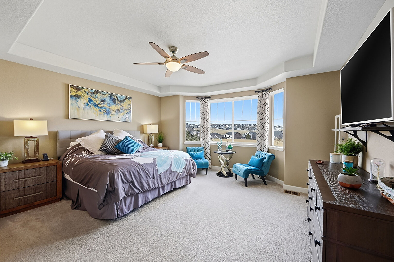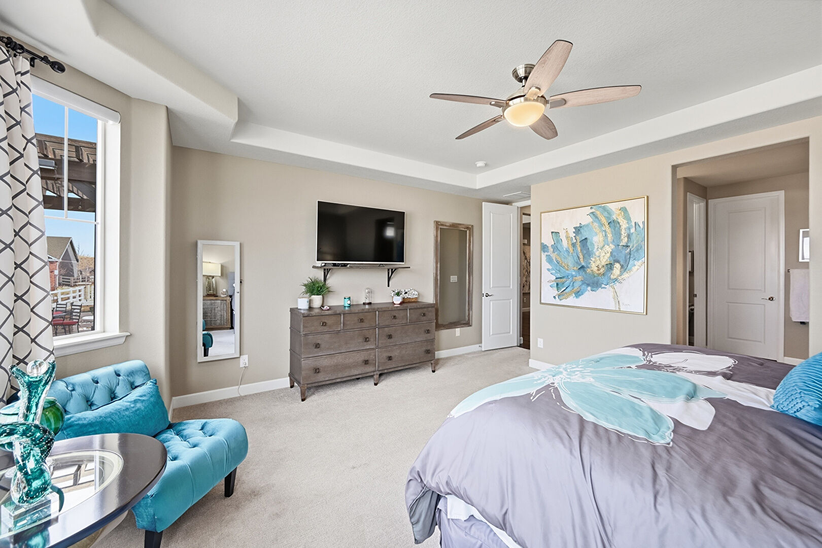 Baseboards Wall, Carpet, Ceiling Fan, Drywall, Ensuite Bathroom, Natural Light, Tray Ceiling, Vent, Baseboards Wall, Carpet, Closet, Drywall, Natural Light, Vent