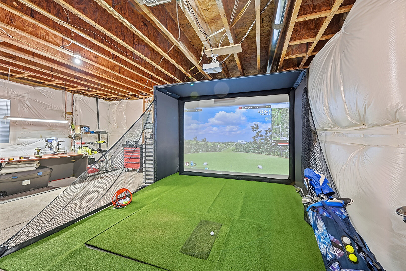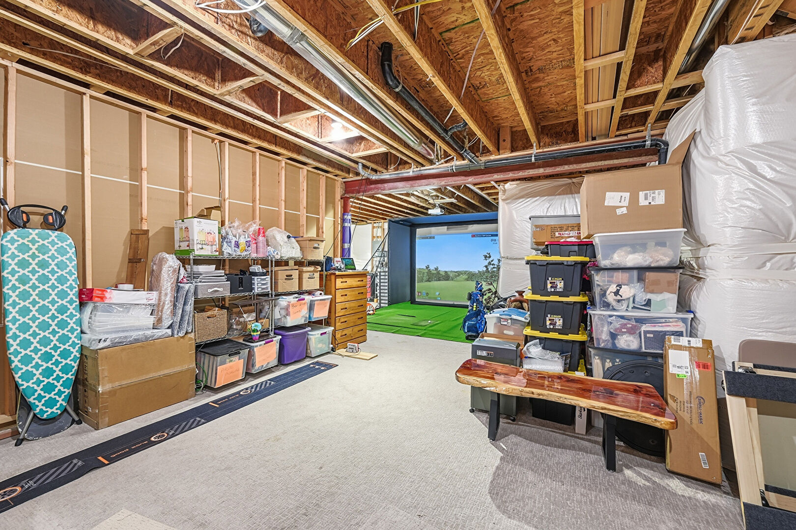 Baseboards Wall, Electric Panel, Golf Simulator, Natural Light, Textured Wall, Carpet, Natural Light