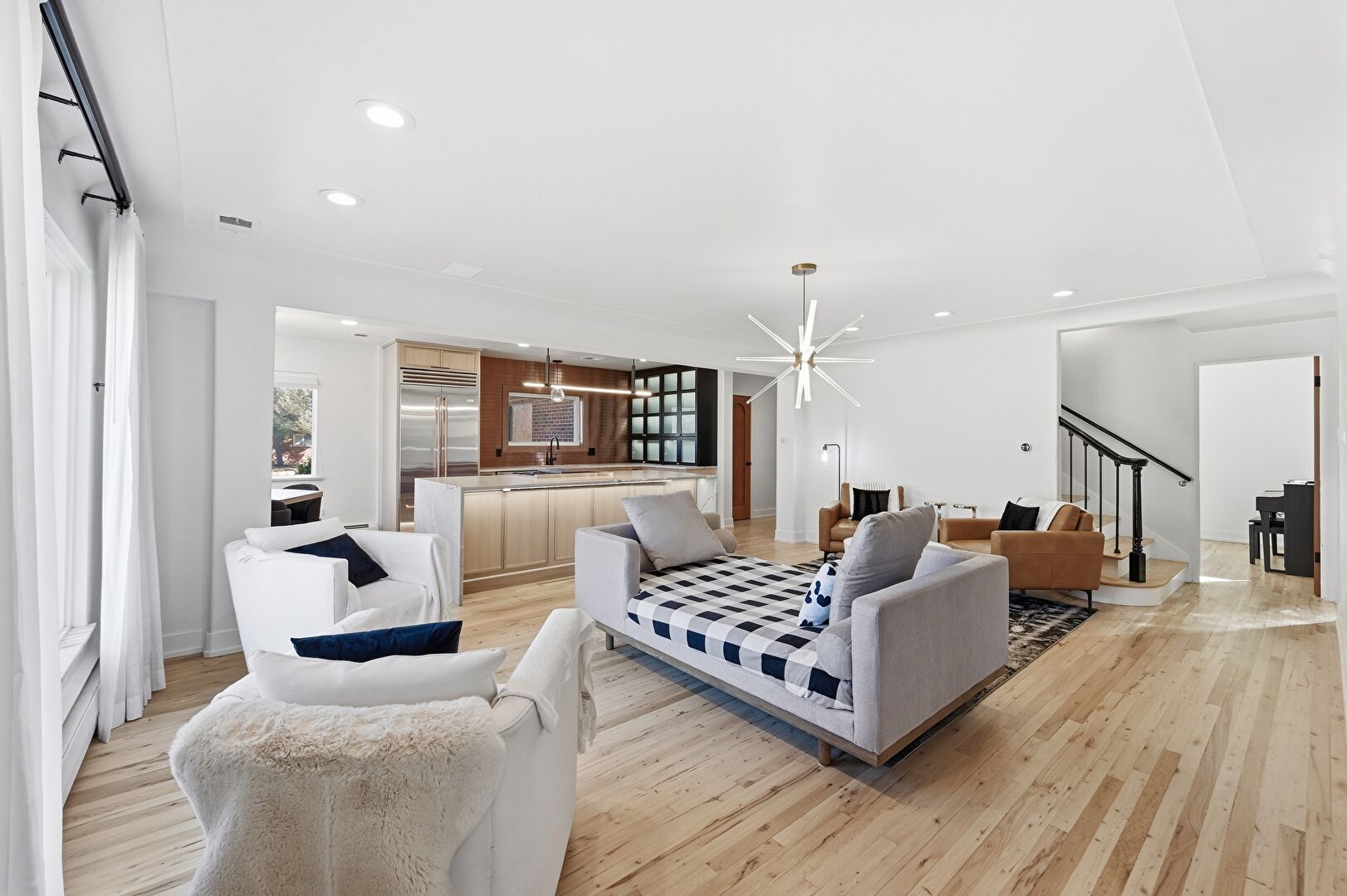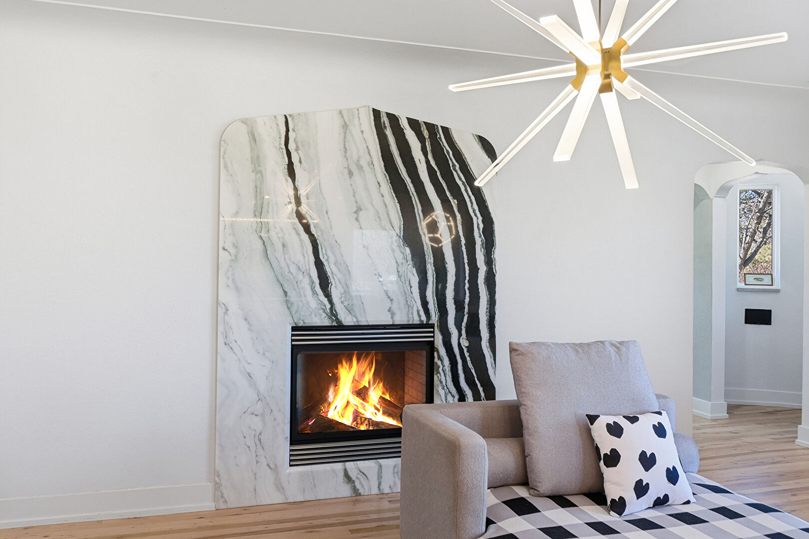 Arched Walkways, Baseboard Radiator, Baseboards Wall, Ceiling Fan, Drywall, Fireplace, Natural Light, Notable Chandelier, Recessed Lighting, Vent, Wood Finish Floor, Recessed Lighting, Stairs, Wood Finish Floor