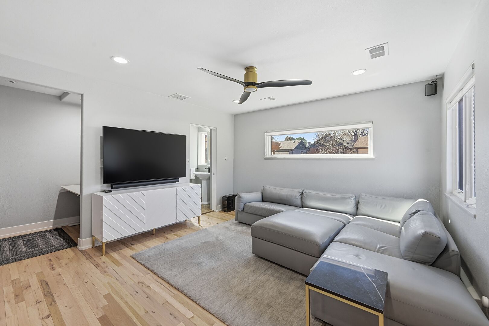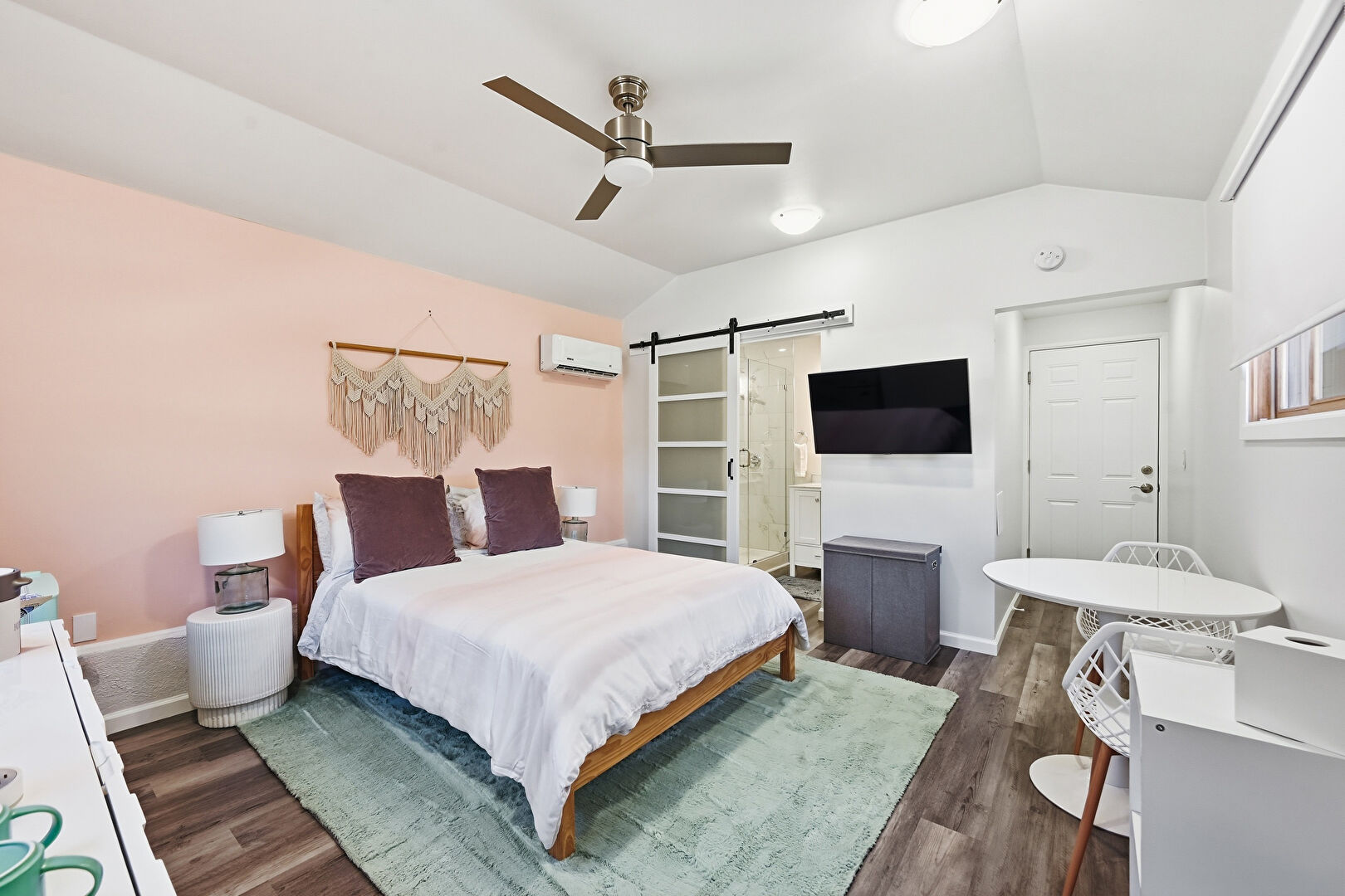 Barn Door, Baseboards Wall, Ceiling Fan, Drywall, Ensuite Bathroom, Natural Light, Vaulted Ceiling, Wall Mounted Ac, Wood Finish Floor, Cathedral Ceiling, Ceiling Fan