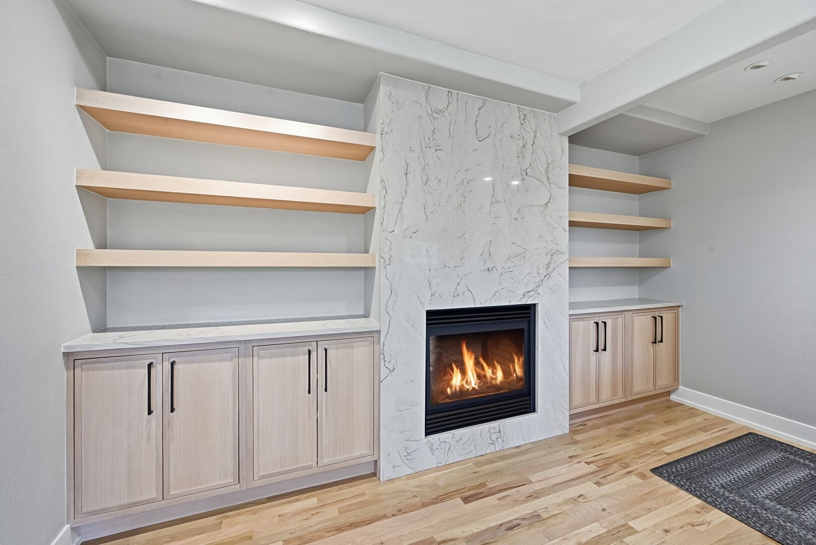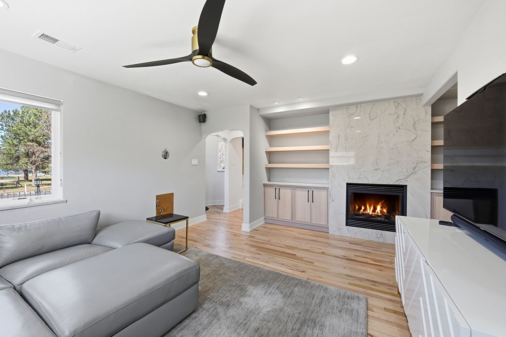 Arched Walkways, Baseboard Radiator, Baseboards Wall, Beamed Ceiling, Built In Shelves, Ceiling Fan, Drywall, Fireplace, Natural Light, Notable Chandelier, Recessed Lighting, Vent, Wood Finish Floor, Baseboards Wall, Built In Shelves, Drywall, Wood Finish Floor
