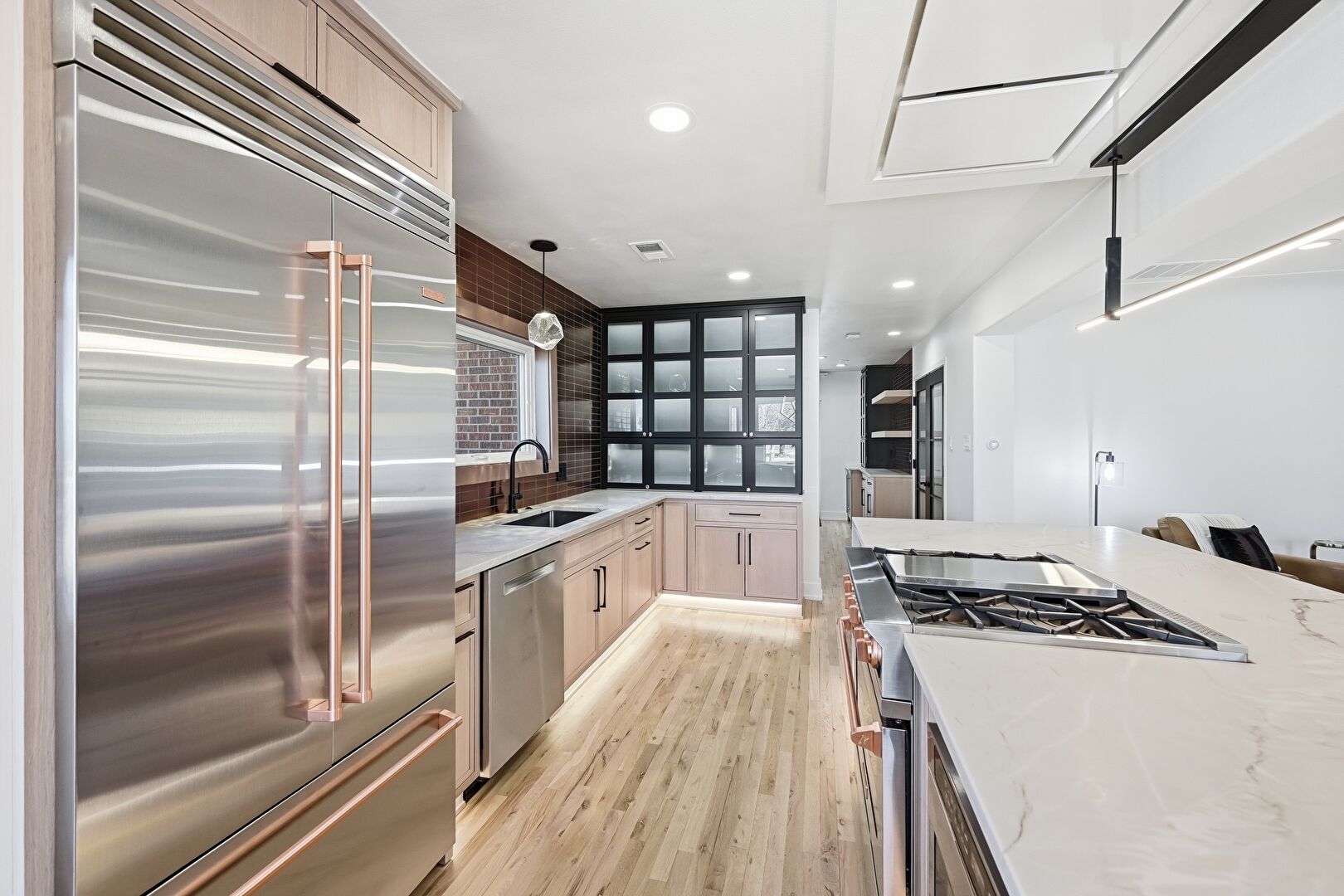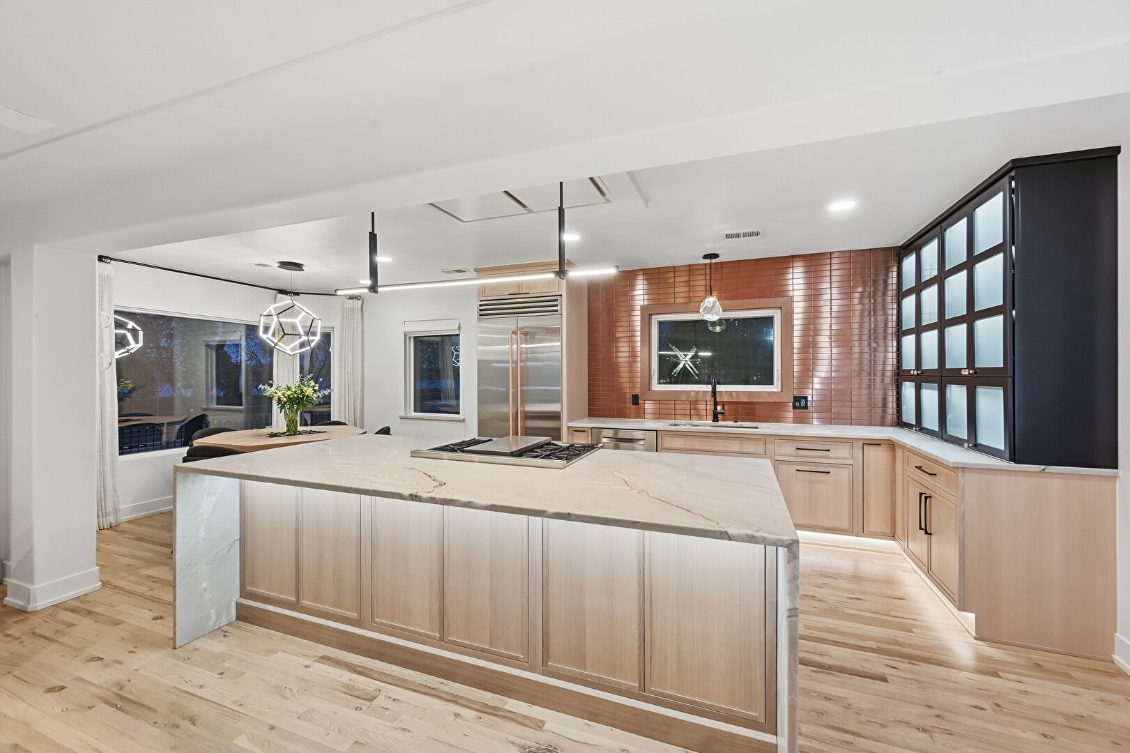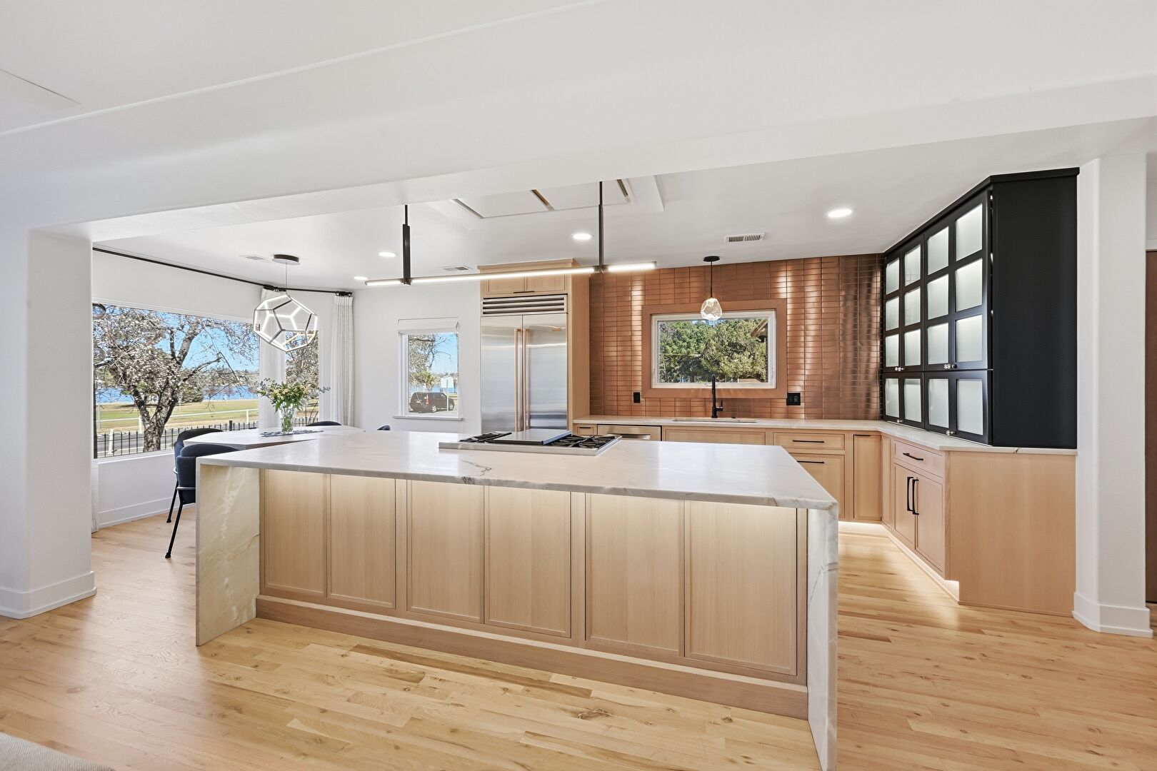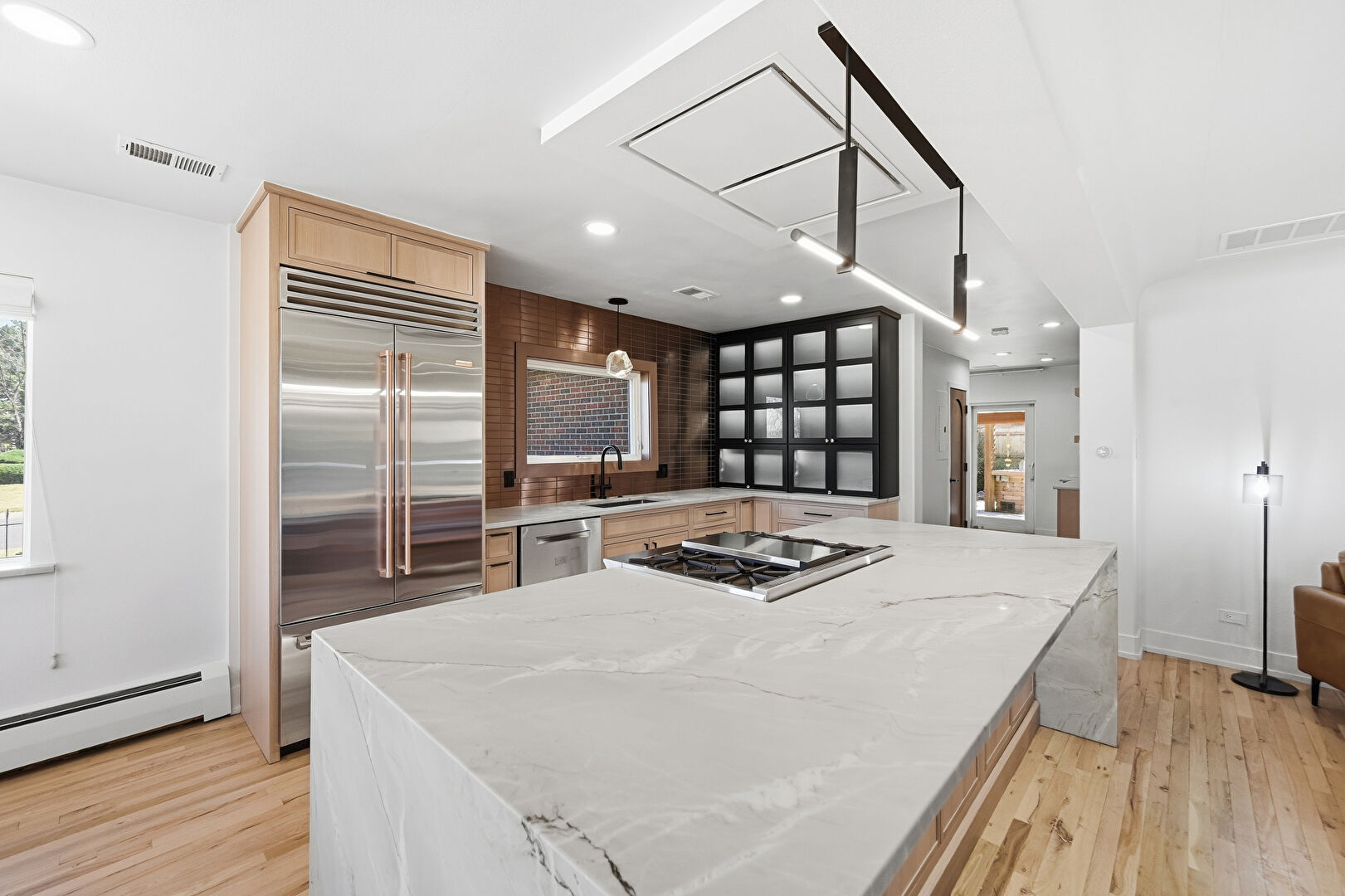 Baseboard Radiator, Baseboards Wall, Drywall, Fireplace, Flat Panel Cabinets, Glass Insert Cabinets, Kitchen Bar, Kitchen Island, L Shaped Kitchen, Natural Light, Open Shelves, Opens To Living Area, Pendant Lighting, Recessed Lighting, Shaker Cabinets, Stone Countertops, Vent, Wood Finish Floor, Glass Insert Cabinets, Kitchen Island, Natural Light, Recessed Lighting, Shaker Cabinets, Wood Finish Floor