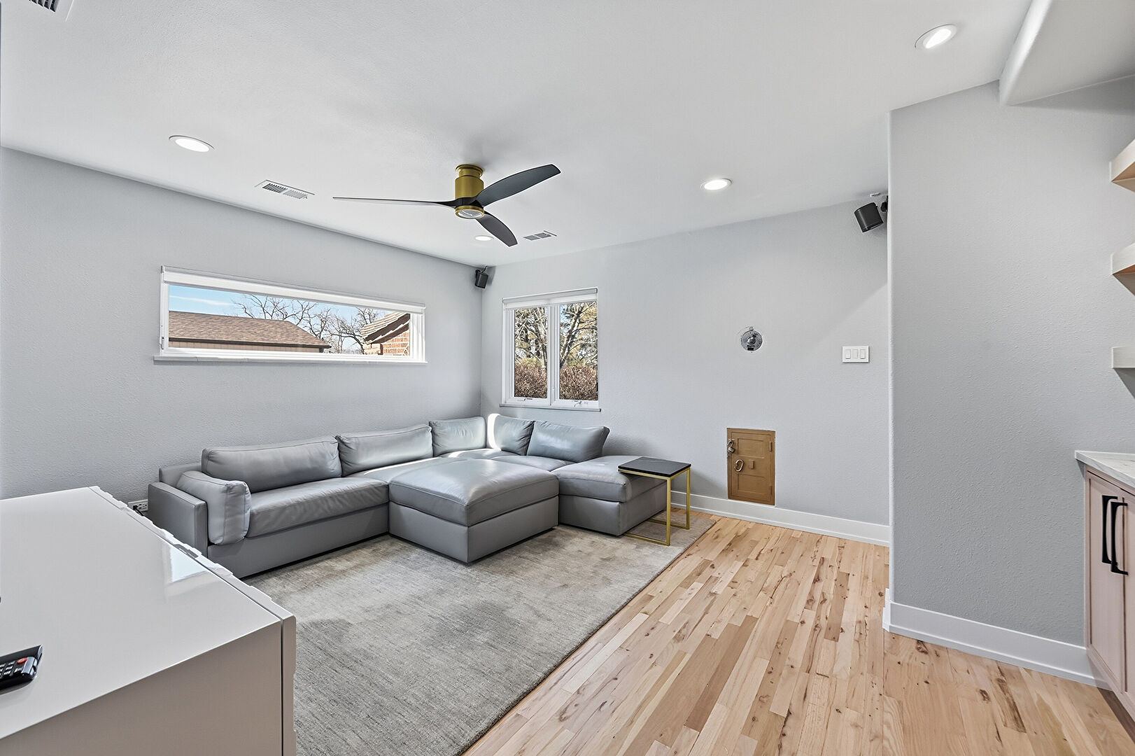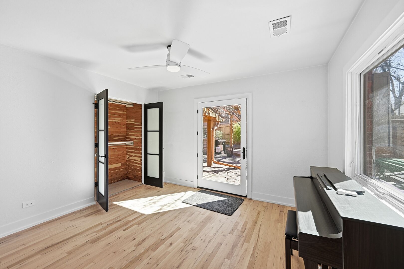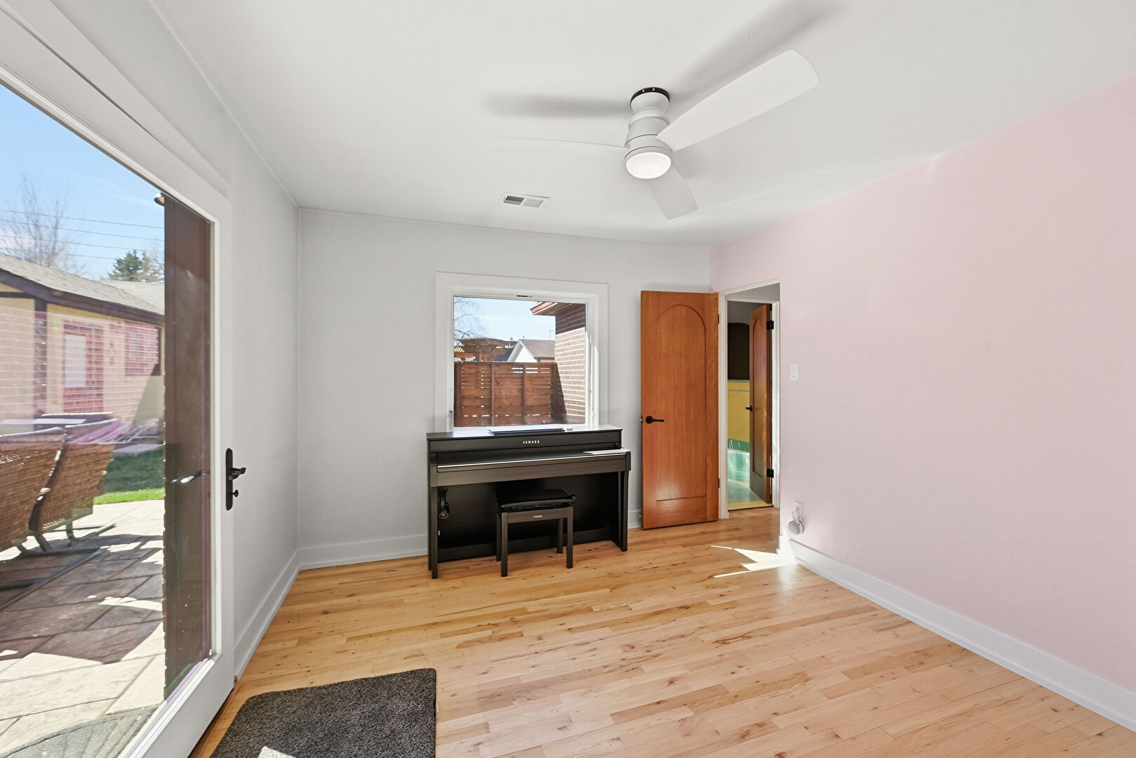 Baseboards Wall, Ceiling Fan, Drywall, Natural Light, Vent, Wood Finish Floor