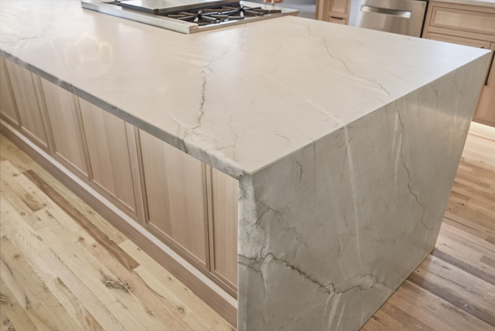 Kitchen Island, Shaker Cabinets, Wood Finish Floor, Stone Countertops, Water View