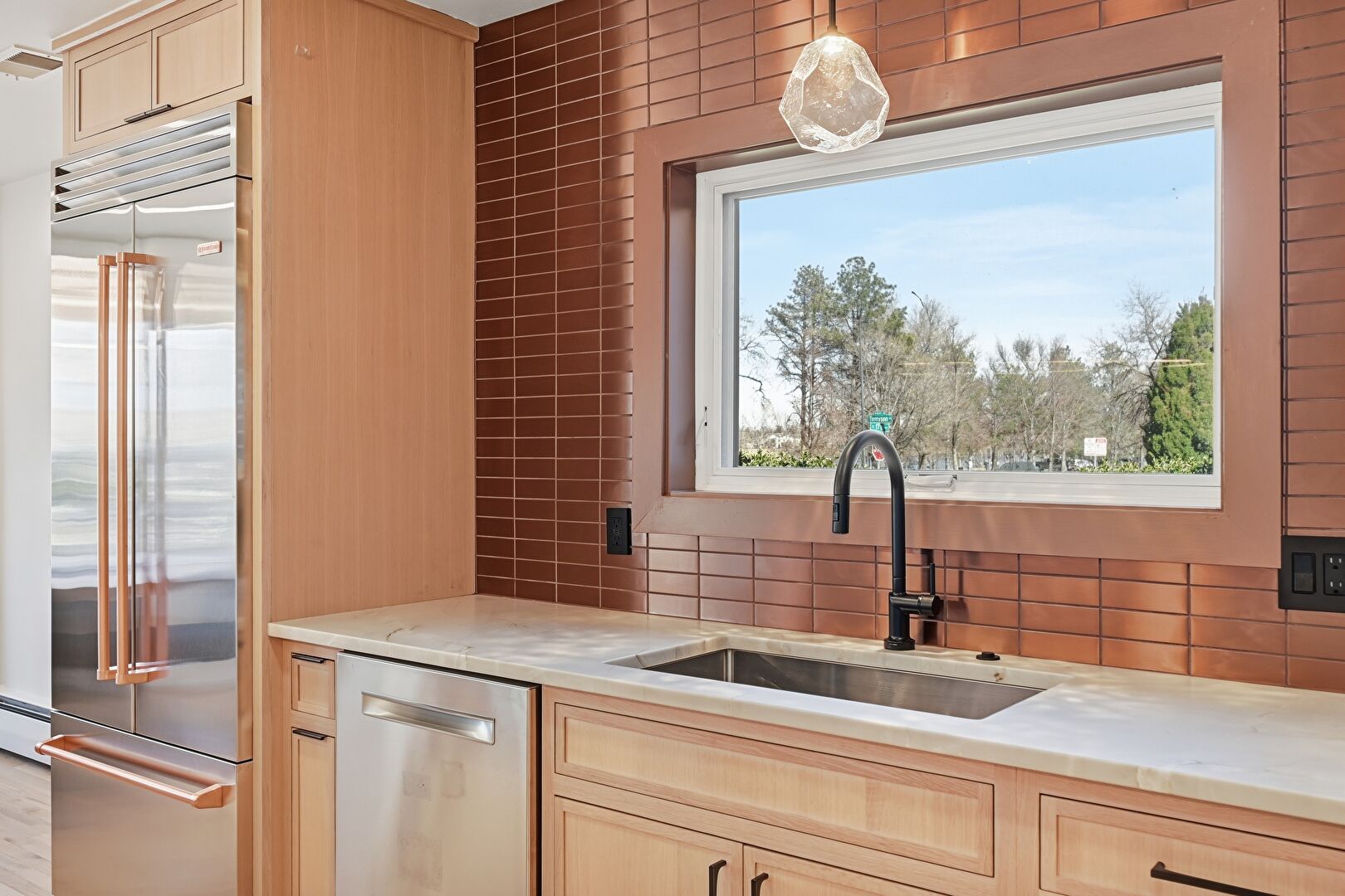 Drywall, French Doors, Glass Insert Cabinets, Natural Light, Open Shelves, Pendant Lighting, Recessed Lighting, Shaker Cabinets, Stone Countertops, Wood Finish Floor, Wine Cooler