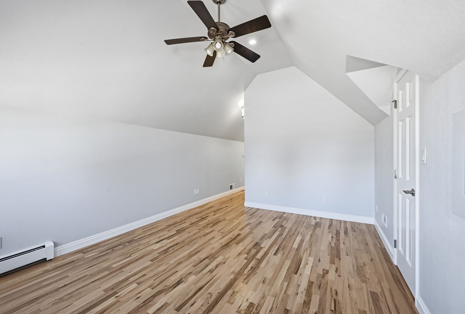 Baseboard Radiator, Baseboards Wall, Bonus Room, Ceiling Fan, Drywall, Vaulted Ceiling, Vent, Wood Finish Floor, Drywall, Natural Light
