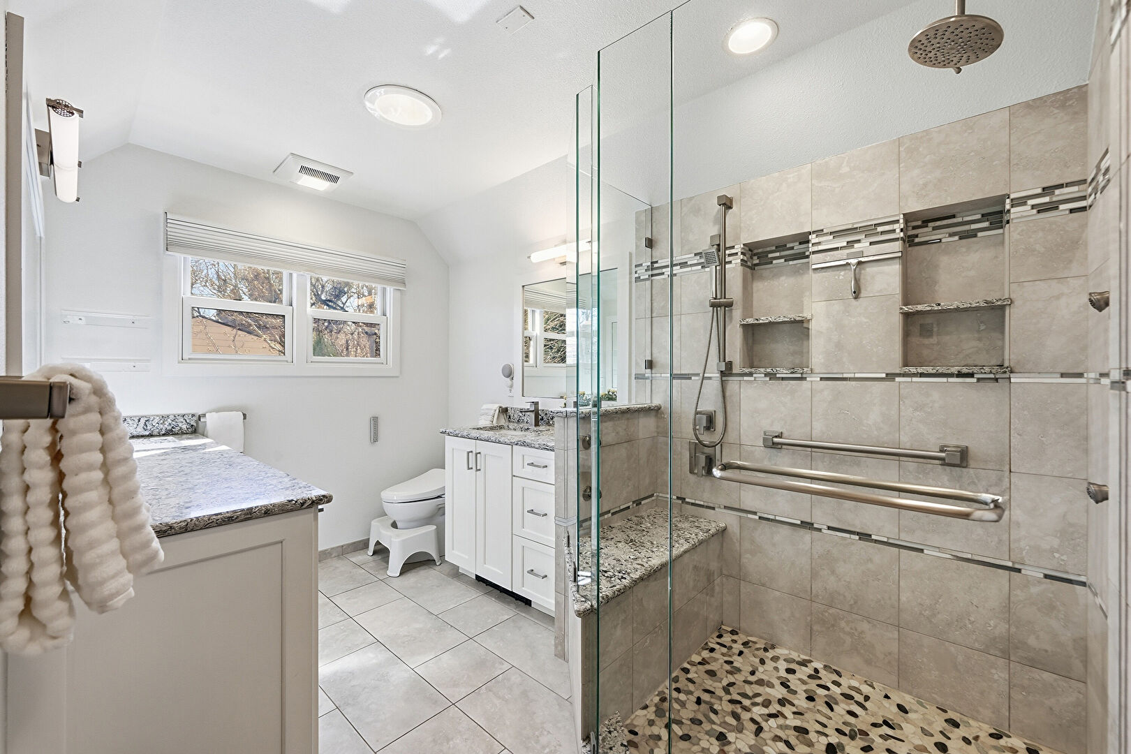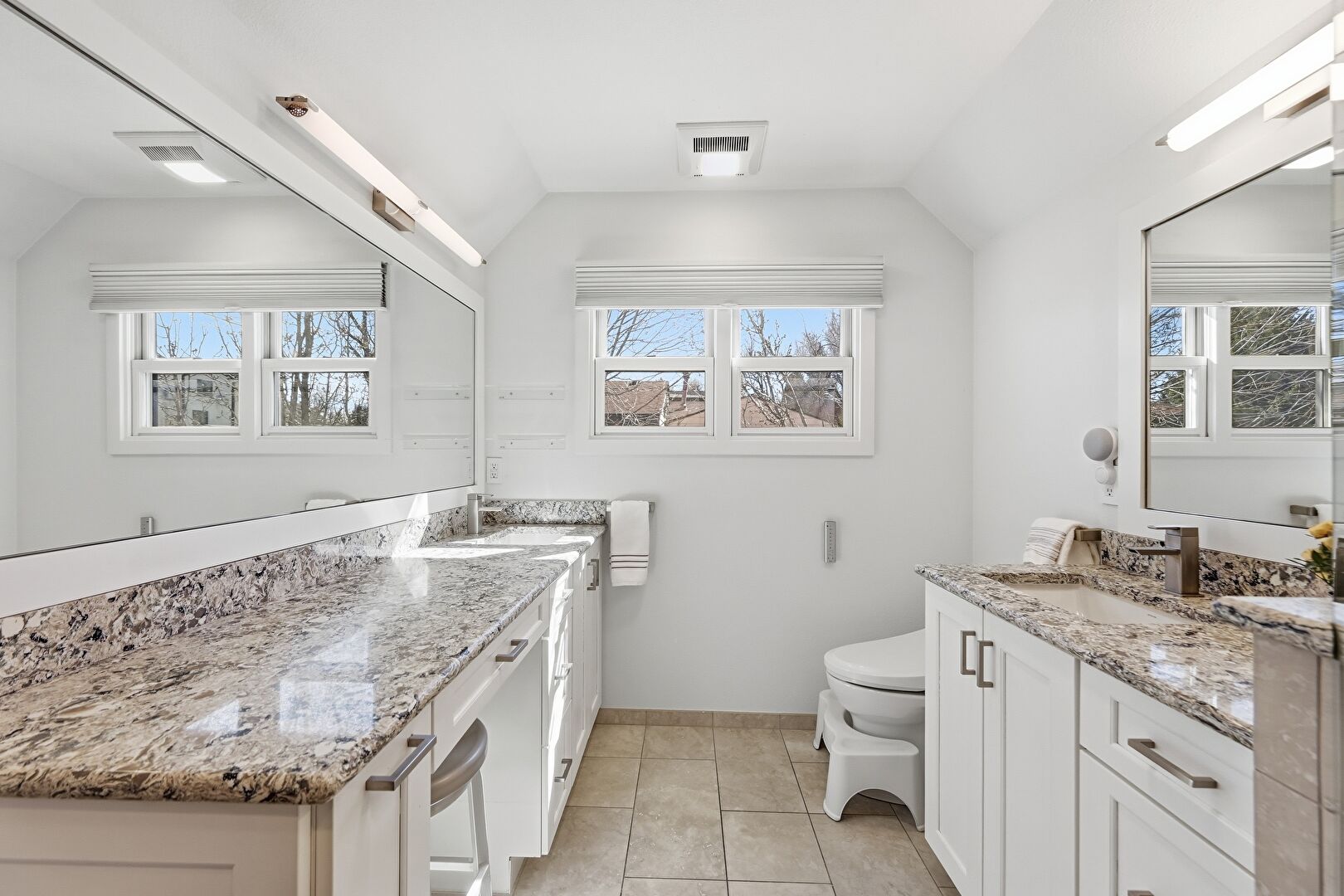 Baseboards Wall, Drywall, Full Bathroom, Half Bathroom, Natural Light, Radiator, Tile Floor, Tile Wall, Two Single Vanities, Vanity, Vaulted Ceiling, Vent, Wainscot Wall, Full Bathroom, Natural Light, Radiator, Vanity, Vent
