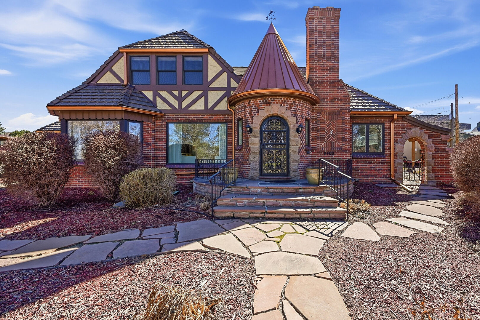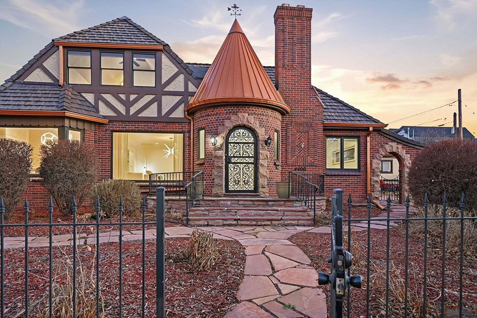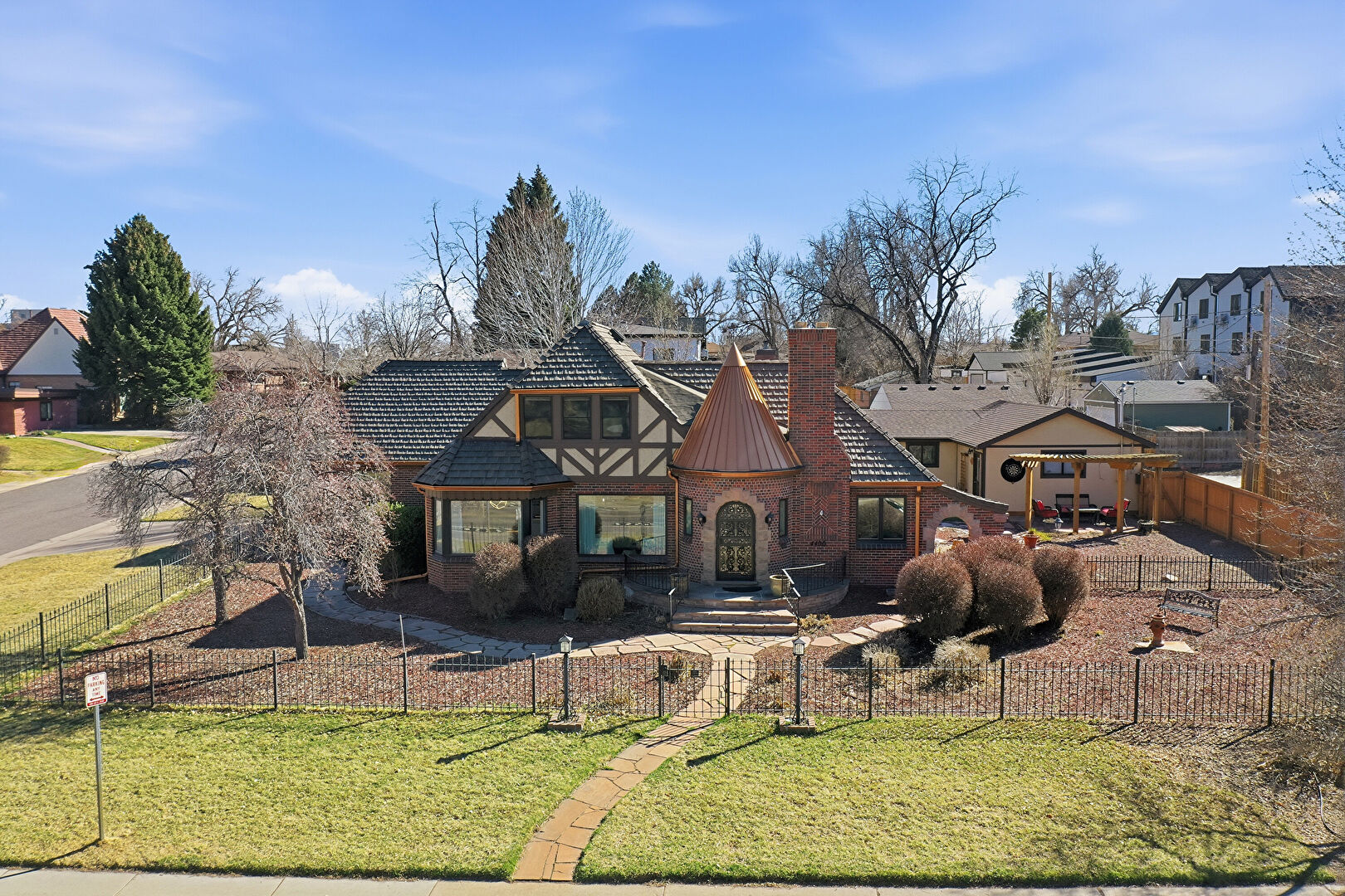 Brick Siding, Chimney, Downspout, Driveway, Fence, Gas Meter, Gate, Gutters, Lawn, Metal Roof, Patio, Pergola, Residential View, Shingle Roof, Standing Seam Roof, Stoop, Stucco Siding, Brick Siding, Chimney, Gutters, Lawn, Patio, Residential View, Stoop, Stucco Siding