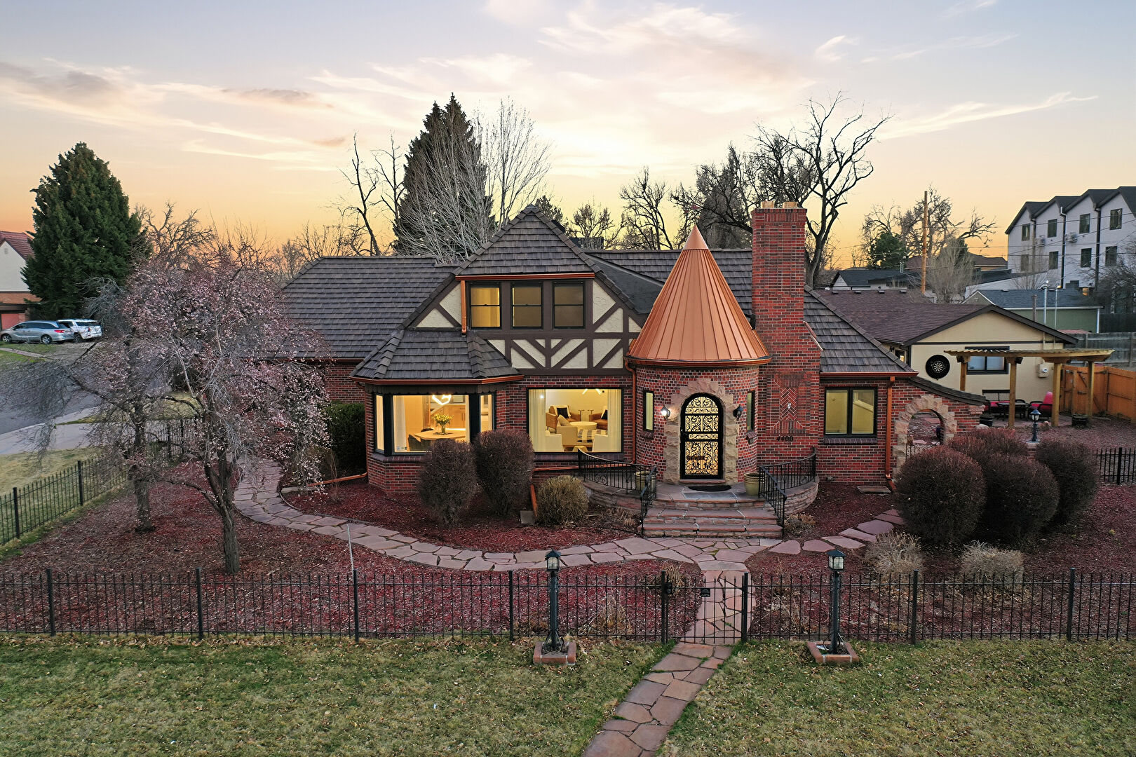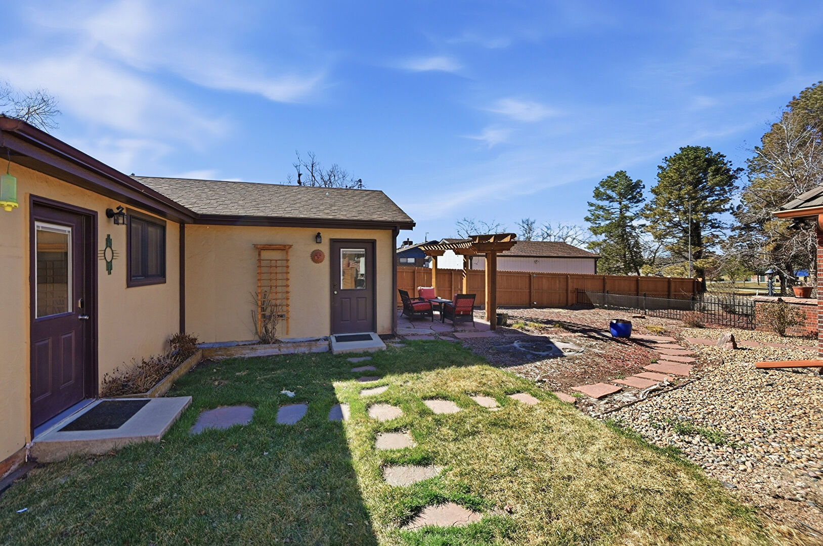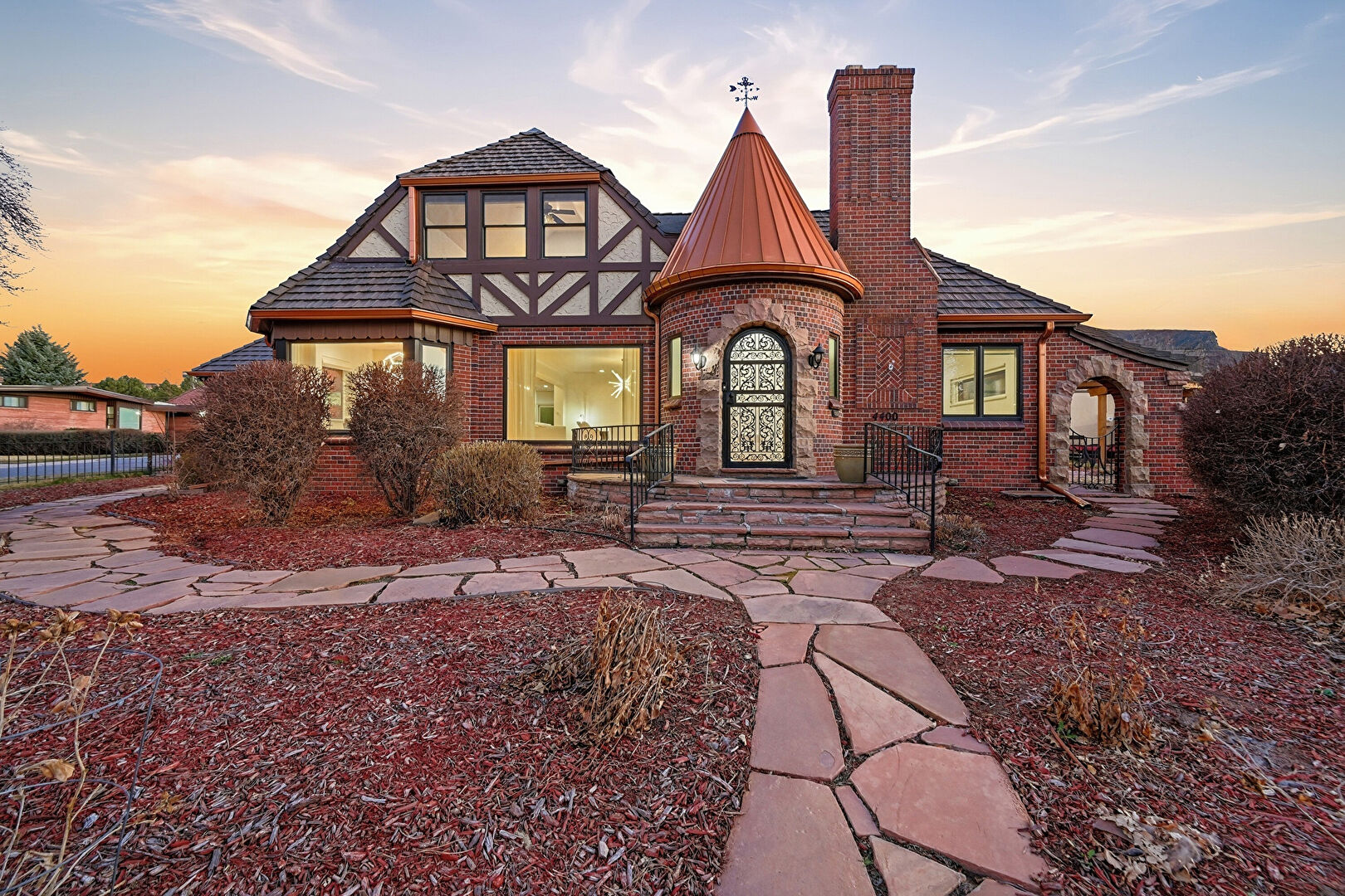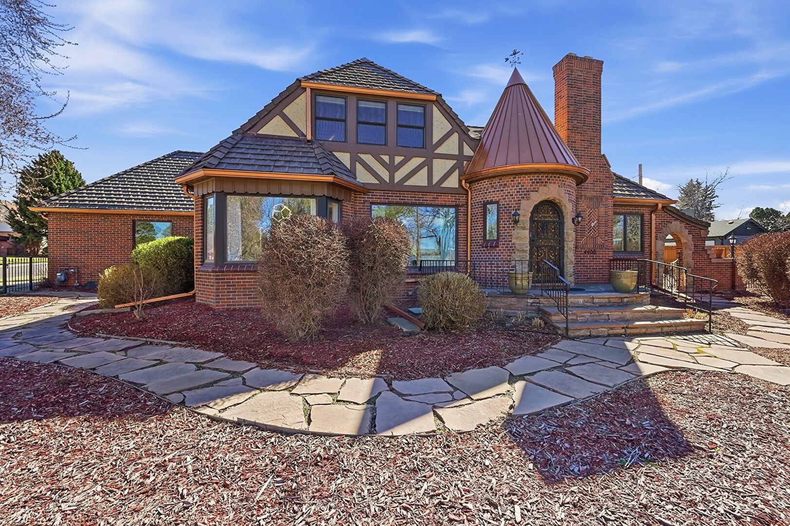 Brick Siding, Chimney, Downspout, Driveway, Fence, Gas Meter, Gate, Gutters, Lawn, Metal Roof, Patio, Pergola, Residential View, Shingle Roof, Standing Seam Roof, Stoop, Stucco Siding, Brick Siding, Chimney, Gutters, Lawn, Patio, Residential View, Stoop, Stucco Siding