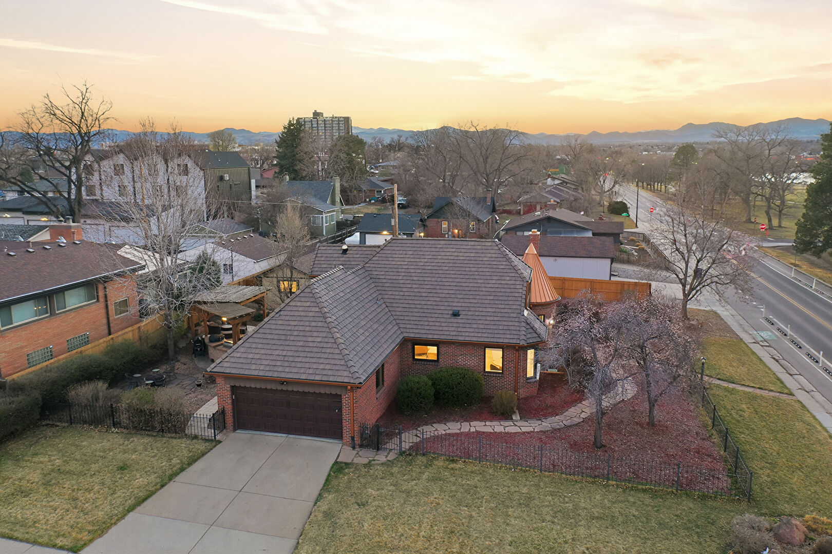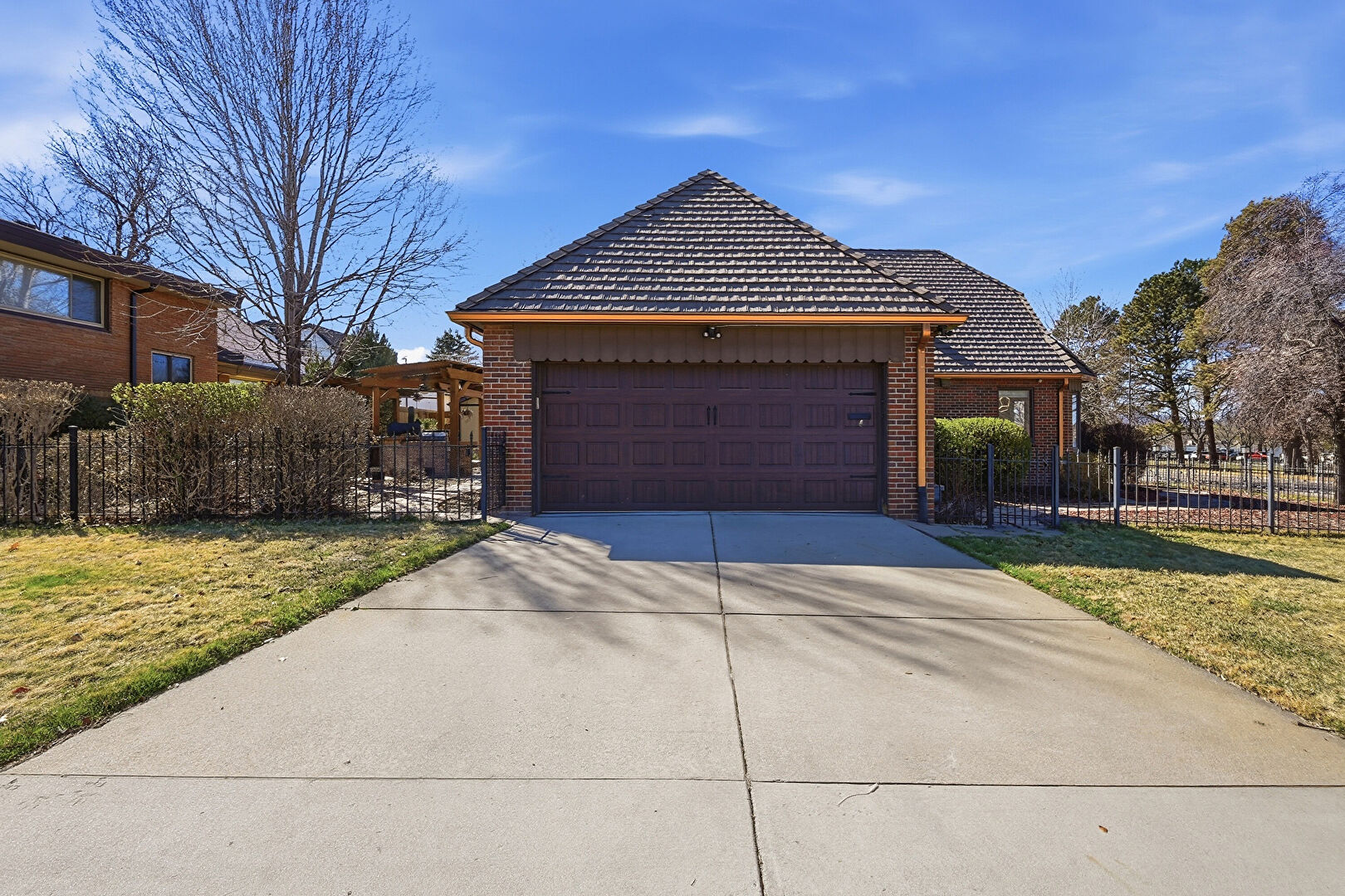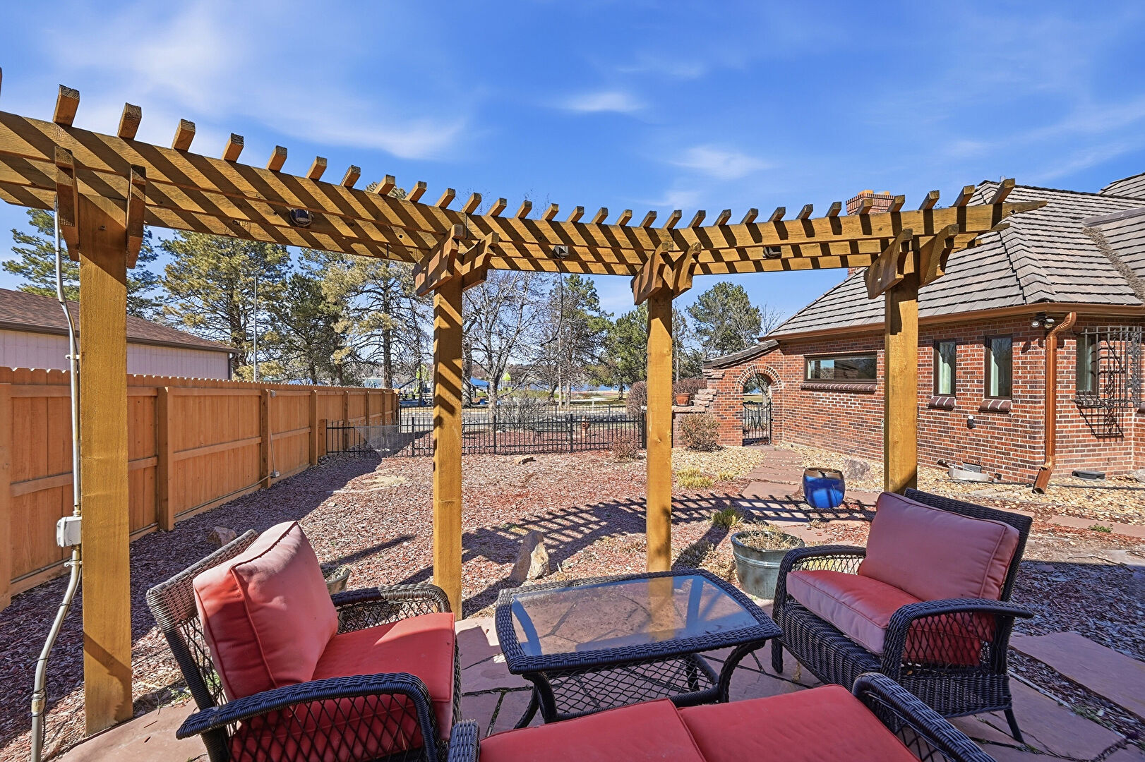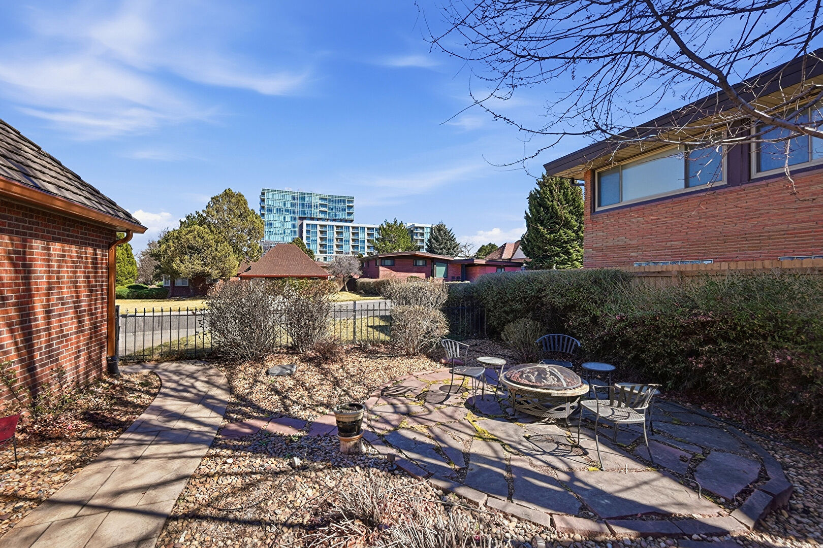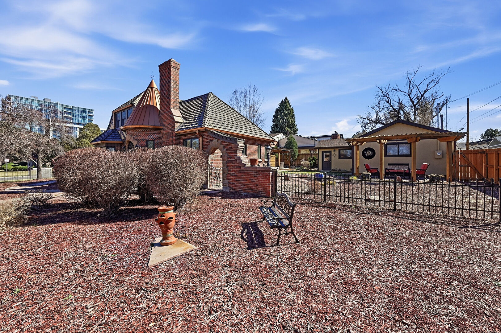 Brick Siding, Chimney, Downspout, Fence, Metal Roof, Patio