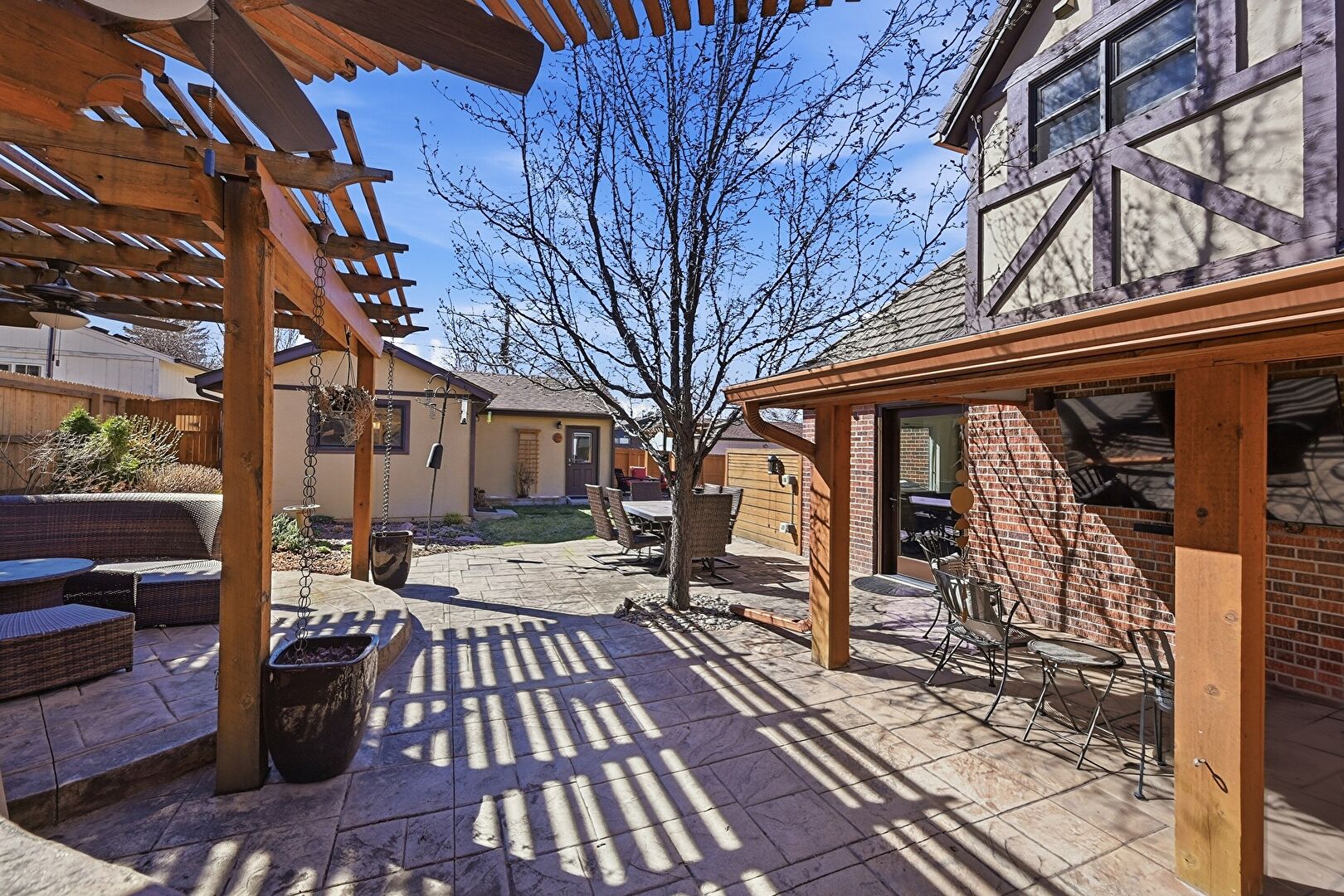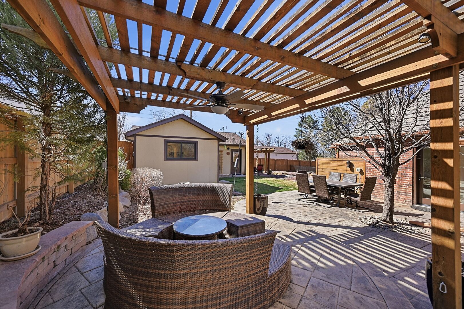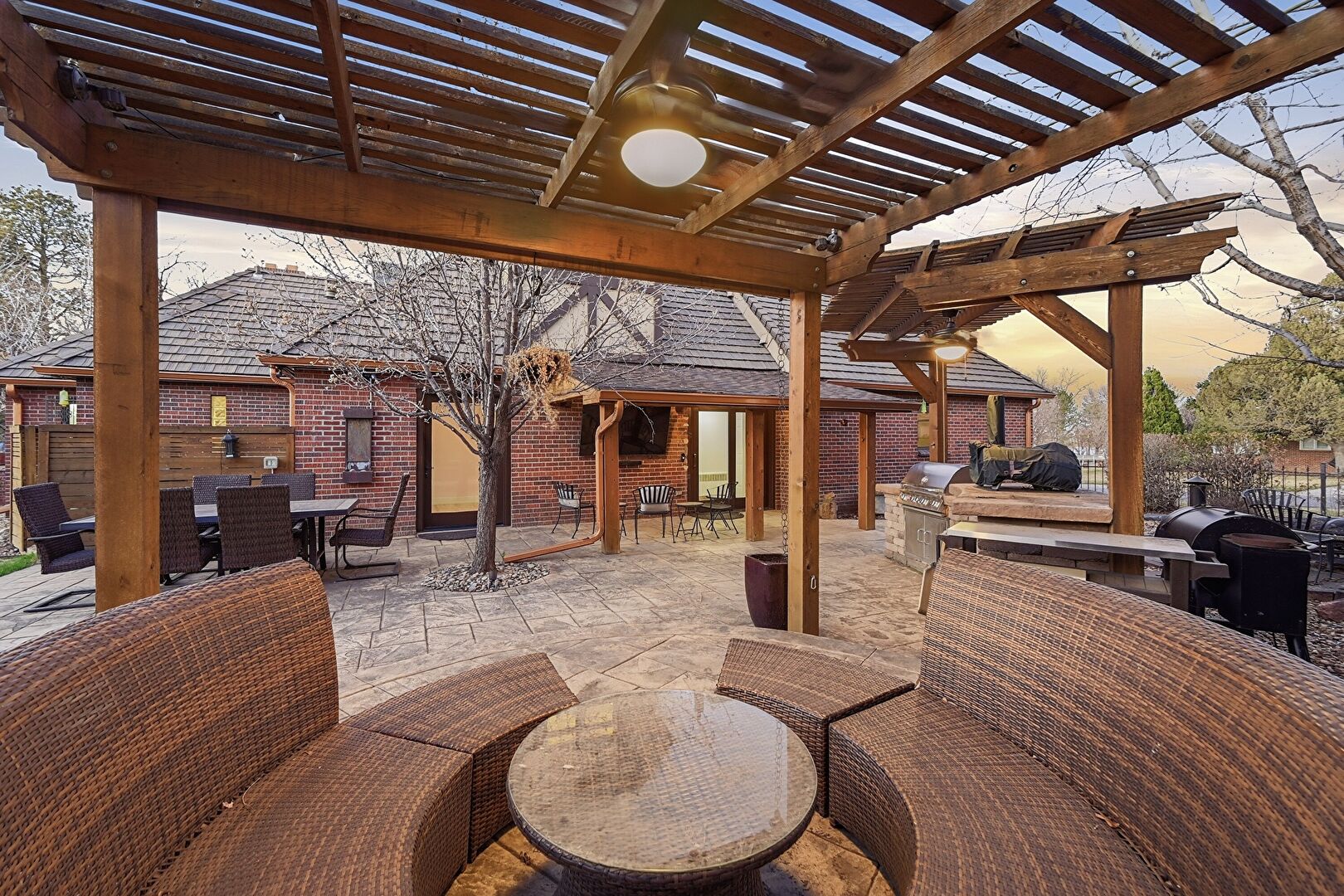 Ceiling Fan, Fence, Fire Pit, Grill, Outdoor Dining Area, Outdoor Kitchen, Outdoor Living Space, Patio, Pergola, Vent, Fence, Outdoor Dining Area, Outdoor Kitchen, Outdoor Living Space, Outdoor Structure, Patio, Pergola