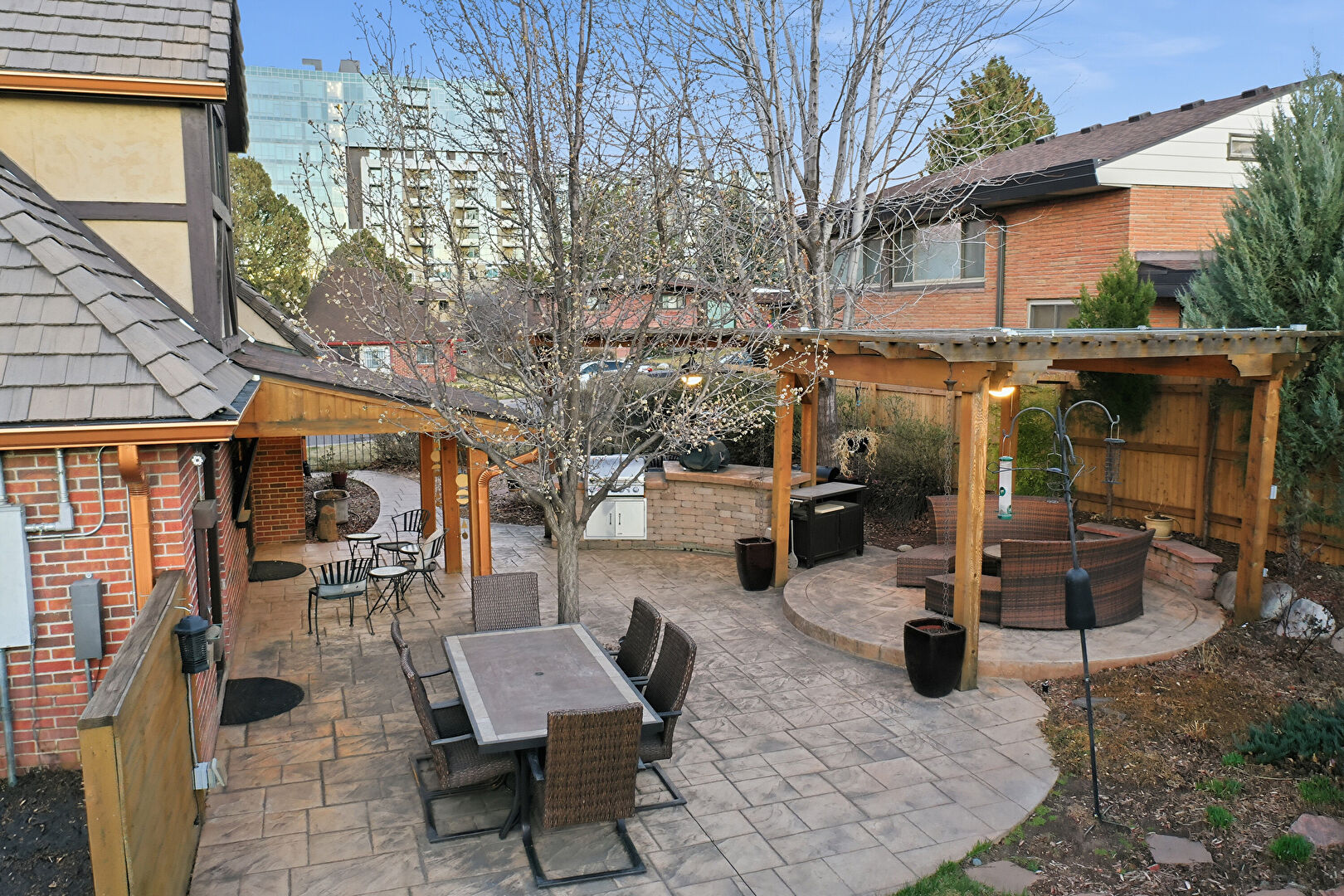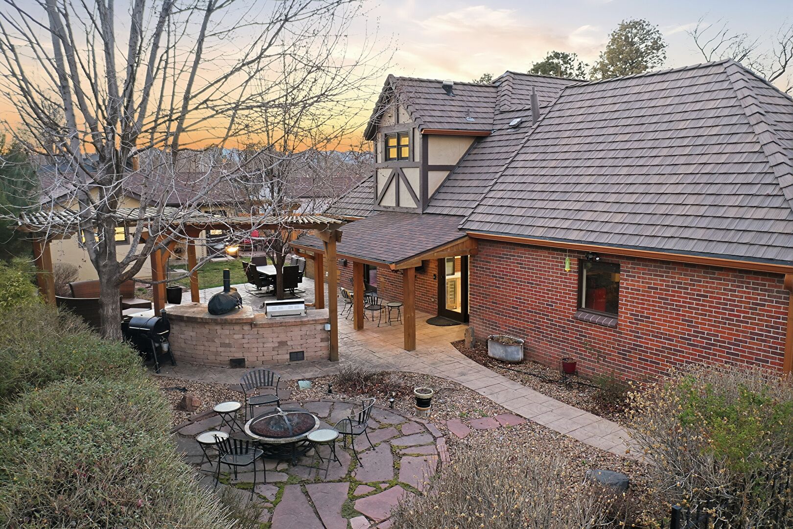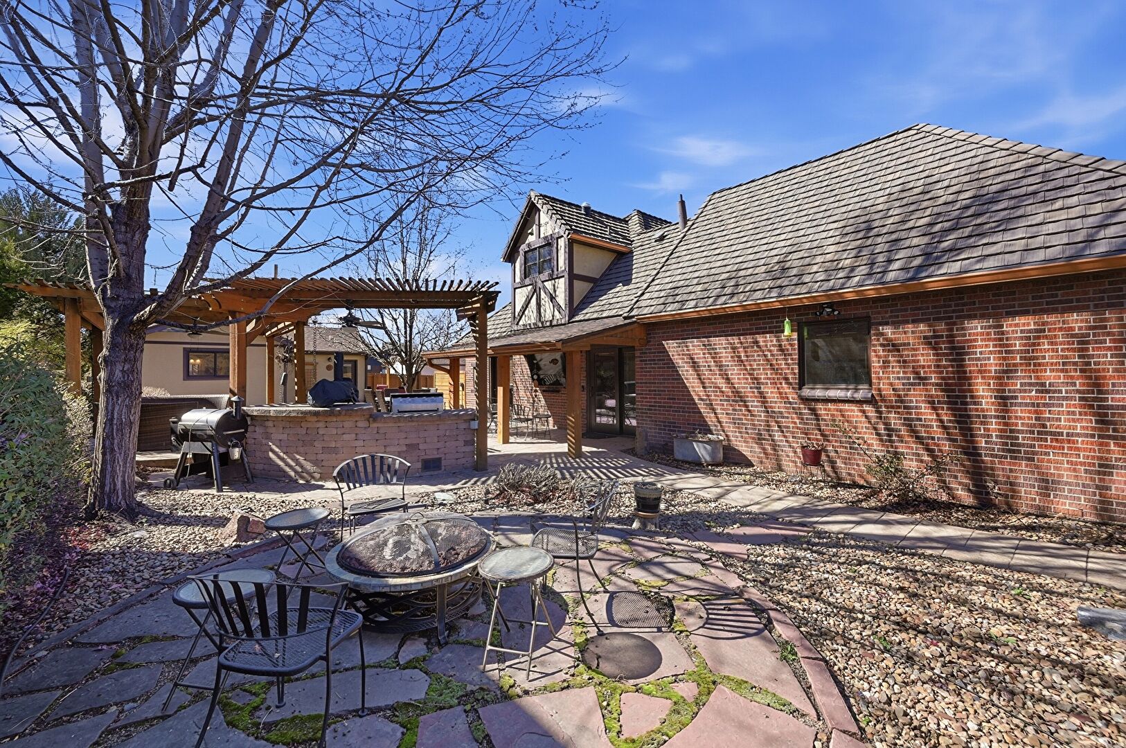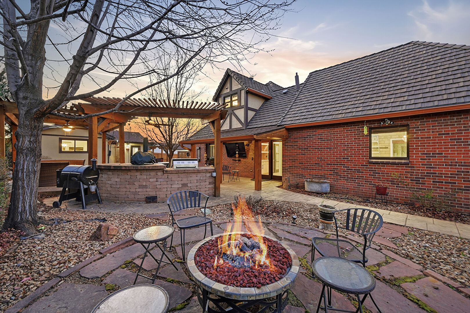 Brick Siding, Grill, Gutters, Outdoor Kitchen, Patio, Pergola, Stucco Siding, Fire Pit