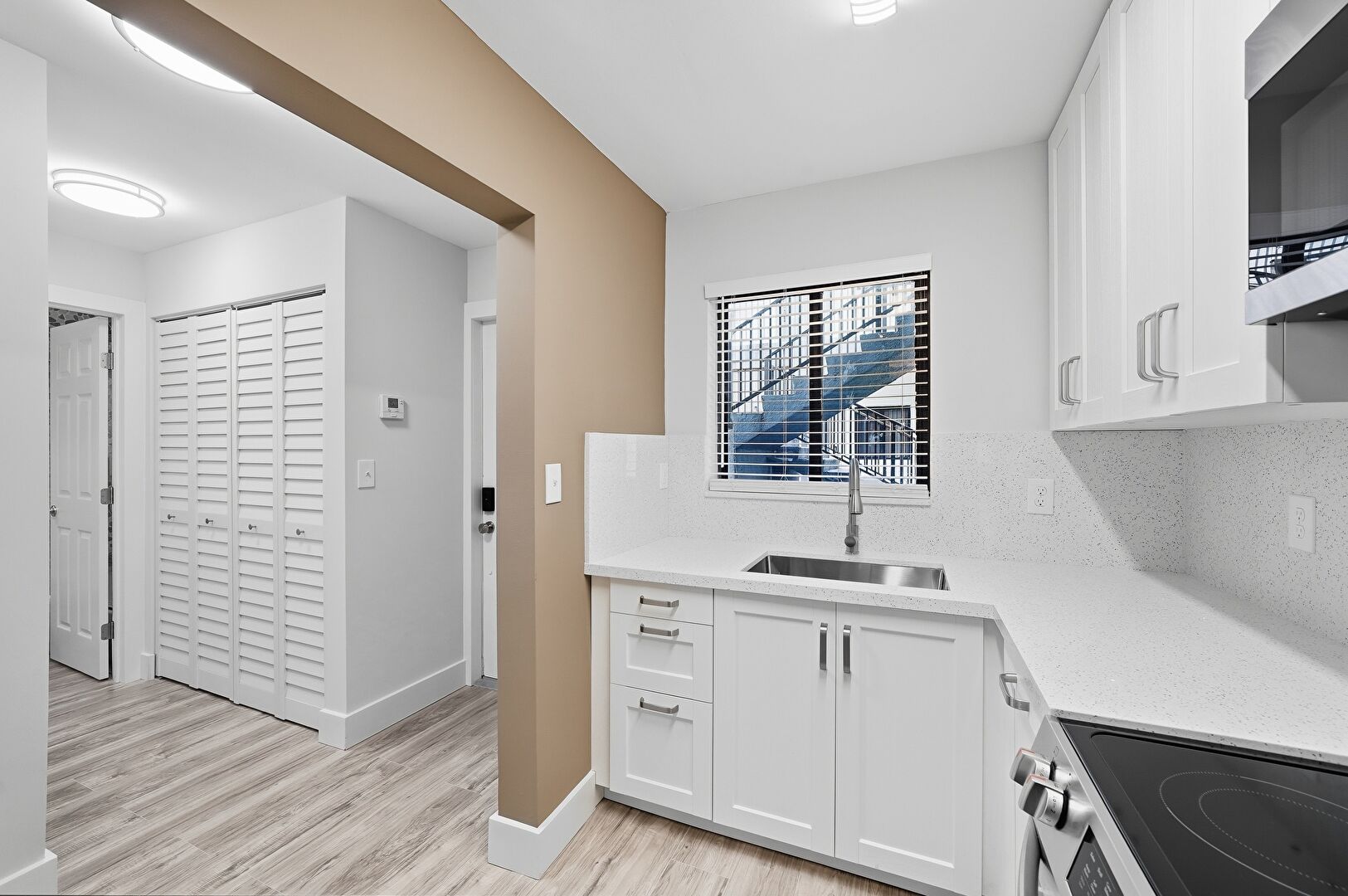 Baseboards Wall, Drywall, Natural Light, Opens To Living Area, Shaker Cabinets, Stone Countertops, Vent, Wood Finish Floor, Closet, Drywall