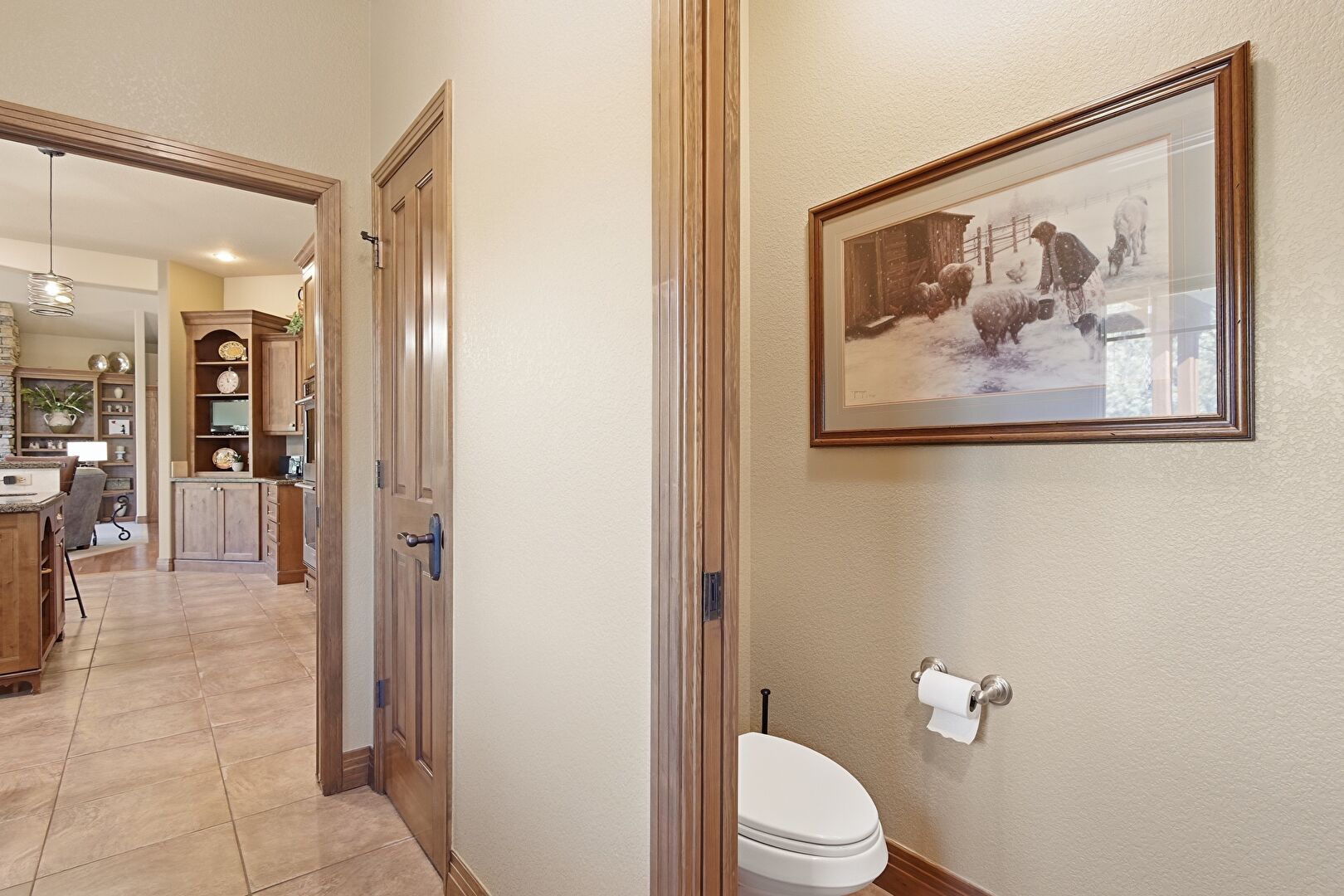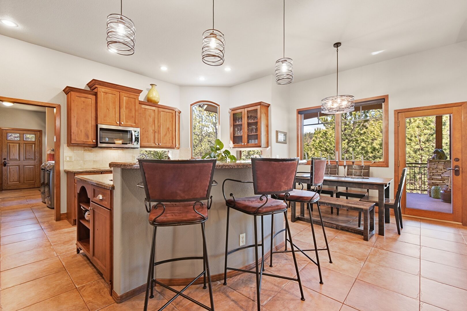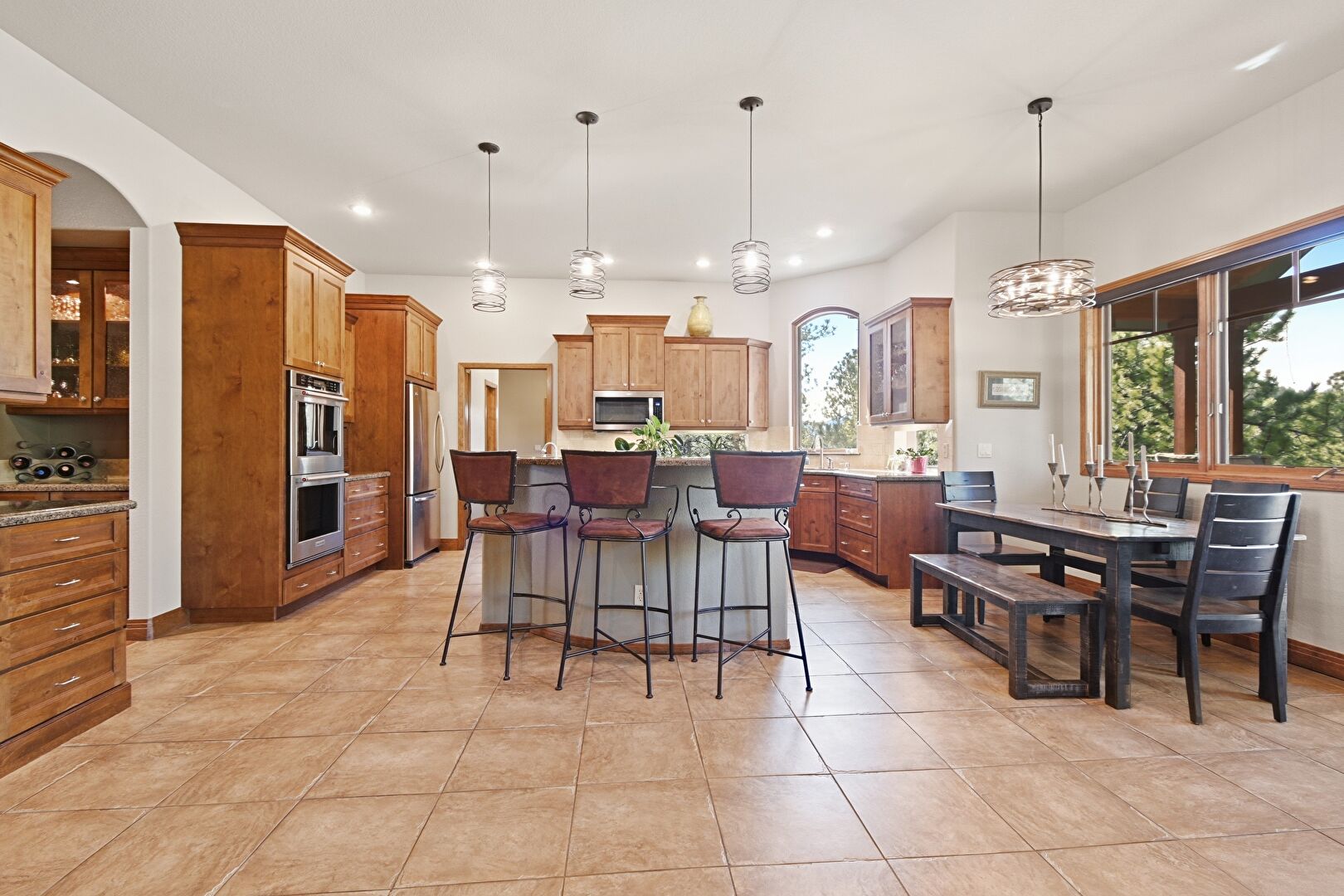 Crown Molding Cabinets, Drywall, Glass Insert Cabinets, Indoor Bar, Medium Brown Cabinets, Natural Light, Open Shelves, Pendant Lighting, Shaker Cabinets, Stone Countertops, Wine Cooler, Tile Floor