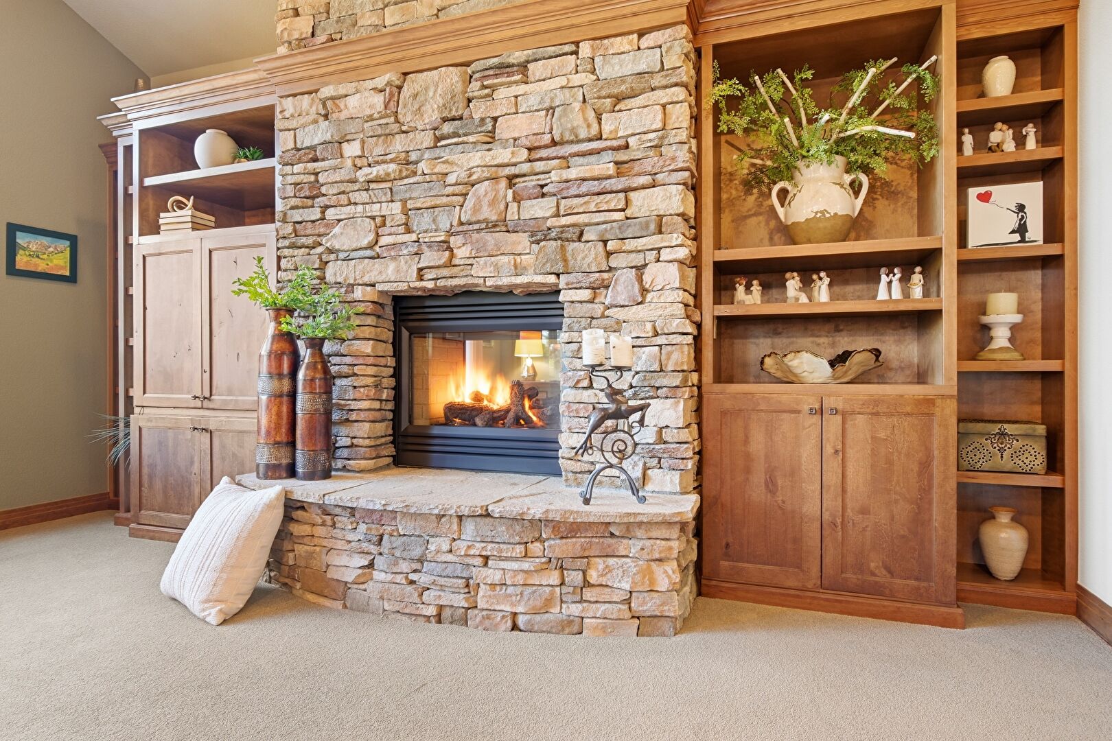 Built In Shelves, Carpet, Drywall, Fireplace, Baseboards Wall