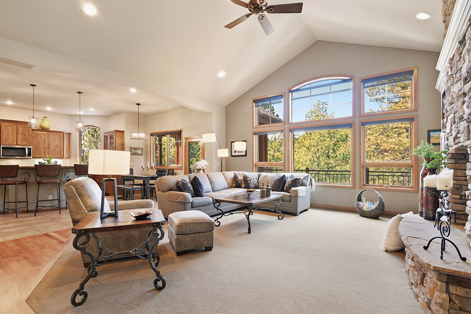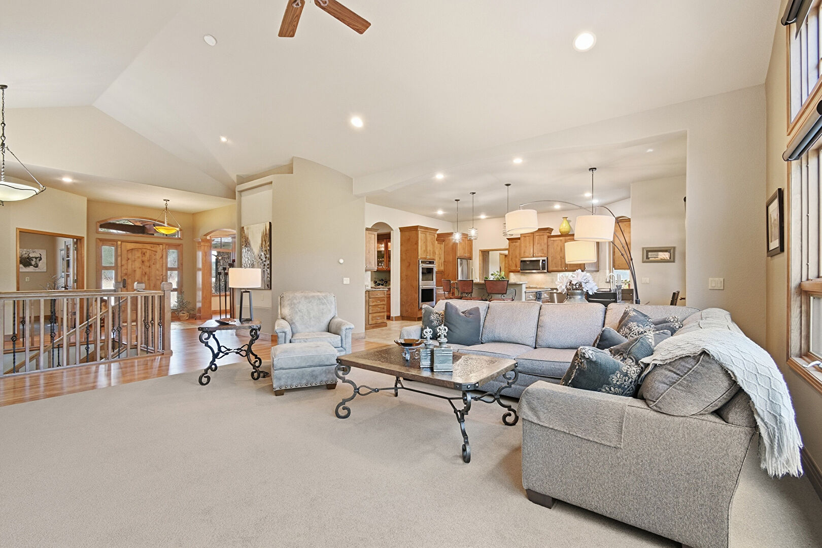 Arched Walkways, Baseboards Wall, Carpet, Cathedral Ceiling, Ceiling Fan, Double Oven, Drywall, Fireplace, High Ceiling, Natural Light, Notable Chandelier, Recessed Lighting, Vaulted Ceiling, Wine Cooler, Carpet, Ceiling Fan, Drywall, Fireplace, Natural Light