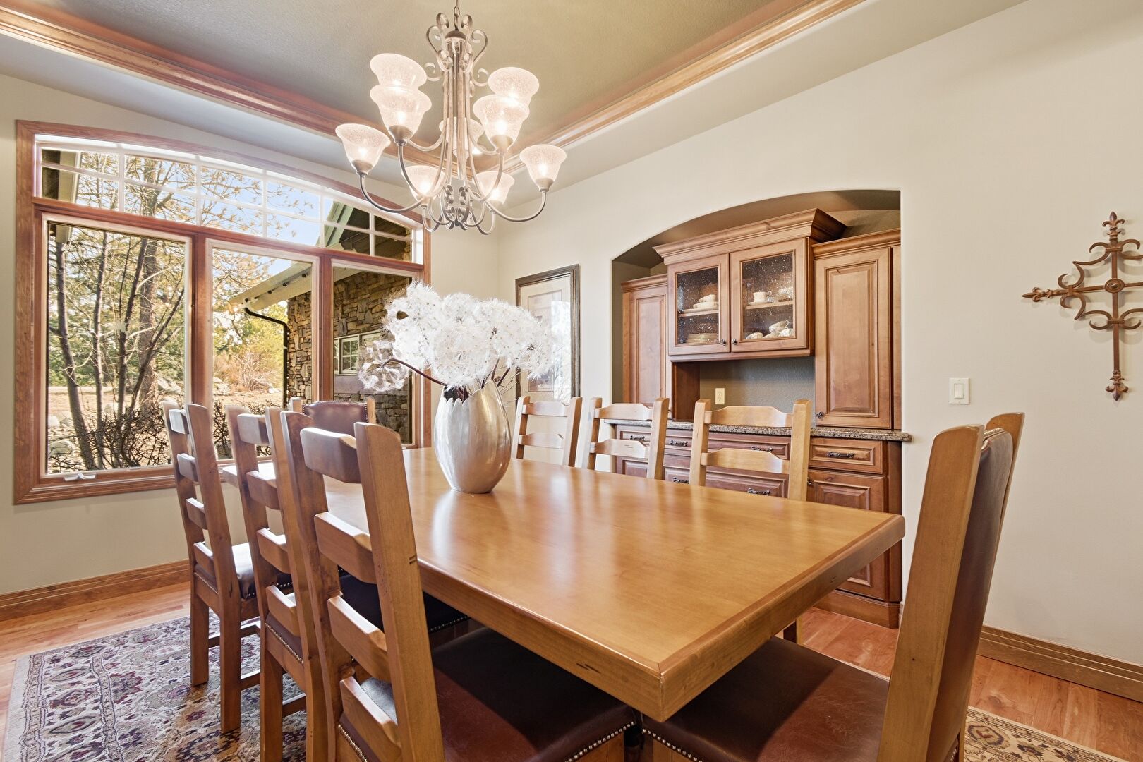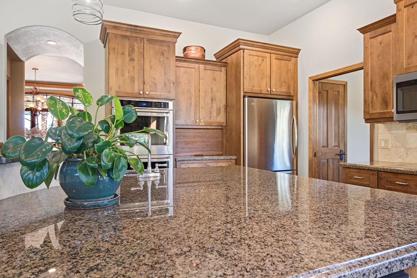Arched Walkways, Baseboards Wall, Ceiling Fan, Crown Molding Cabinets, Double Oven, Drywall, Fireplace, Glass Insert Cabinets, High Ceiling, Kitchen Bar, Kitchen Island, Medium Brown Cabinets, Natural Light, Notable Chandelier, Open Shelves, Opens To Living Area, Pendant Lighting, Recessed Lighting, Shaker Cabinets, Stone Countertops, Tile Floor, Trash Compactor, U Shaped Kitchen, Vaulted Ceiling, Wood Finish Floor, Crown Molding Cabinets, Double Oven, Glass Insert Cabinets, Natural Light, Recessed Lighting, Shaker Cabinets