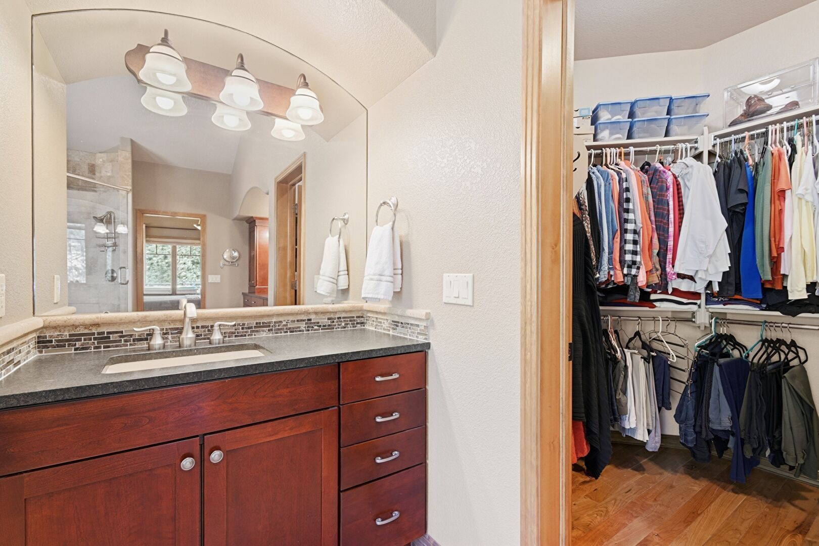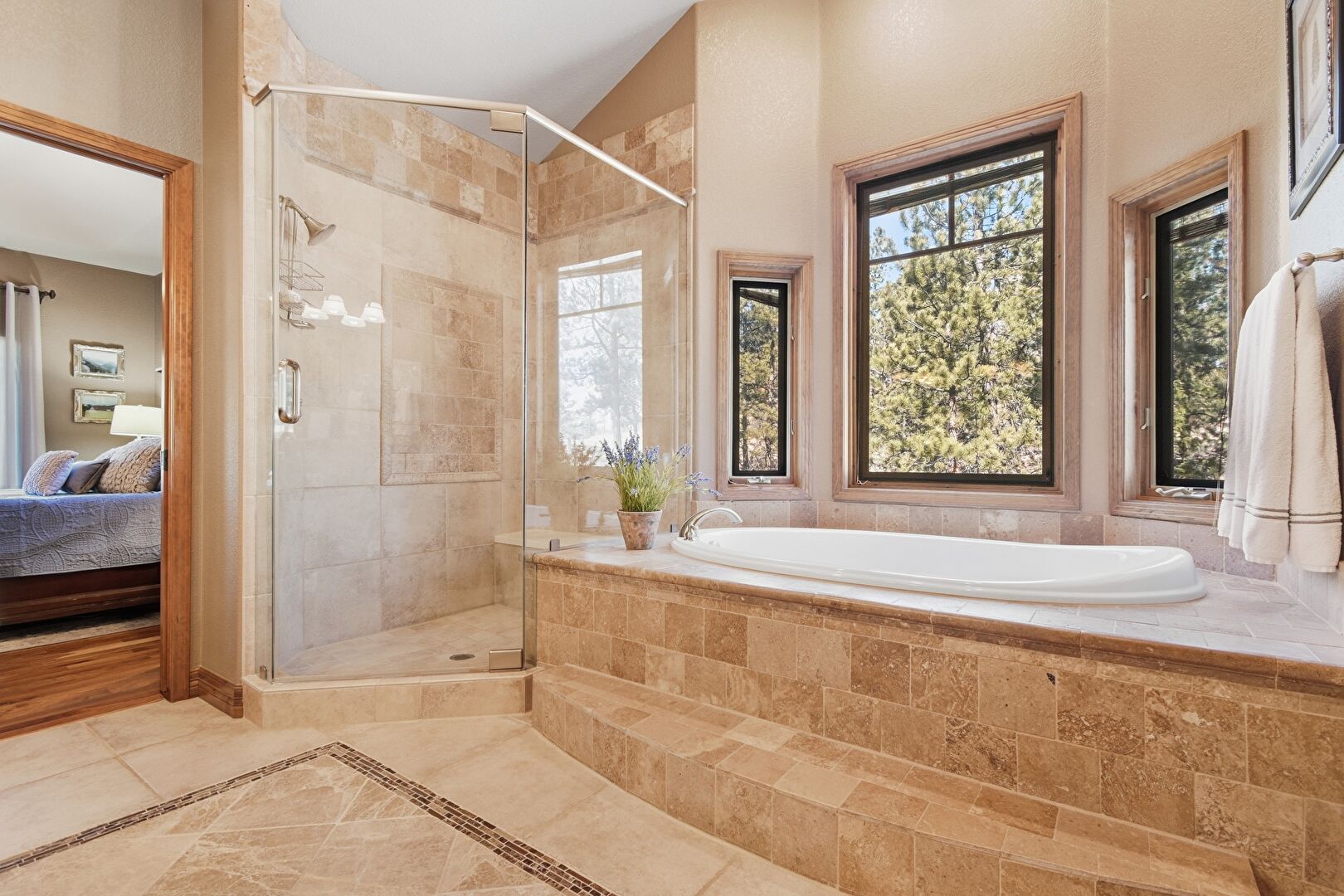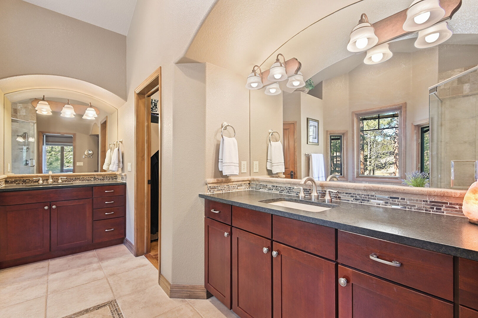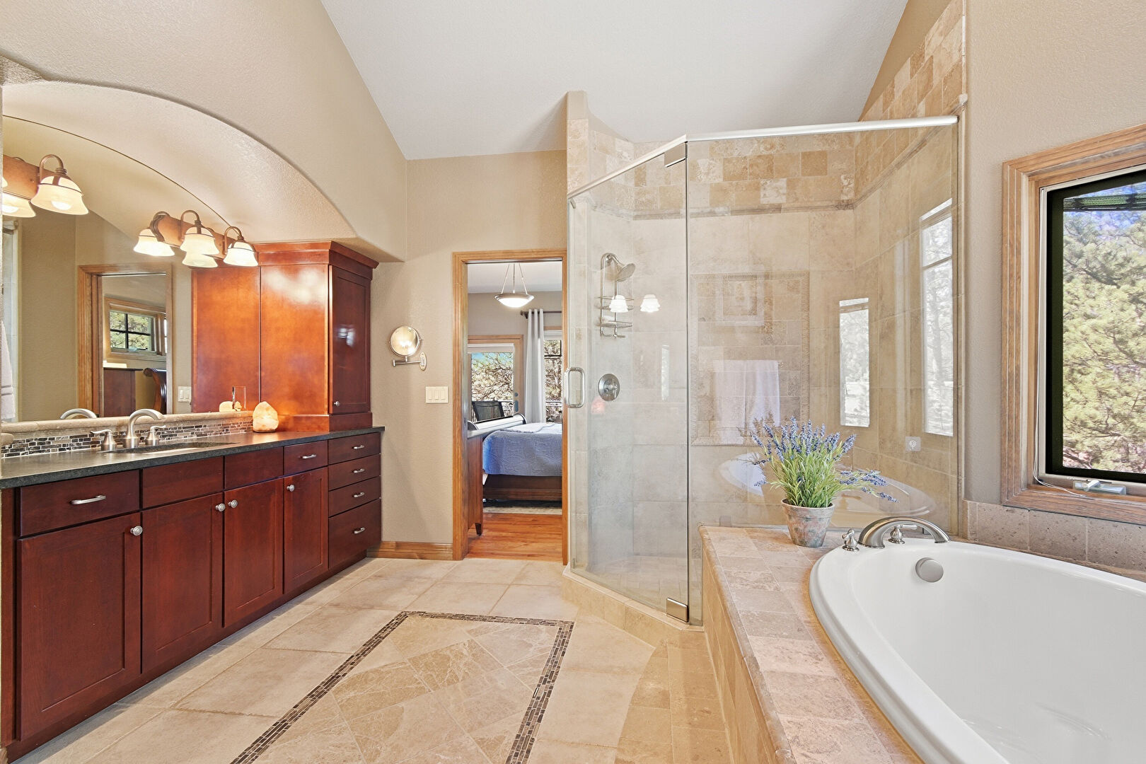 Baseboards Wall, Combined Bath Shower, Drywall, Ensuite Bathroom, Full Bathroom, Half Bathroom, Inlaid Floor, Natural Light, Notable Chandelier, Textured Wall, Tile Floor, Tile Wall, Two Single Vanities, Vanity, Vaulted Ceiling, Wainscot Wall, Walk In Closet, Water Closet, Wood Finish Floor, Double Vanity, Full Bathroom, Natural Light, Textured Wall, Tile Floor, Vanity