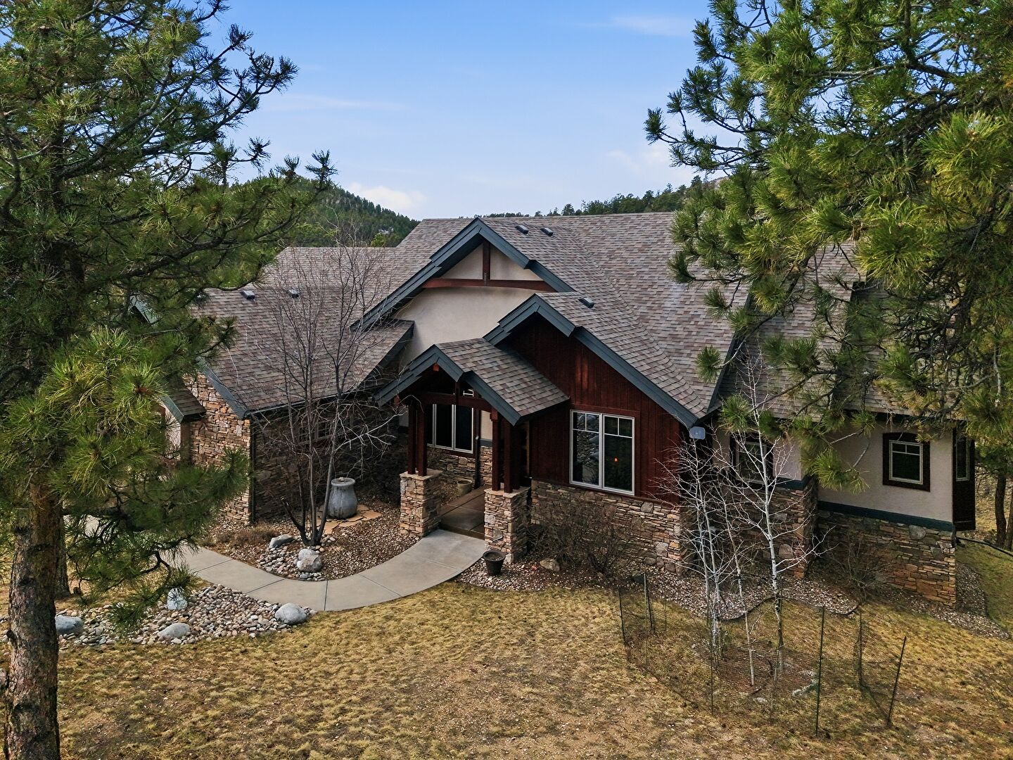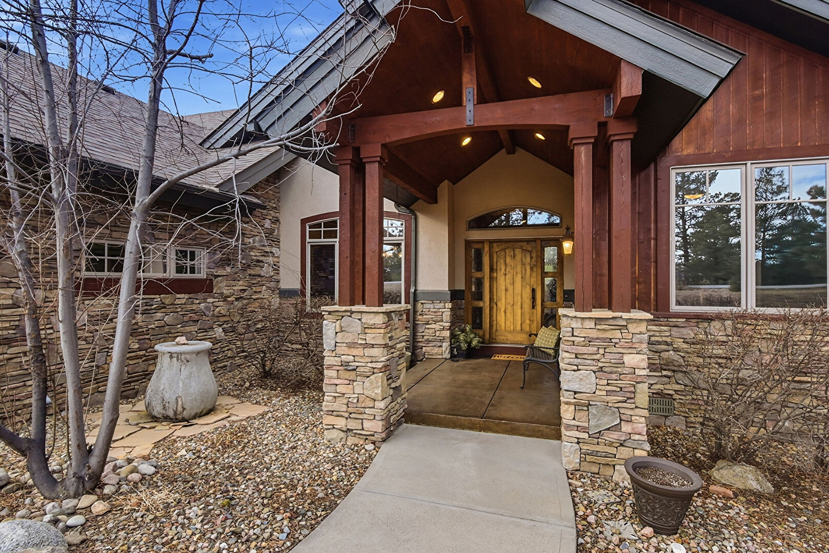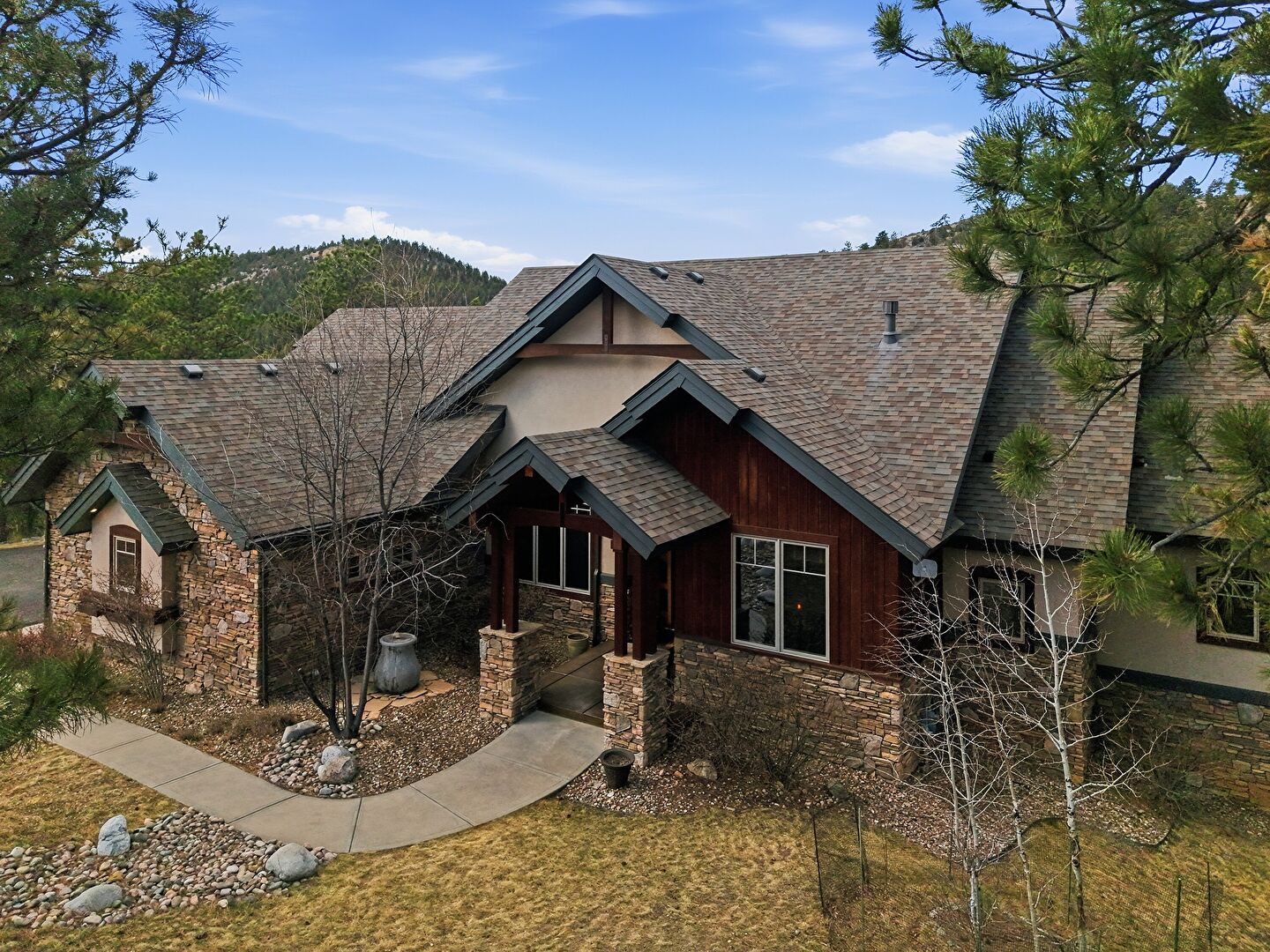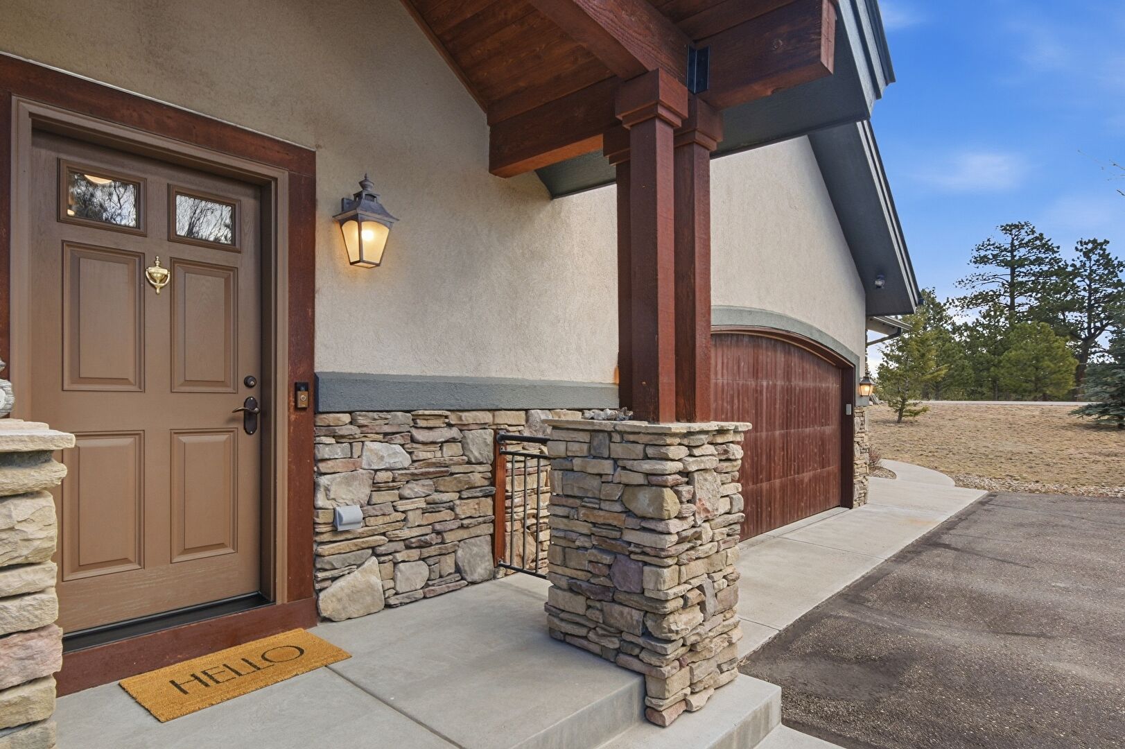 Driveway, Forest View, Lawn, Porch, Shingle Roof, Stone Siding, Stucco Siding, Vertical Siding, Lawn, Stucco Siding, Vertical Siding