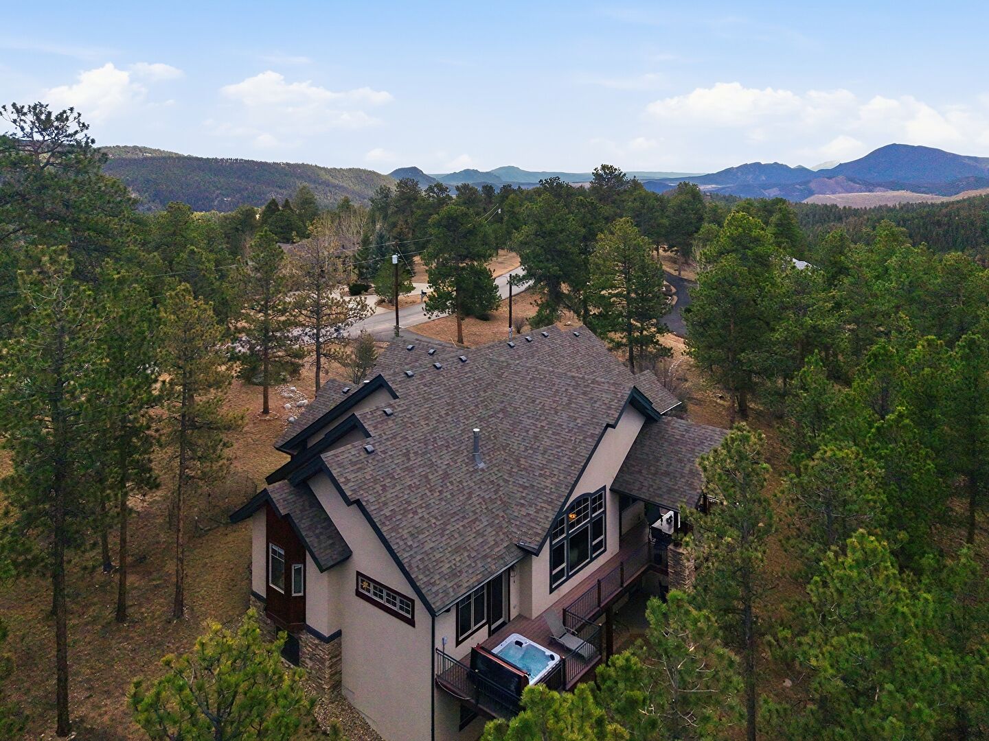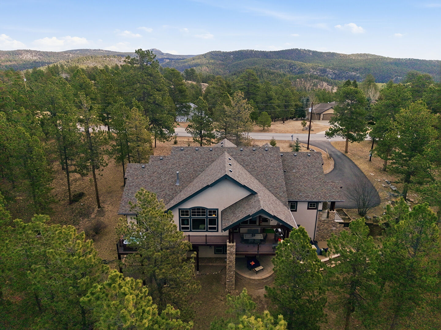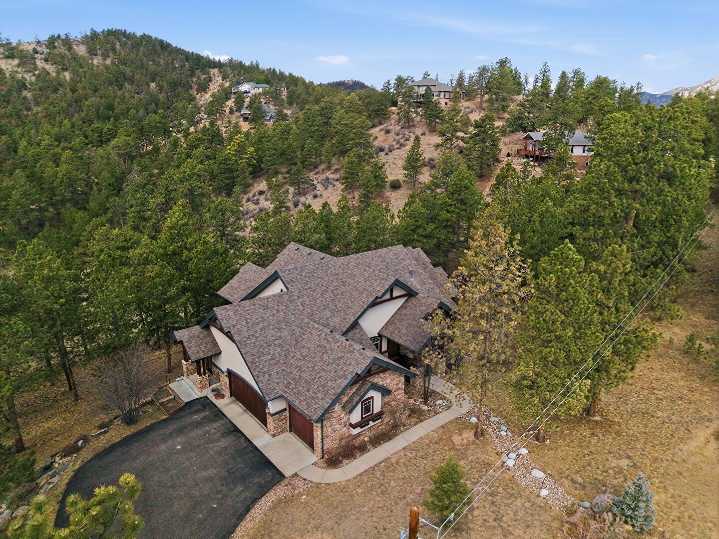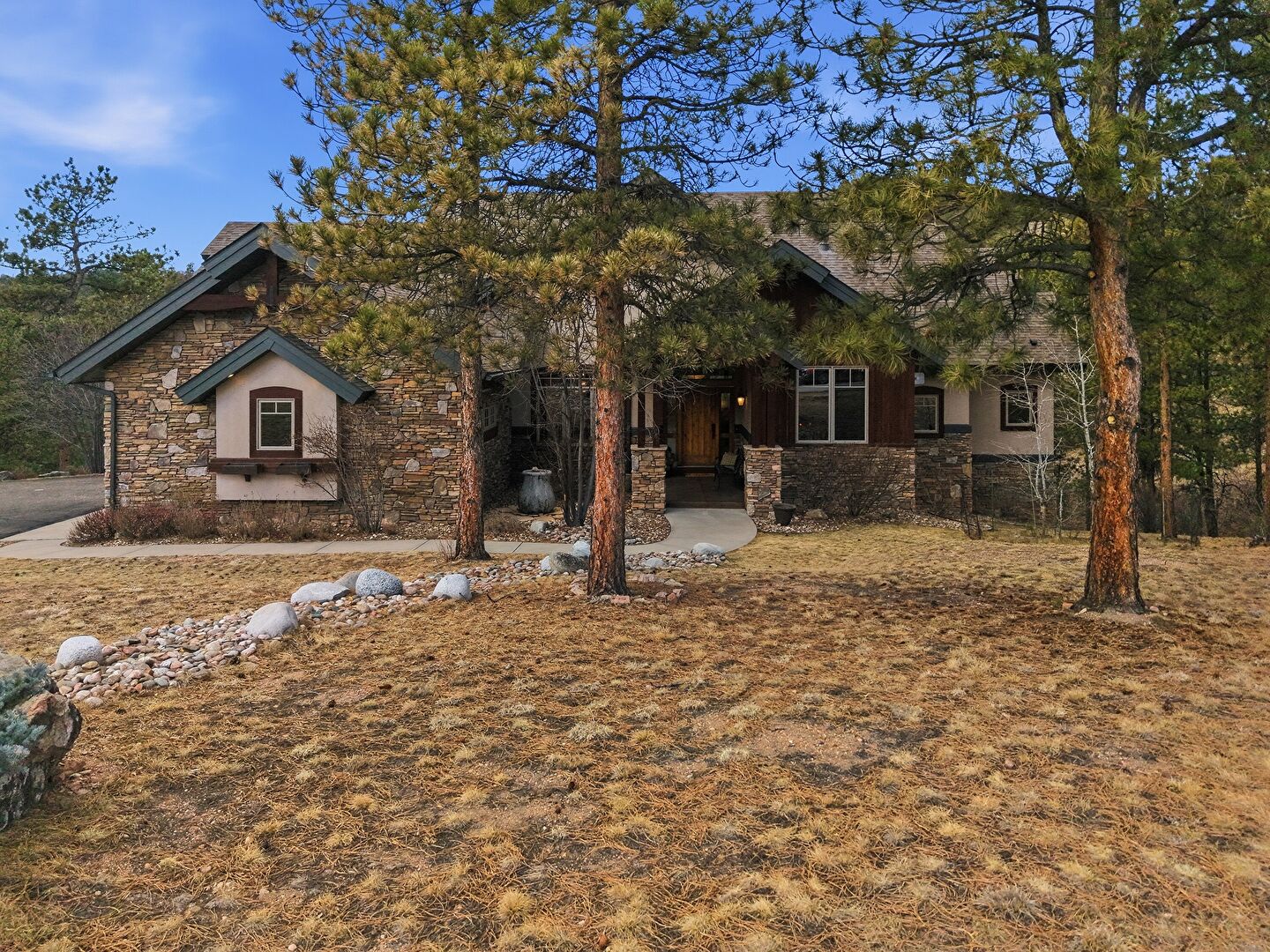 Driveway, Forest View, Lawn, Porch, Shingle Roof, Stone Siding, Stucco Siding, Vertical Siding, Lawn, Stucco Siding, Vertical Siding
