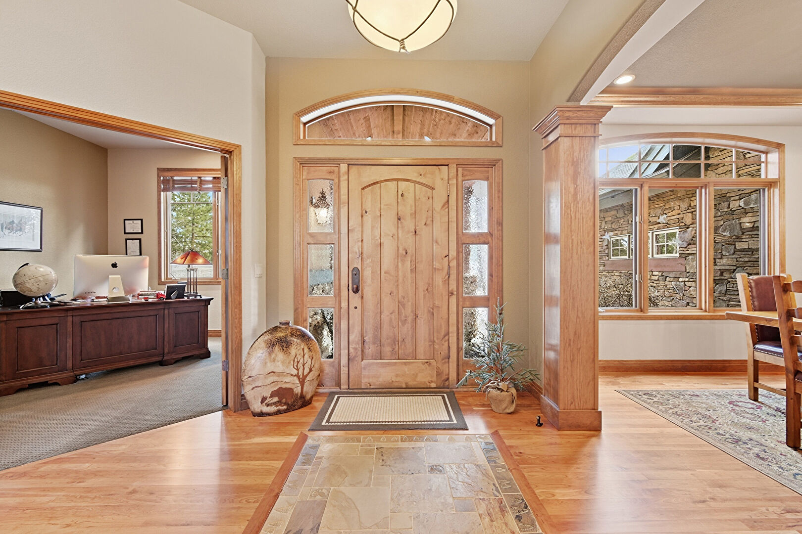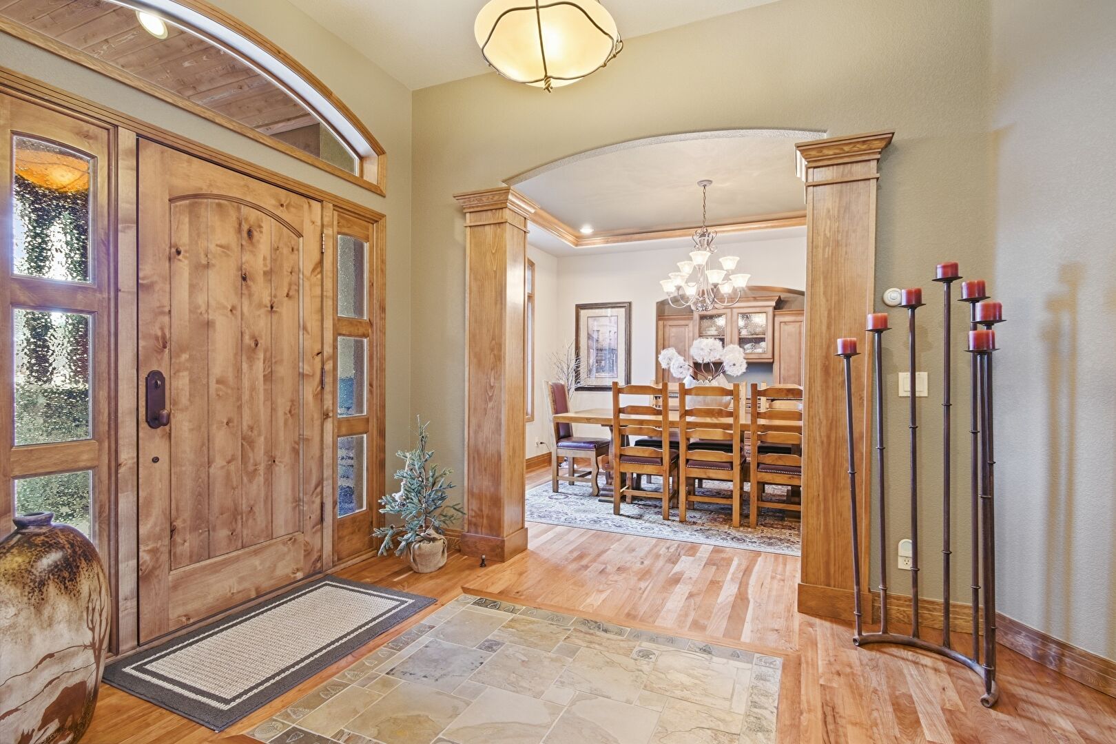 Arched Walkways, Baseboards Wall, Crown Molding, Decorative Columns, Drywall, Natural Light, Notable Chandelier, Recessed Lighting, Stone Finish Floor, Wood Finish Floor, Natural Light, Vaulted Ceiling