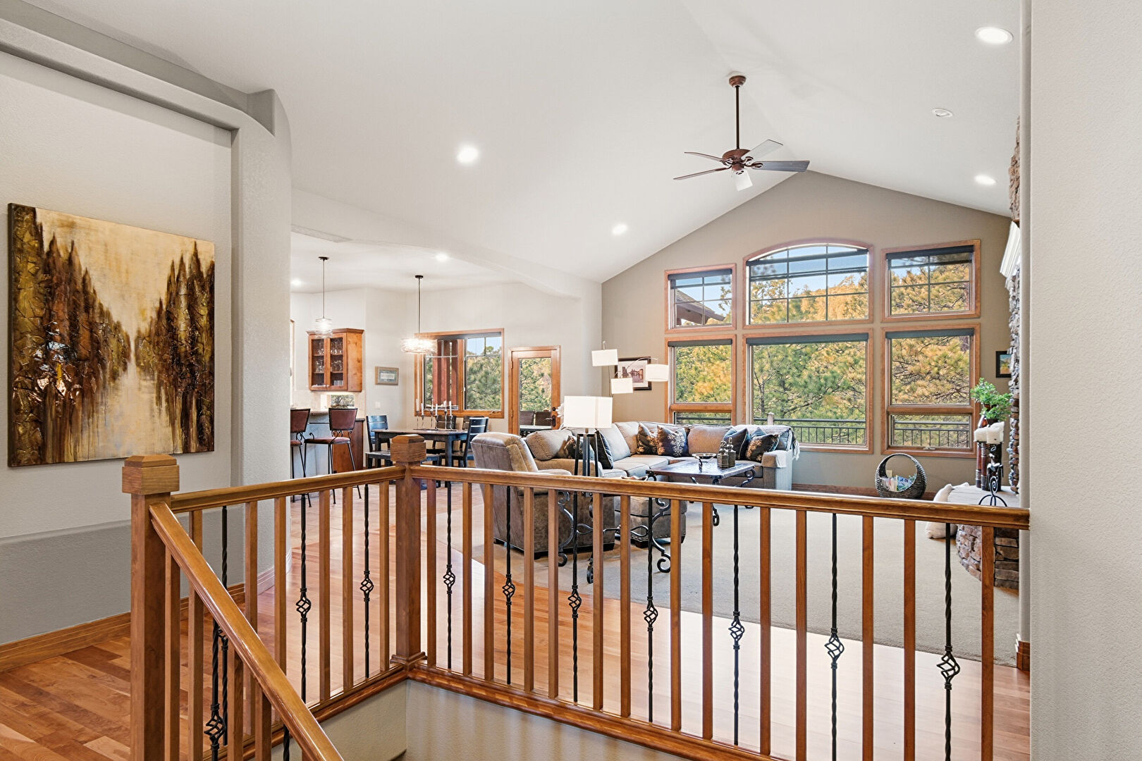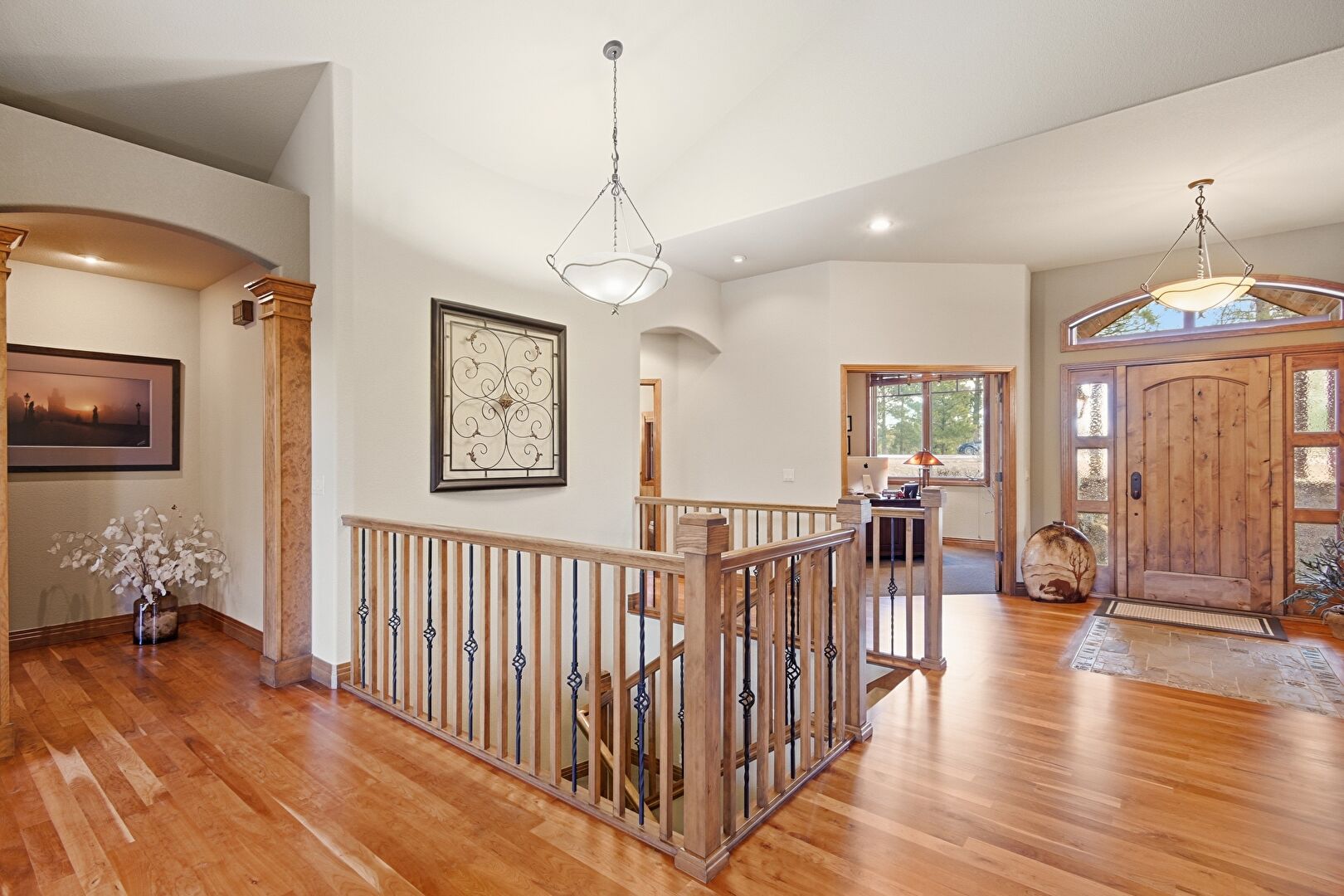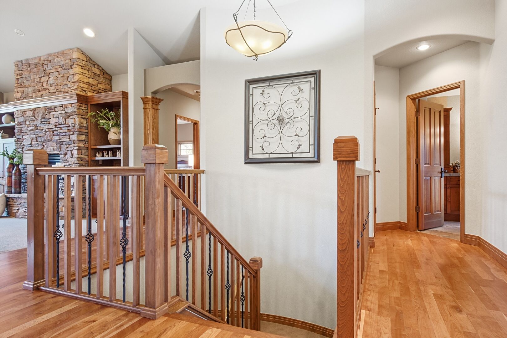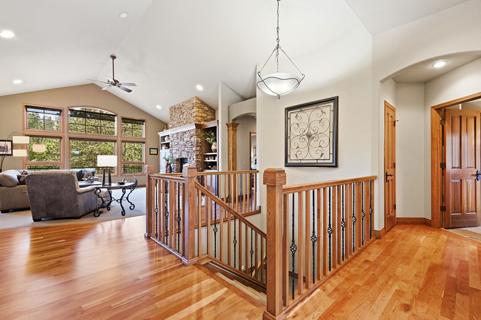Arched Walkways, Baseboards Wall, Cathedral Ceiling, Drywall, High Ceiling, Natural Light, Recessed Lighting, Upstairs Landing, Vaulted Ceiling, Wood Finish Floor, Baseboards Wall, Wood Finish Floor