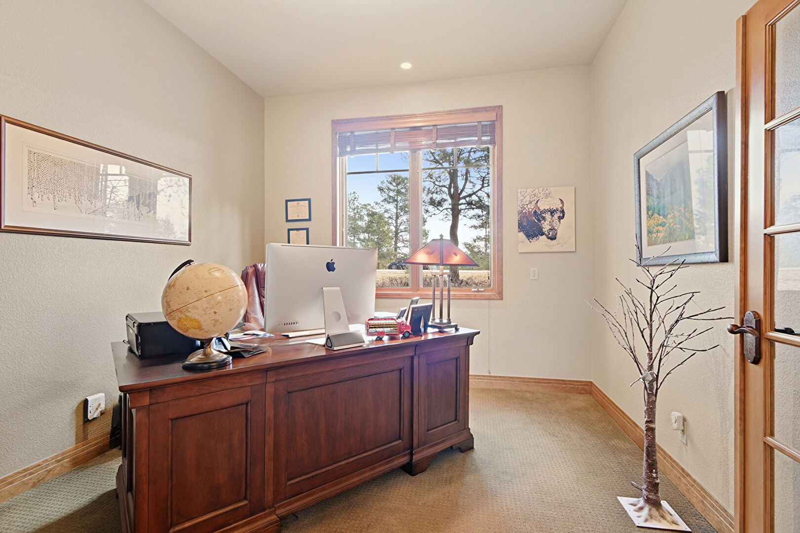 Baseboards Wall, Carpet, French Doors, Natural Light, Recessed Lighting, Textured Wall, Office Area