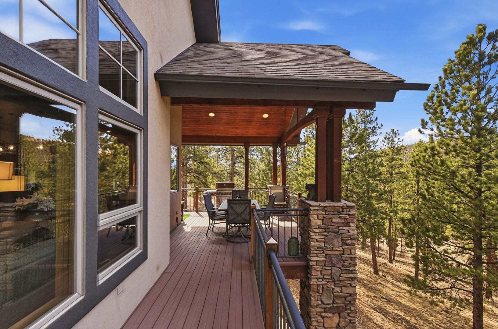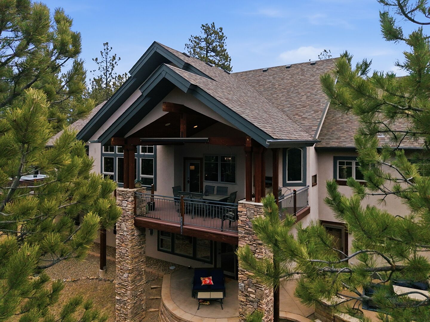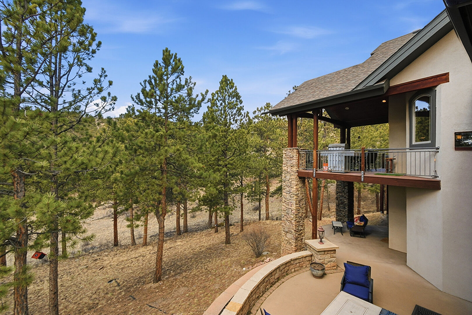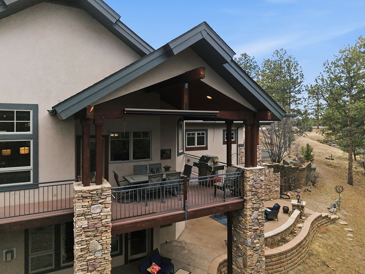 Balcony, Downspout, Grill, Outdoor Living Space, Patio, Stone Siding, Stucco Siding, Vertical Siding, Patio, Shingle Roof
