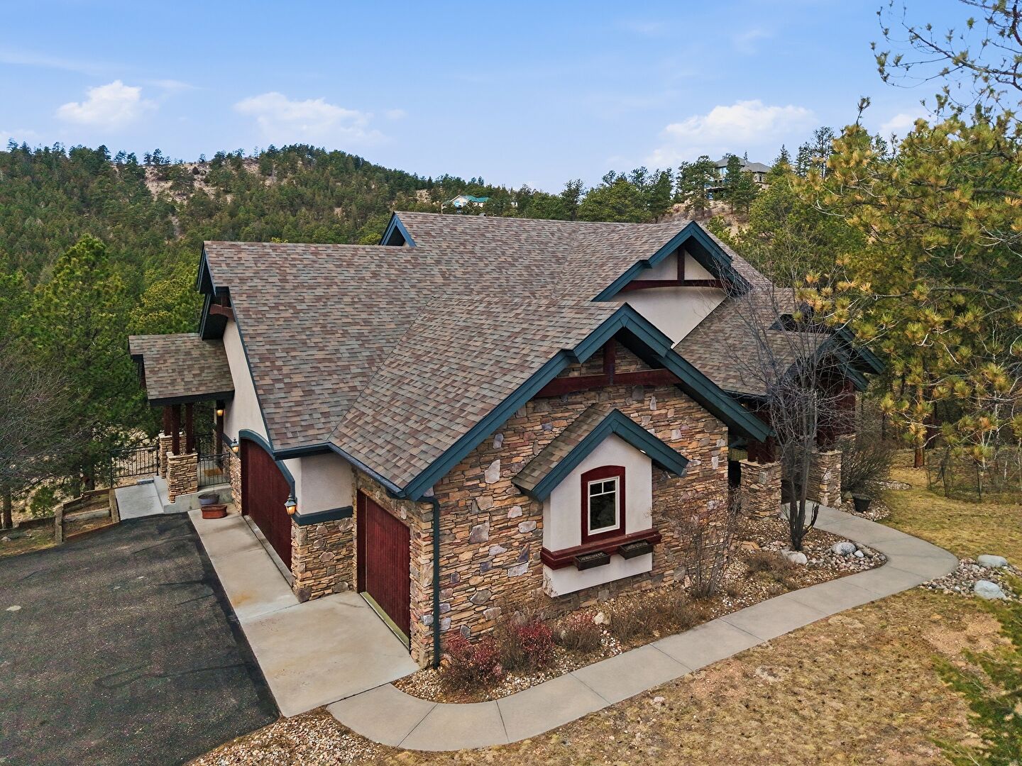 Downspout, Gutters, Shingle Roof, Stone Siding, Stucco Siding, Driveway