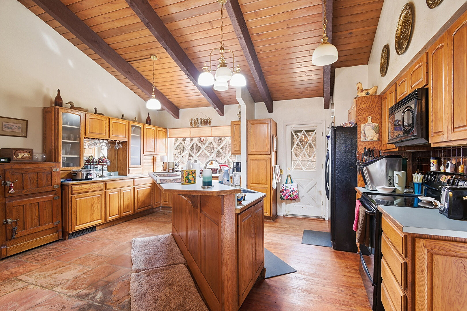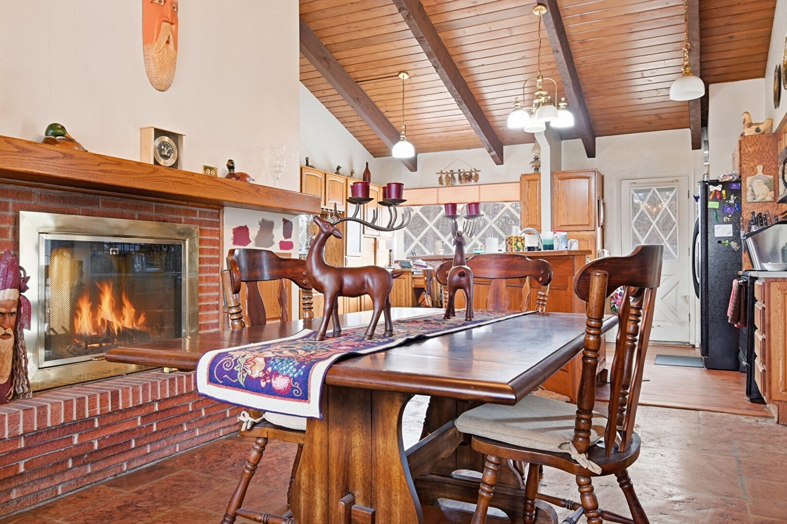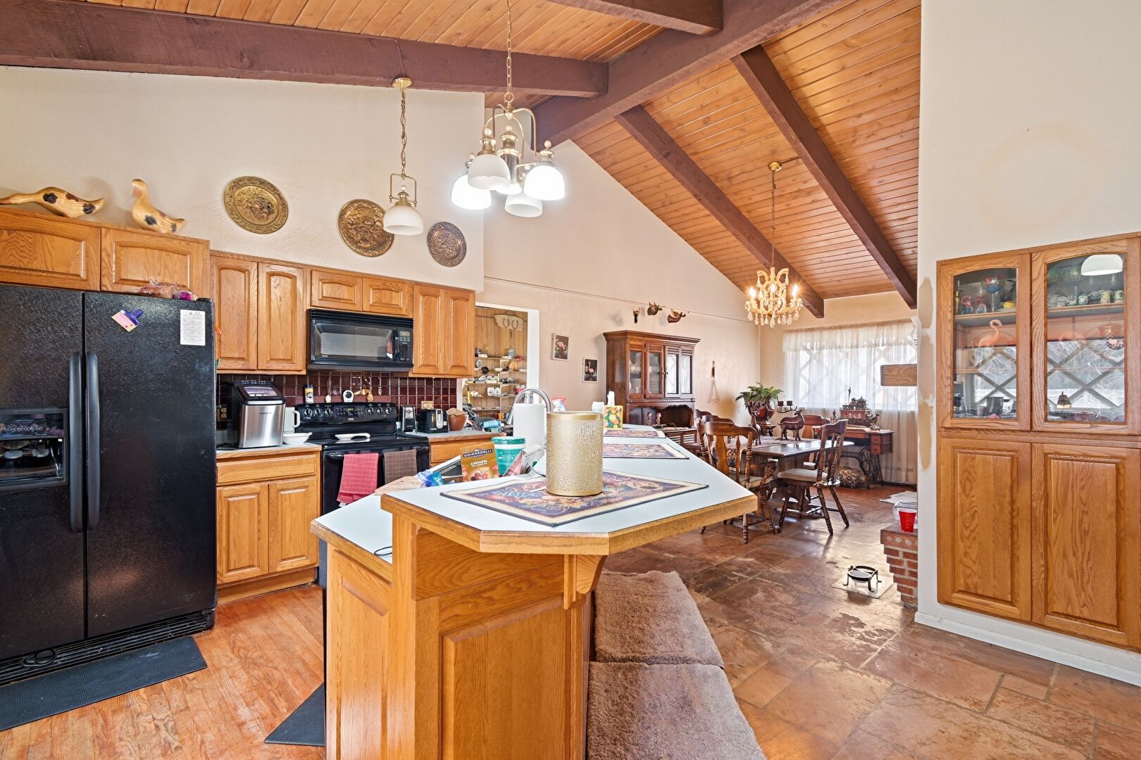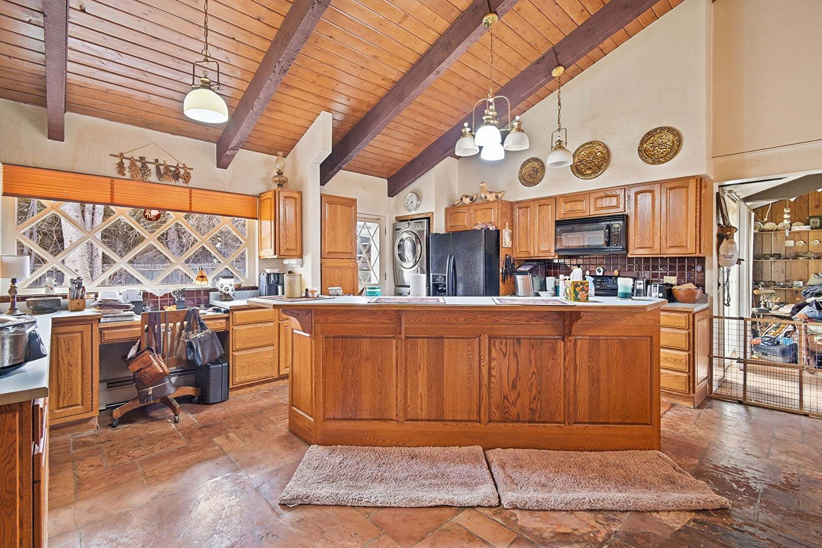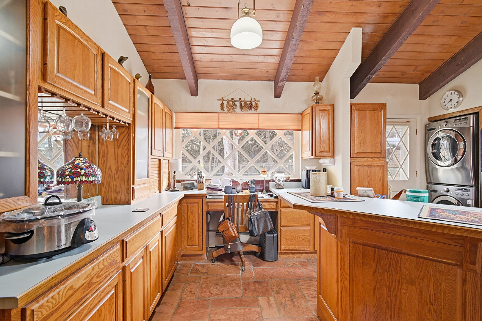 Arched Cabinets, Baseboard Radiator, Beamed Ceiling, Cathedral Ceiling, Drywall, Glass Insert Cabinets, High Ceiling, Kitchen Bar, Kitchen Island, Laundry, Medium Brown Cabinets, Natural Light, Notable Chandelier, Office Area, Pendant Lighting, Raised Cabinets, Stone Finish Floor, U Shaped Kitchen, Vaulted Ceiling, Wood Ceiling, Arched Cabinets, Beamed Ceiling, Kitchen Bar, Medium Brown Cabinets