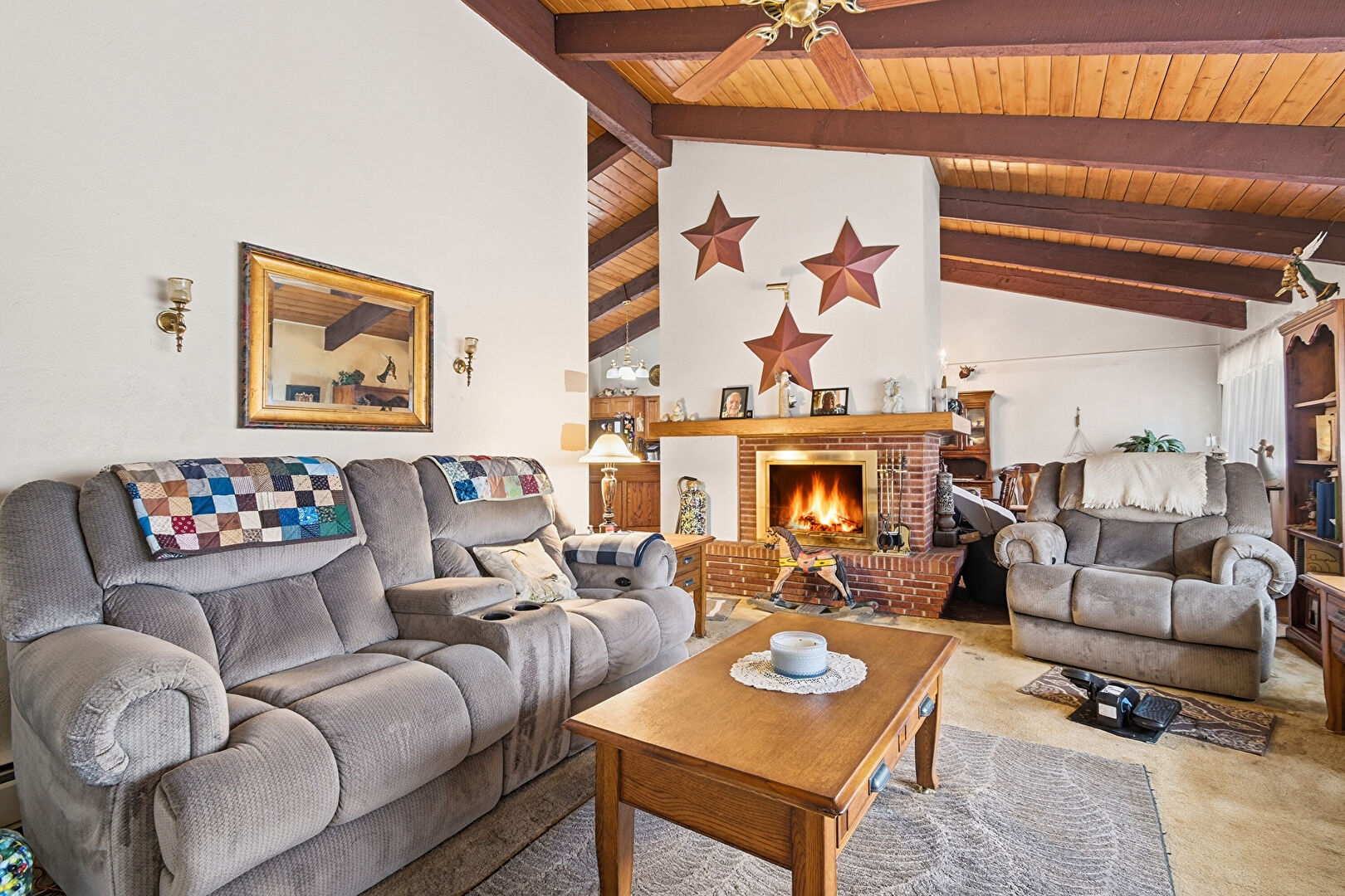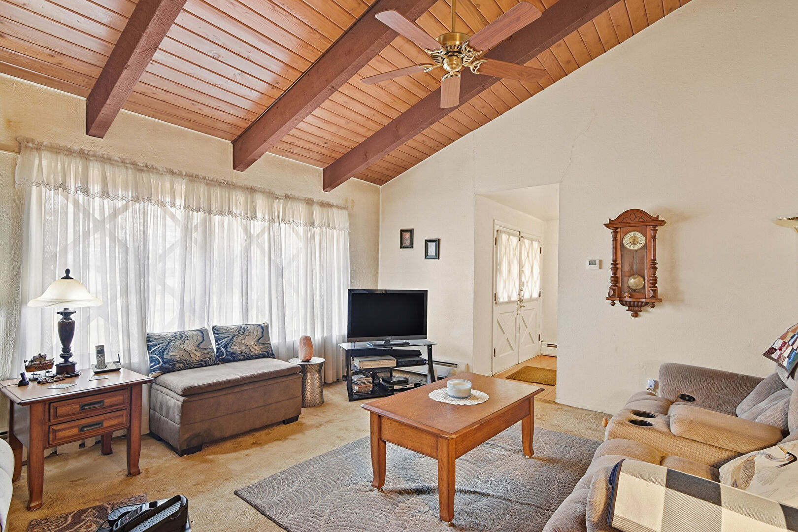 Baseboard Radiator, Beamed Ceiling, Carpet, Cathedral Ceiling, Ceiling Fan, Drywall, High Ceiling, Natural Light, Vaulted Ceiling, Wood Ceiling, Ceiling Fan, Fireplace