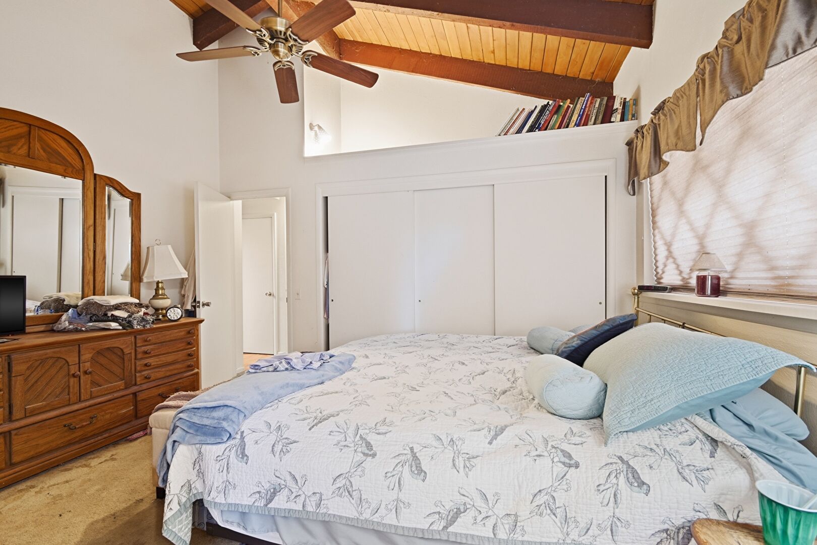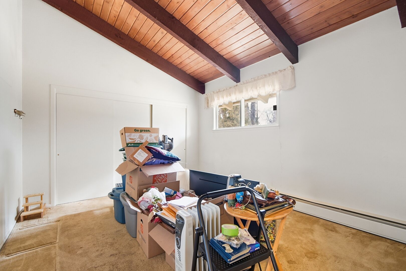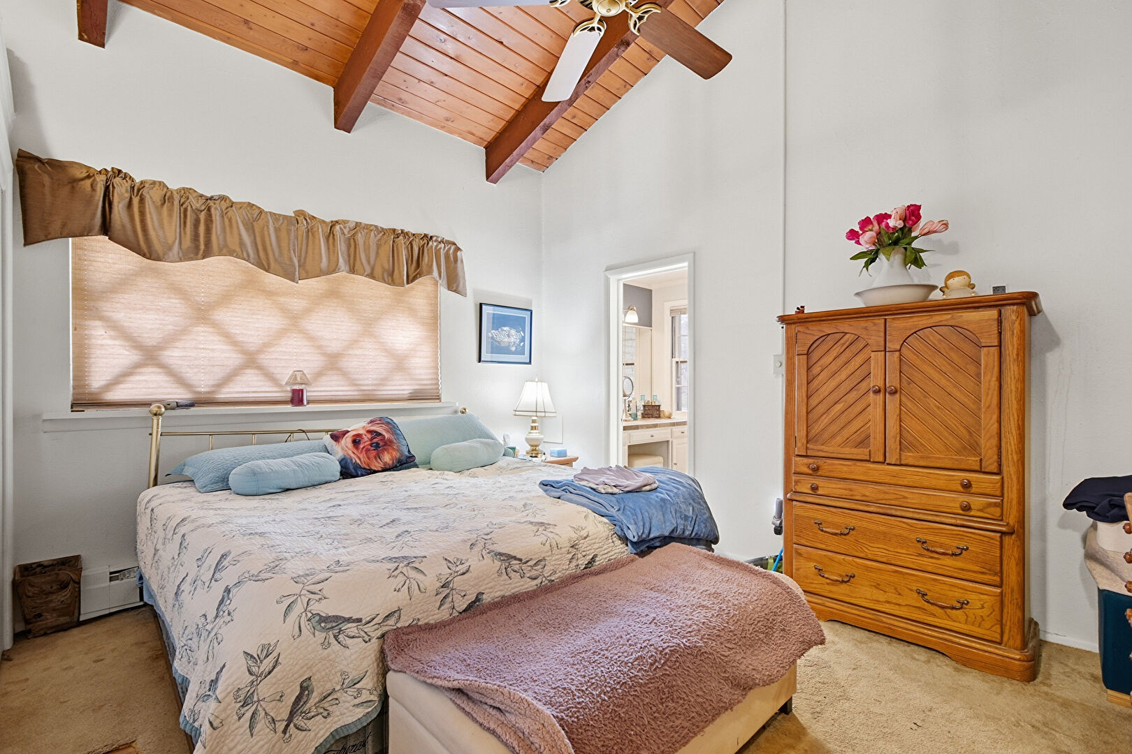 Baseboard Radiator, Beamed Ceiling, Carpet, Ceiling Fan, Closet, Drywall, High Ceiling, Natural Light, Vaulted Ceiling, Wood Ceiling, Baseboard Radiator, Carpet, Ensuite Bathroom, Natural Light, Wood Ceiling