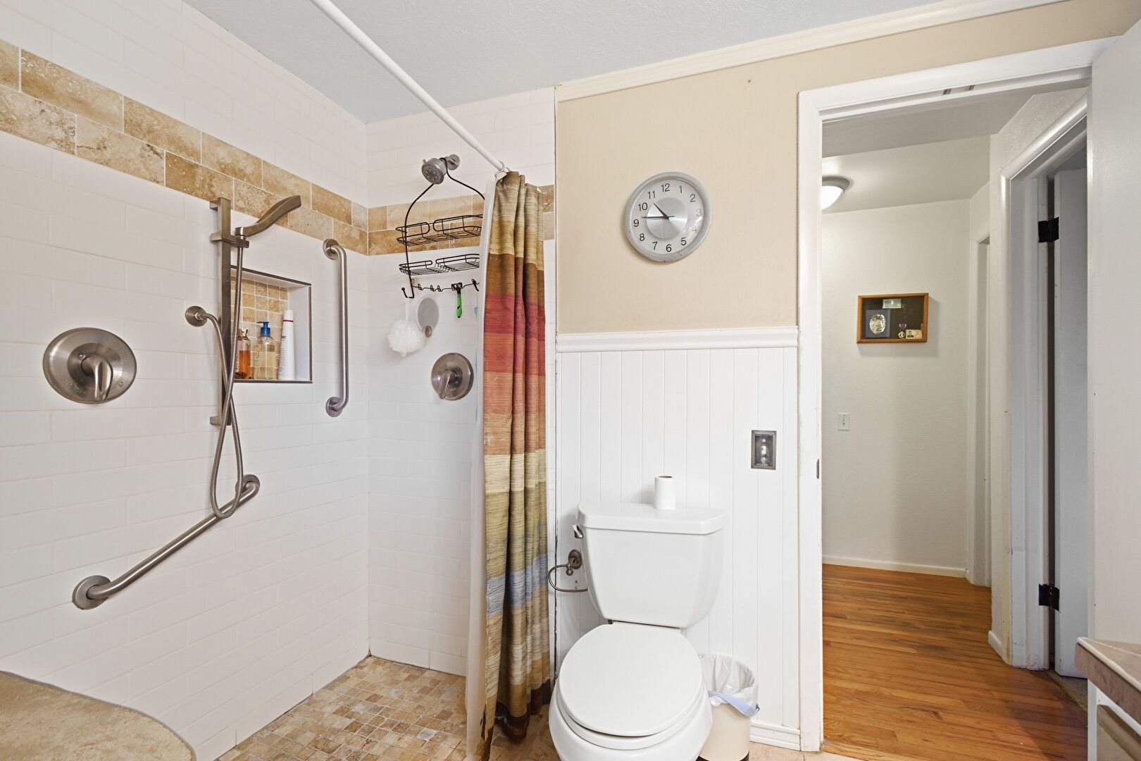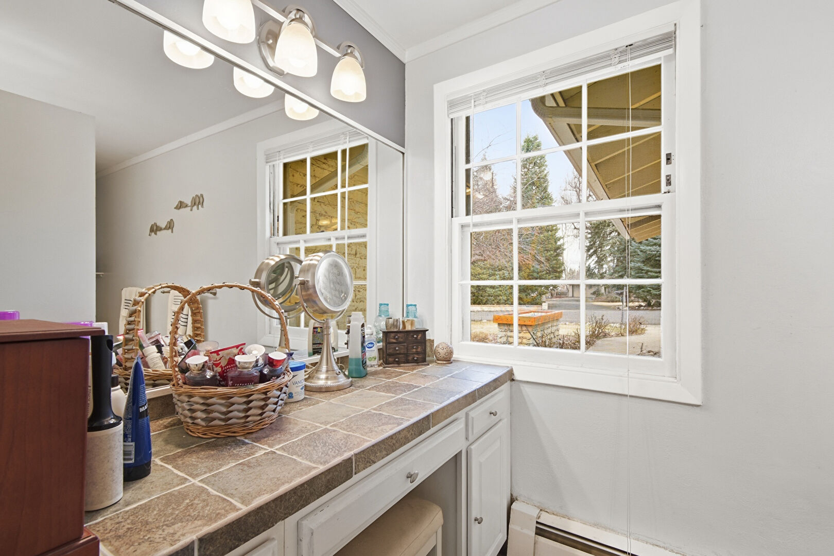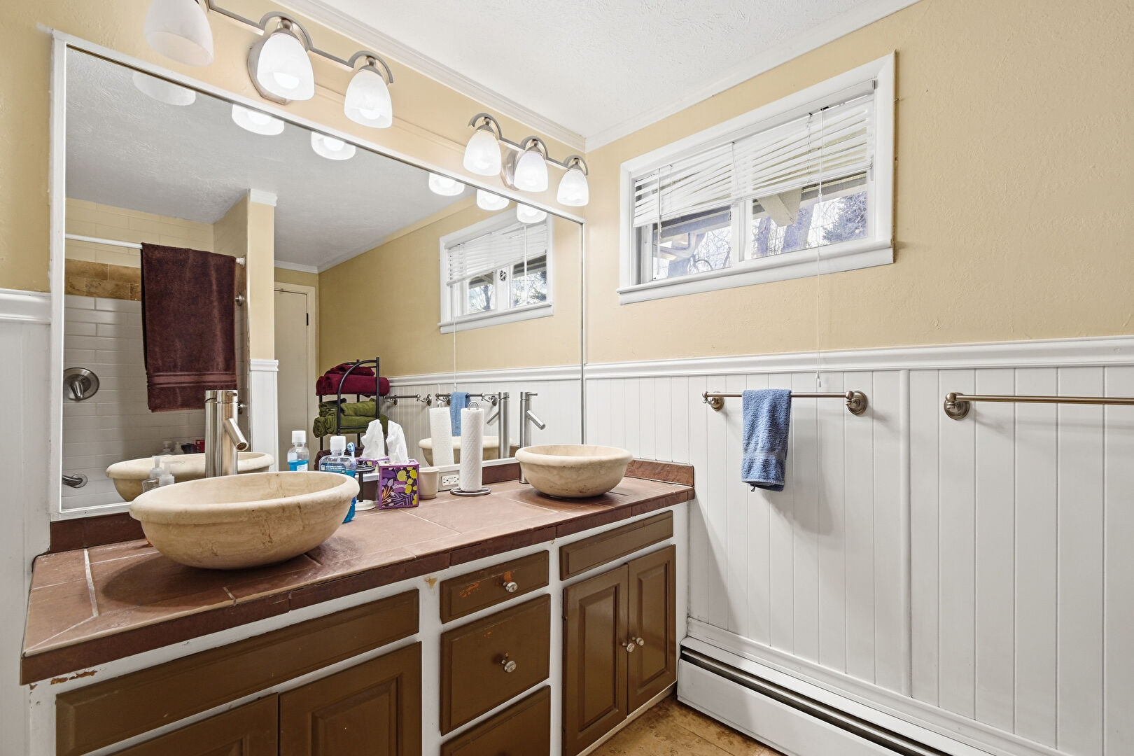Baseboard Radiator, Crown Molding, Double Vanity, Drywall, Full Bathroom, Natural Light, Vanity, Wainscot Wall, Drywall, Natural Light, Wood Finish Floor