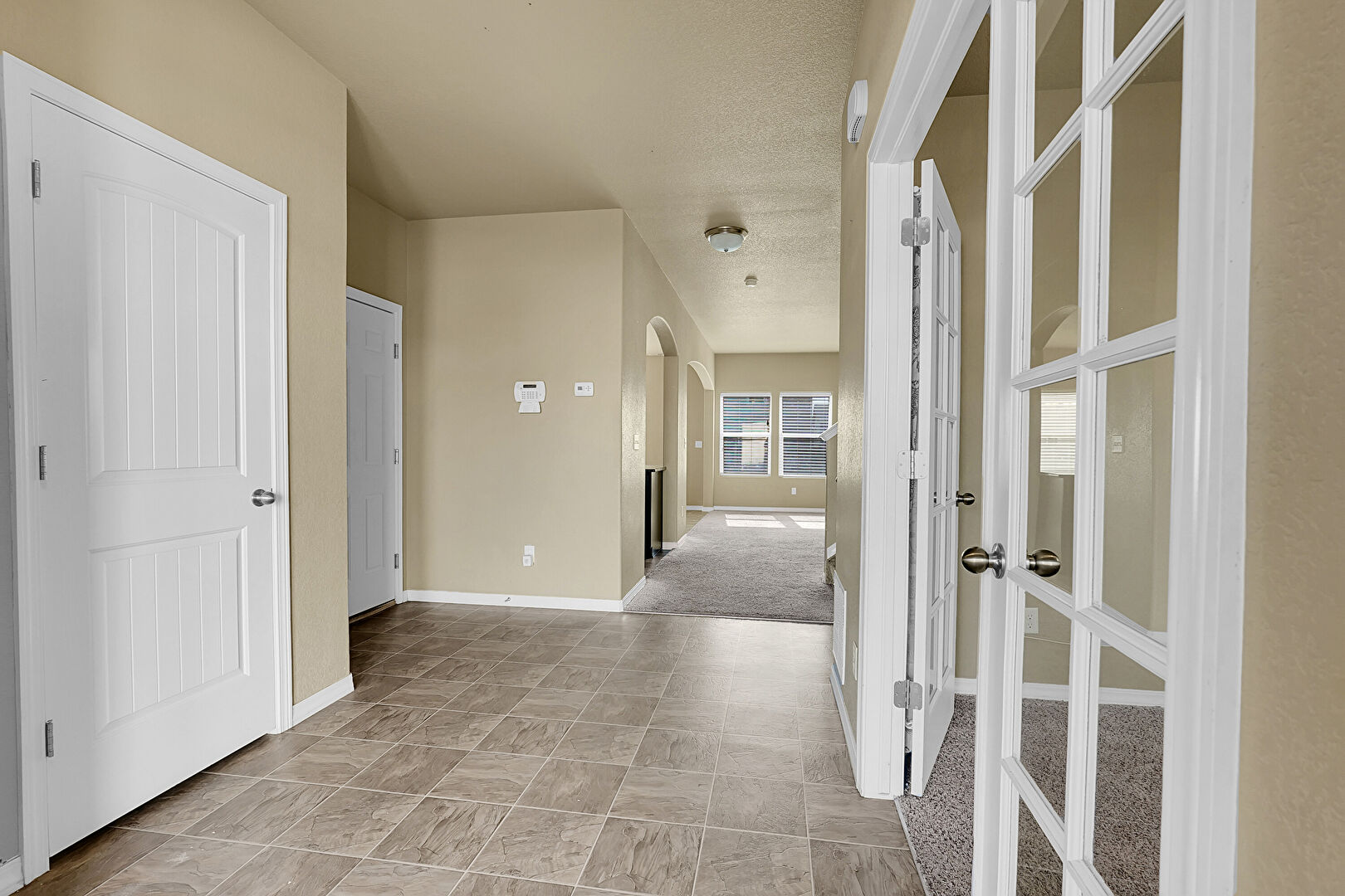Arched Walkways, Baseboards Wall, Carpet, Drywall, French Doors, Natural Light, Stone Finish Floor, Vent, Stone Finish Floor, Textured Ceiling