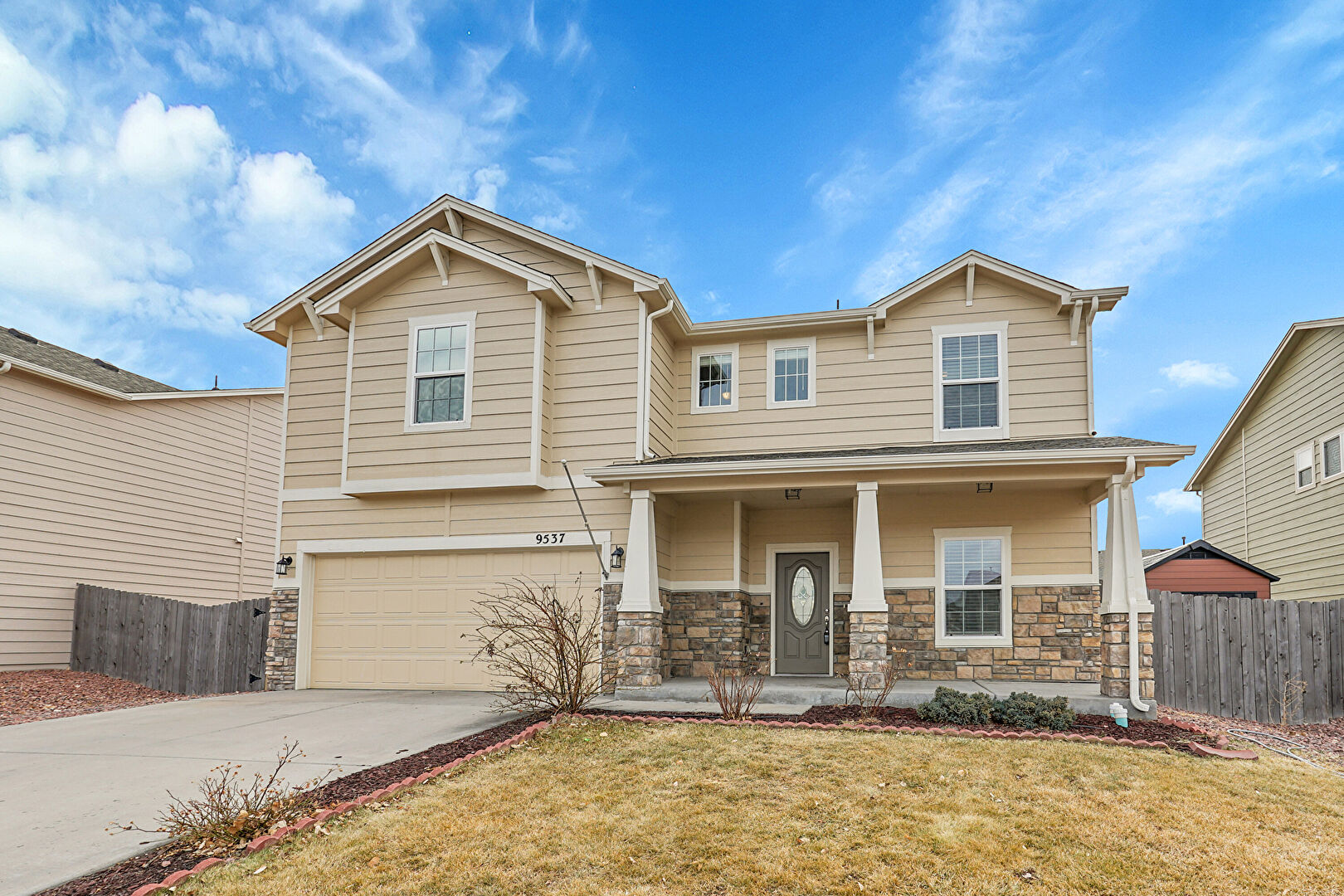 Built In Garage, Concrete Foundation, Downspout, Driveway, Fence, Gutters, Horizontal Siding, Lawn, Porch, Stone Siding, Built In Garage, Lawn, Stone Siding