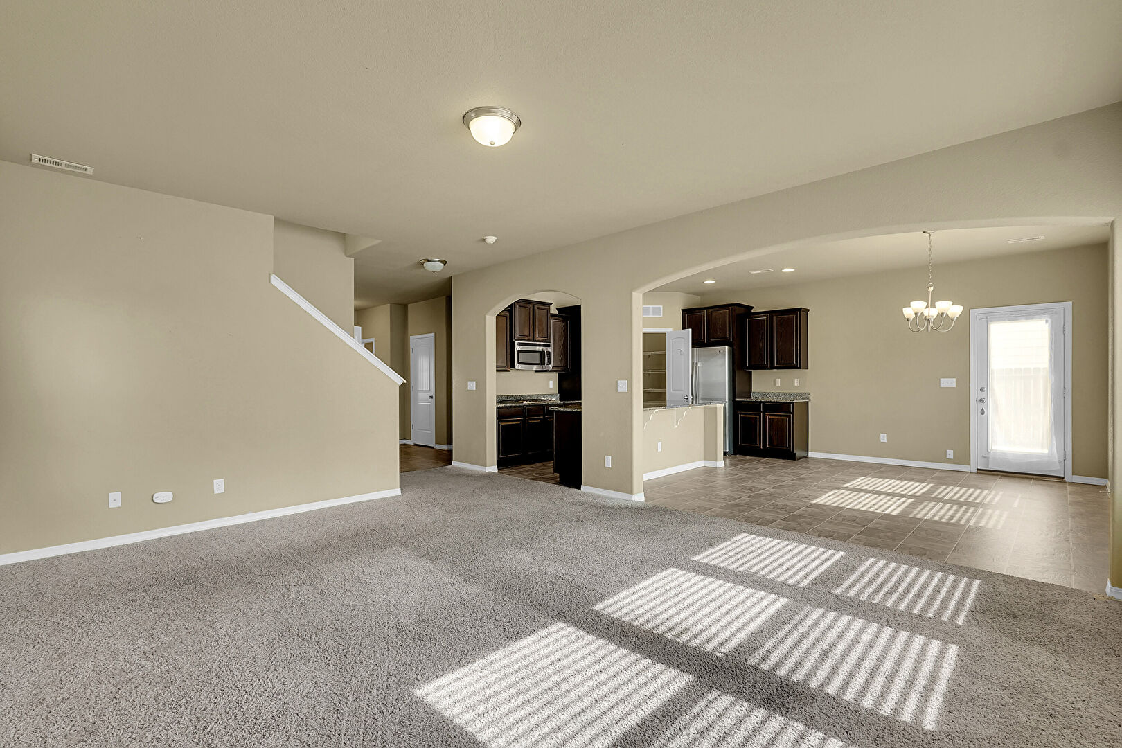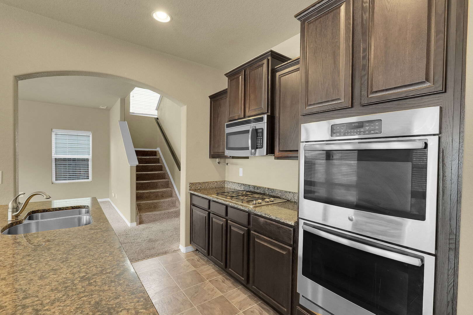 Baseboards Wall, Carpet, Drywall, L Shaped Kitchen, Natural Light, Notable Chandelier, Recessed Lighting, Stairs, Textured Ceiling, Tile Floor, Vent, Arched Walkways, Double Oven, Vent