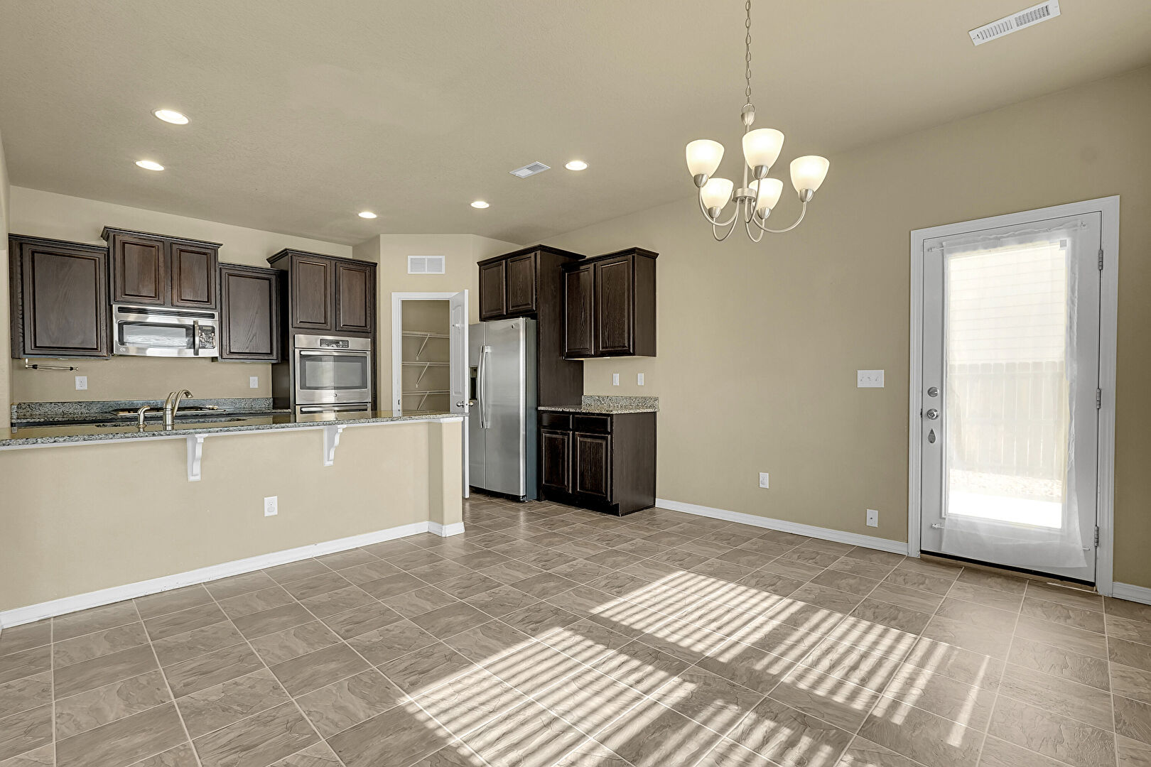 Arched Walkways, Baseboards Wall, Crown Molding Cabinets, Dark Brown Cabinets, Double Oven, Drywall, Kitchen Bar, Natural Light, Notable Chandelier, Pendant Lighting, Raised Cabinets, Recessed Lighting, Stone Countertops, Stone Finish Floor, Vent, Notable Chandelier, Pendant Lighting, Stairs