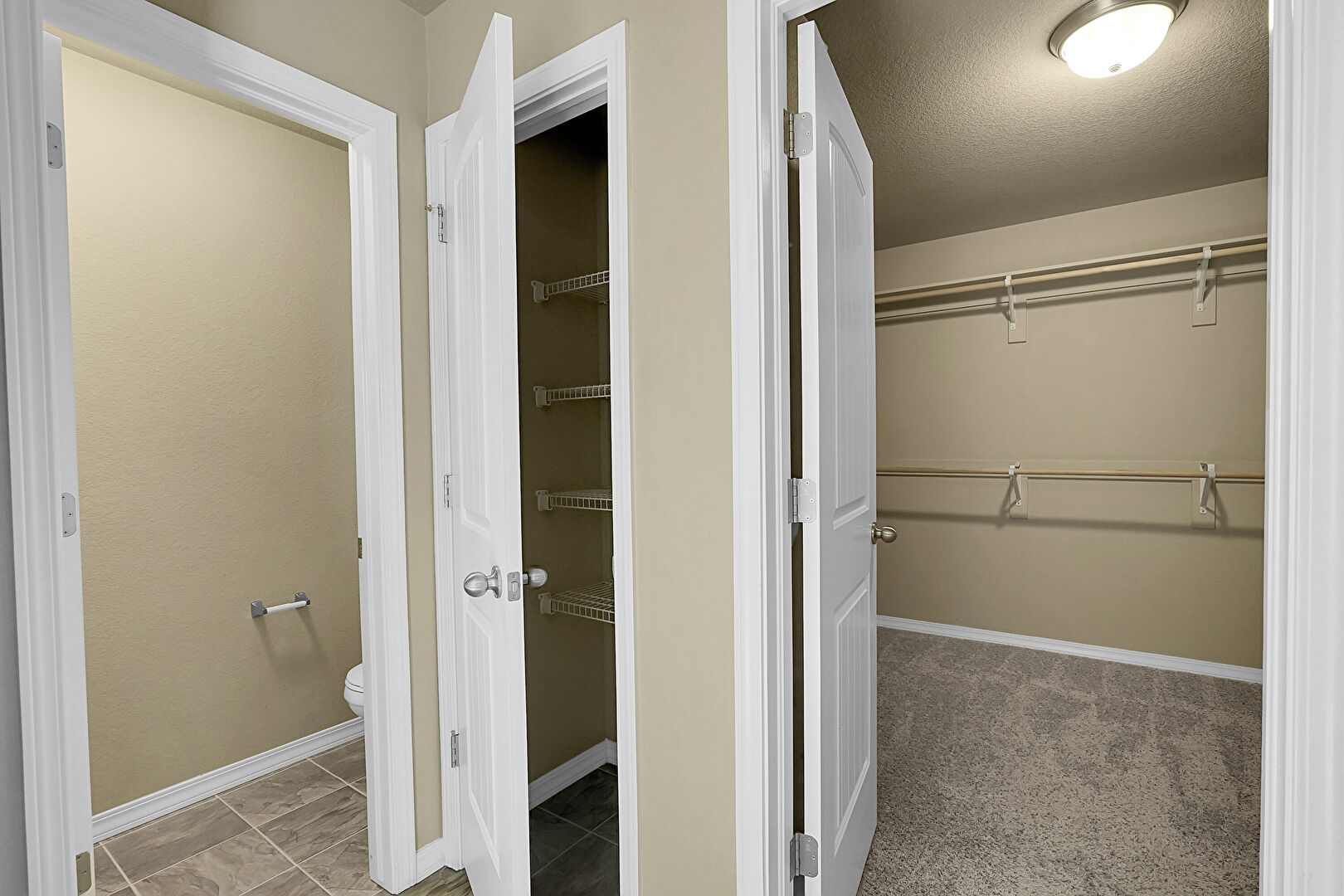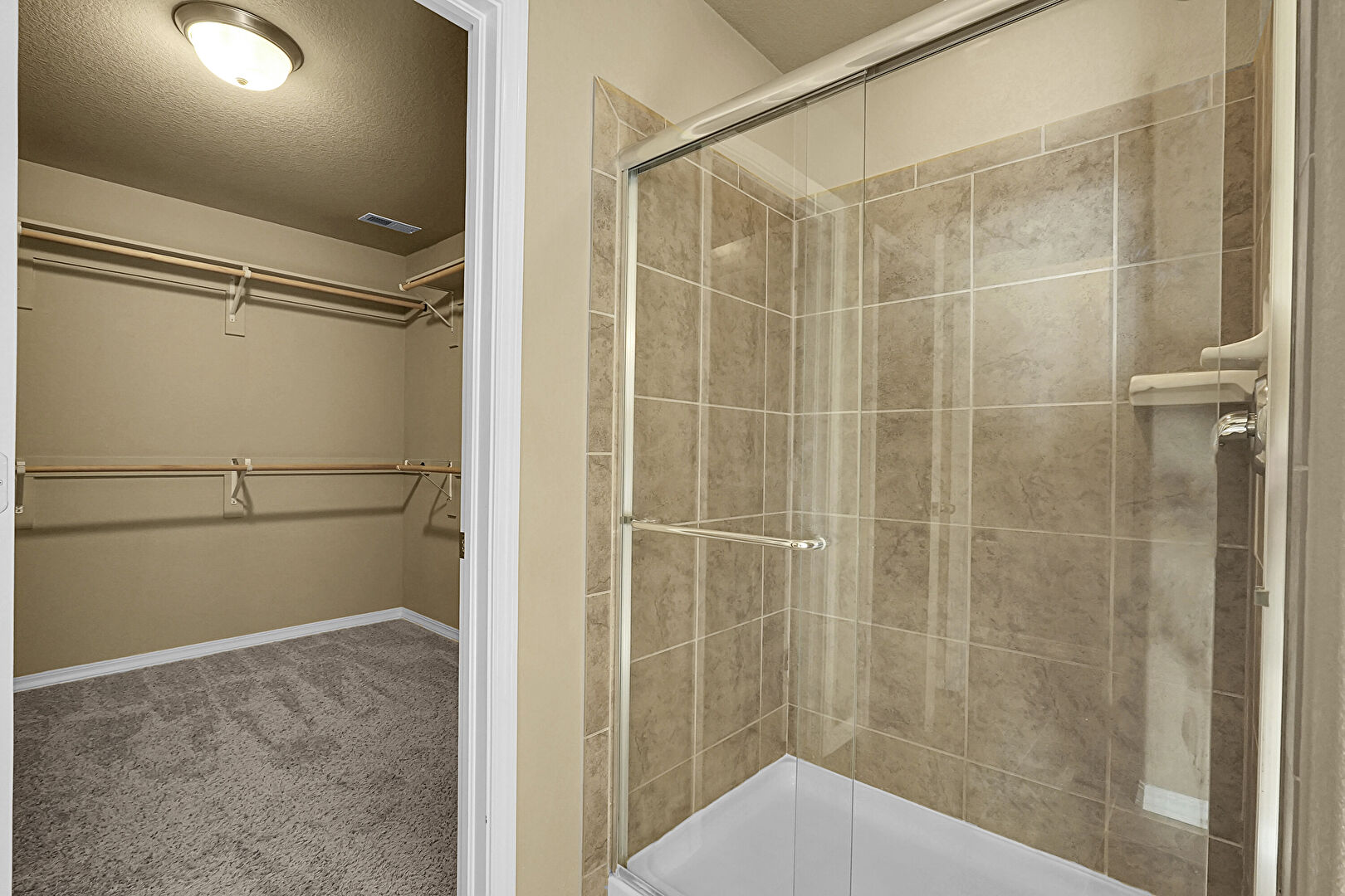 Baseboards Wall, Carpet, Double Vanity, Drywall, Full Bathroom, Natural Light, Textured Ceiling, Textured Wall, Vent, Walk In Closet, Carpet, Tile Floor, Walk In Closet